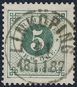 Sweden. Facit 43b used, 5 öre dark green, clean distinct print. EXCELLENT cancellation LINKÖPING 21.11.1887. Signed by O.P.