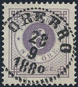 Sweden. Facit 44a used, 6 öre bluish lilac. Superb cancellation ÖREBRO 28.9.1889.