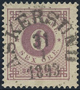 Sweden. Facit 44b used, 6 öre red-lilac. EXCELLENT cancellation ASKERSUND 31.1.1893.