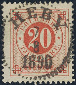 Sweden. Facit 46d used, 20 öre dark orange-red on yellowish paper. EXCELLENT cancellation HEBY 7.8.1890. One short perf.