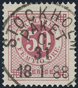 Sweden. Facit 48b used, 50 öre carmine, even print. EXCELLENT cancellation STOCKHOLM PAKET C 31.1.1888.