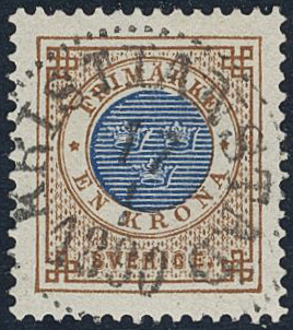 Sweden. Facit 49a used, 1 Krona orange-brown/blue. Superb cancellation KRISTIANSTAD 17.1.1890.