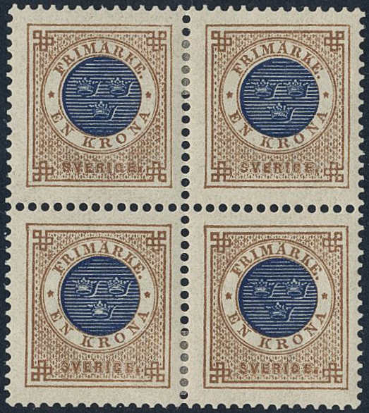 Sweden. Facit 49d ★, 1 Krona brown/dark blue in block of four. Very fine–superb. SEK 4500