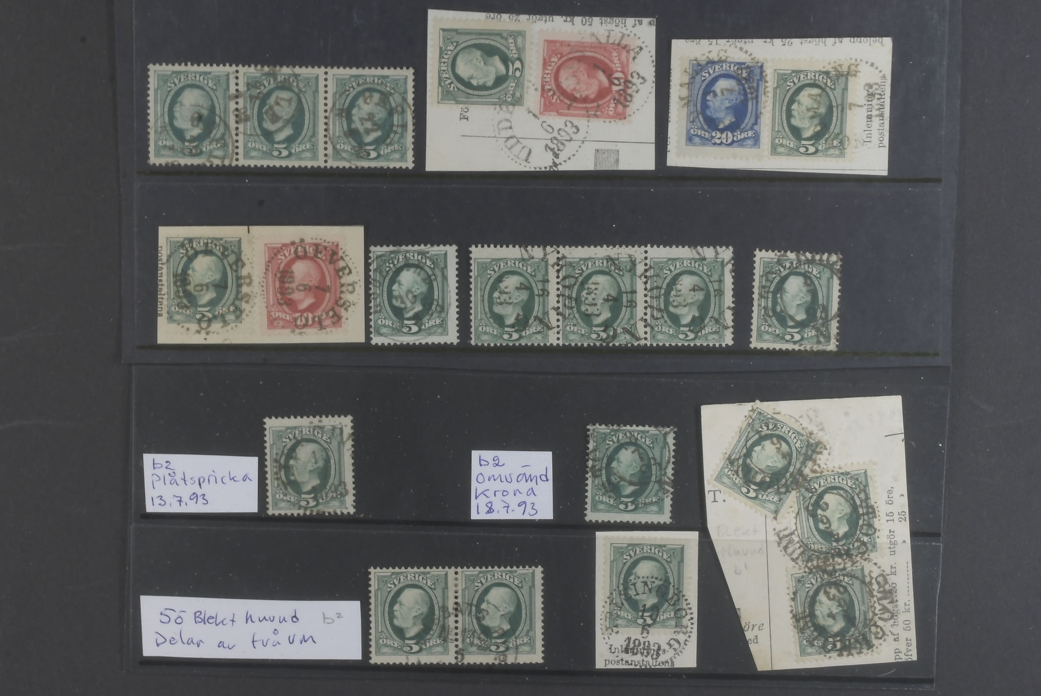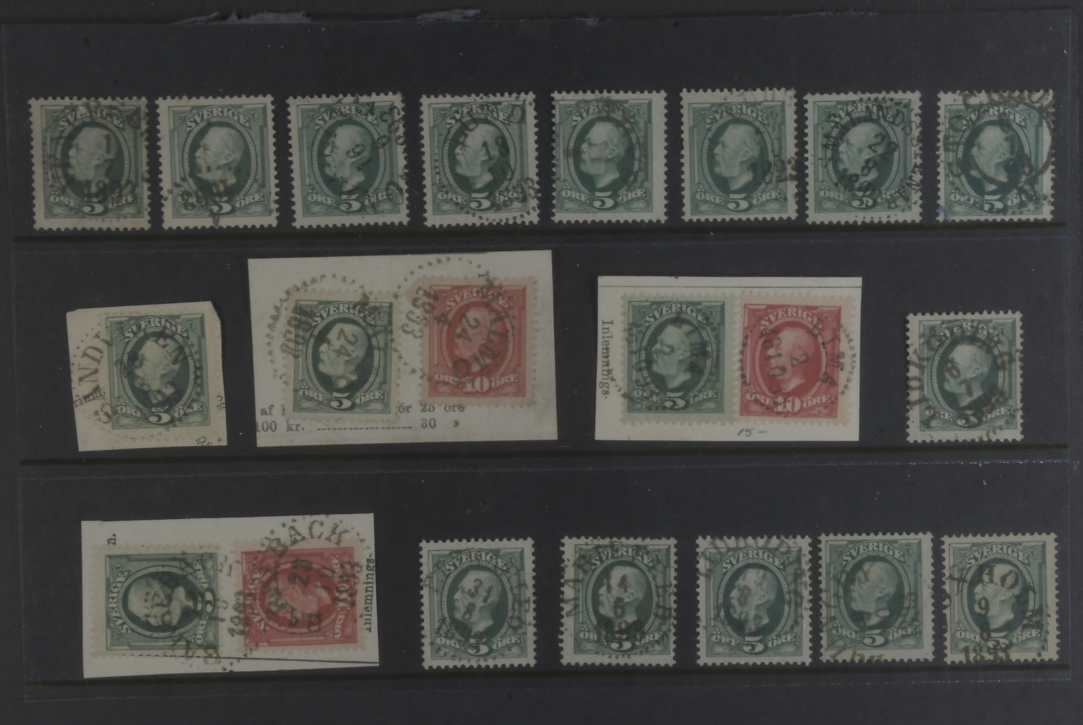 Sweden. Facit 52b used, 1892 Oscar II 5 öre deep green, pale head. Ca. 40 stamp 5–20 öre, incl. 5 öre deep green, pale head with two crowns, inverted crown.