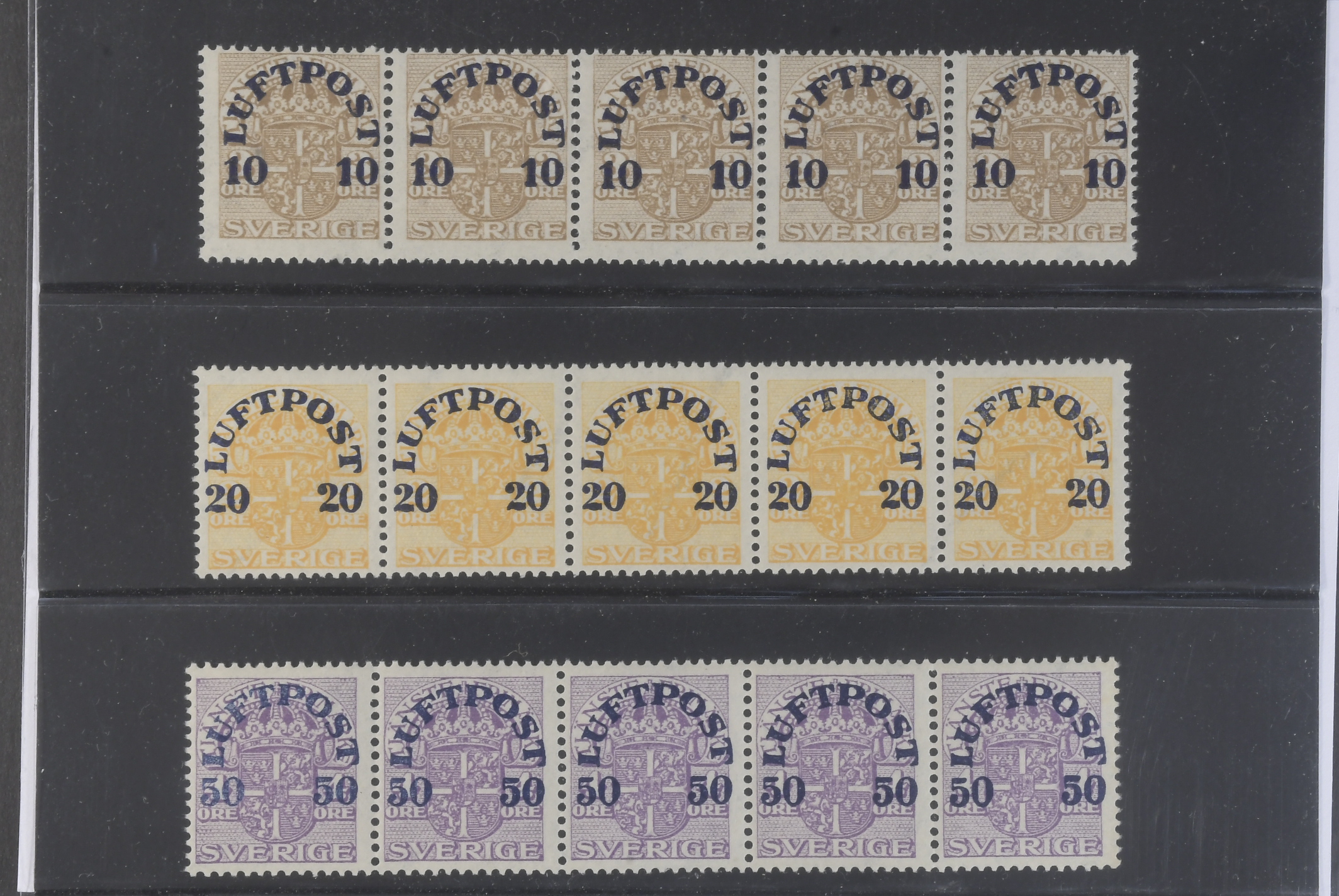 Sweden. Facit 136–38 ★★, 1920 Air Mail Surcharge. Three very fresh strips-of five. SEK 2500
