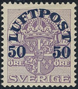 Sweden. Facit 138vm ★, 1920 Air Mail Surcharge 50 öre / 4 öre violet, wmk crown. Good centering. SEK 1500