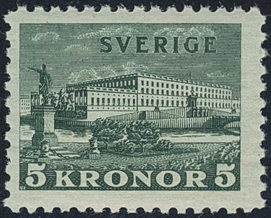 Sweden. Facit 233a ★★, 1931 The Royal Palace 5 Kr green, toned paper. Fair centering. SEK 2500