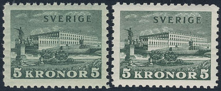 Sweden. Facit 233a, b ★★, 1931 The Royal Palace 5 Kr green, toned paper and white paper. Good centering. SEK 6100
