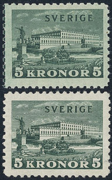 Sweden. Facit 233a, b ★★, 1931 The Royal Palace 5 Kr green, toned and white paper (2). SEK 6100