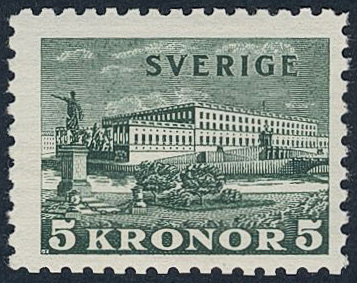 Sweden. Facit 233B ★★, 1939 The Royal Palace 5 Kr green, white paper. Fair centering. SEK 3600