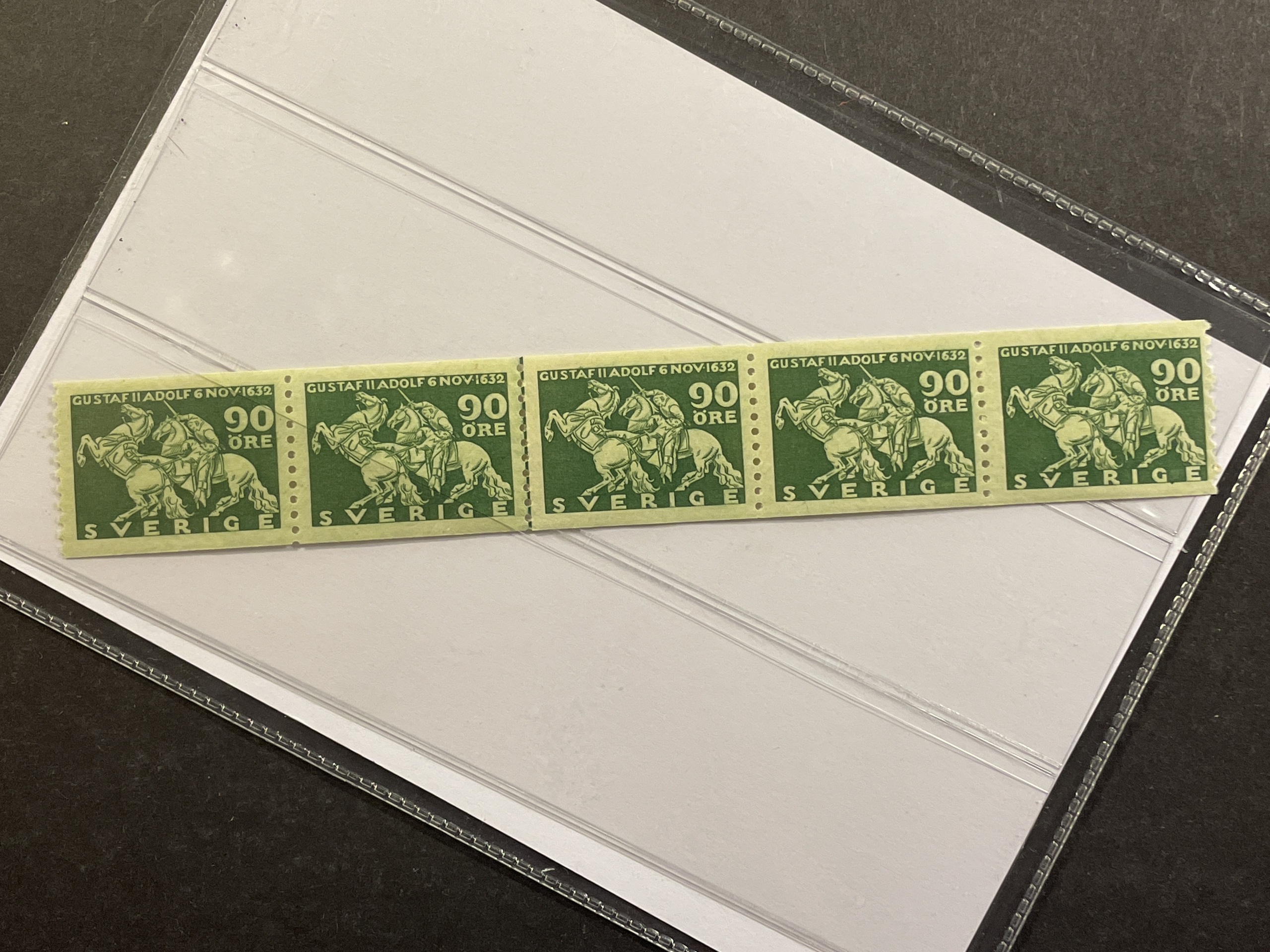 Sweden. Facit 237 ★★, 1932 Lützen 90 öre green. Strip of five. SEK 2250