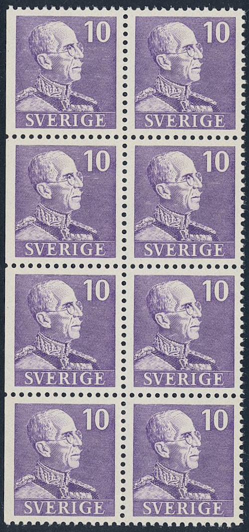 Sweden. Facit 269BC ★★, 1939 Gustaf V small numerals 10 öre violet, pair 3+4. Four pairs in block. SEK 4400