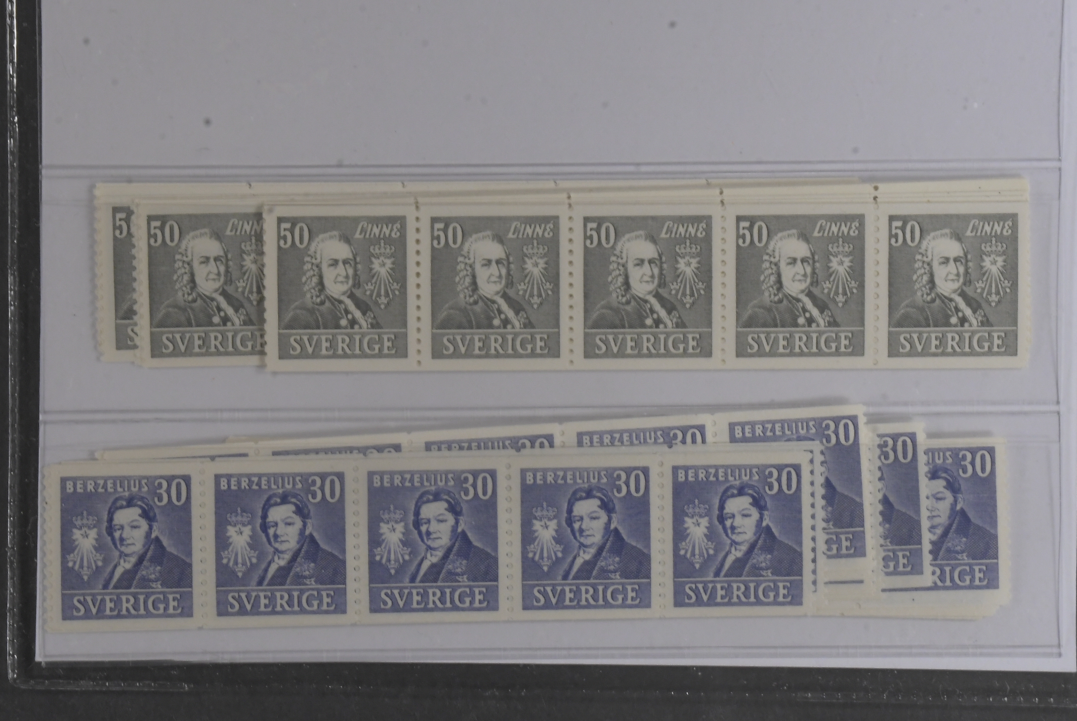Sweden. Facit 322 ★★, 1939 Royal Academy of Sciences 30 öre blue and 50 öre grey. 80 copies of each, all in strips of 5. SEK 43200