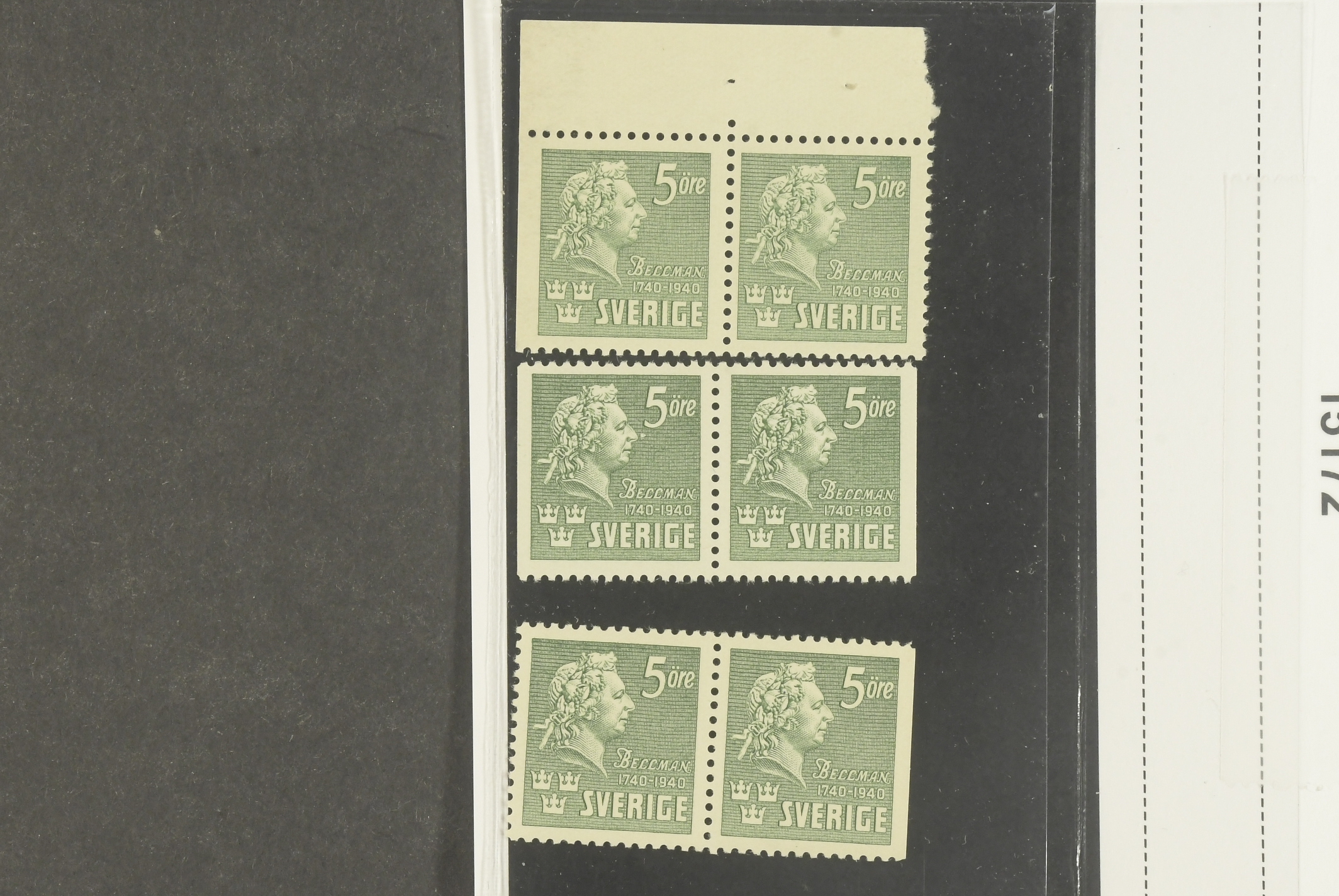 Sweden. Facit 324BC/CB/BB ★★, 1940 Carl Michael Bellman 5 öre green, pair 3+4 and 4+3 and BB (3). SEK 1800