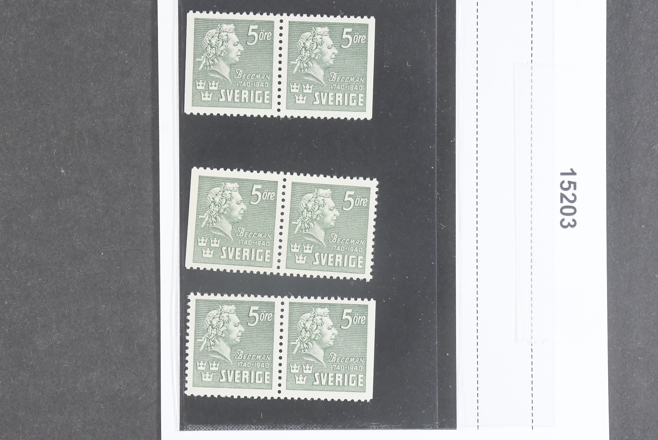 Sweden. Facit 324BC/CB/BB ★★, 1940 Carl Michael Bellman 5 öre green, pair 3+4 and 4+3 and 3+3 pairs (3). SEK 1820