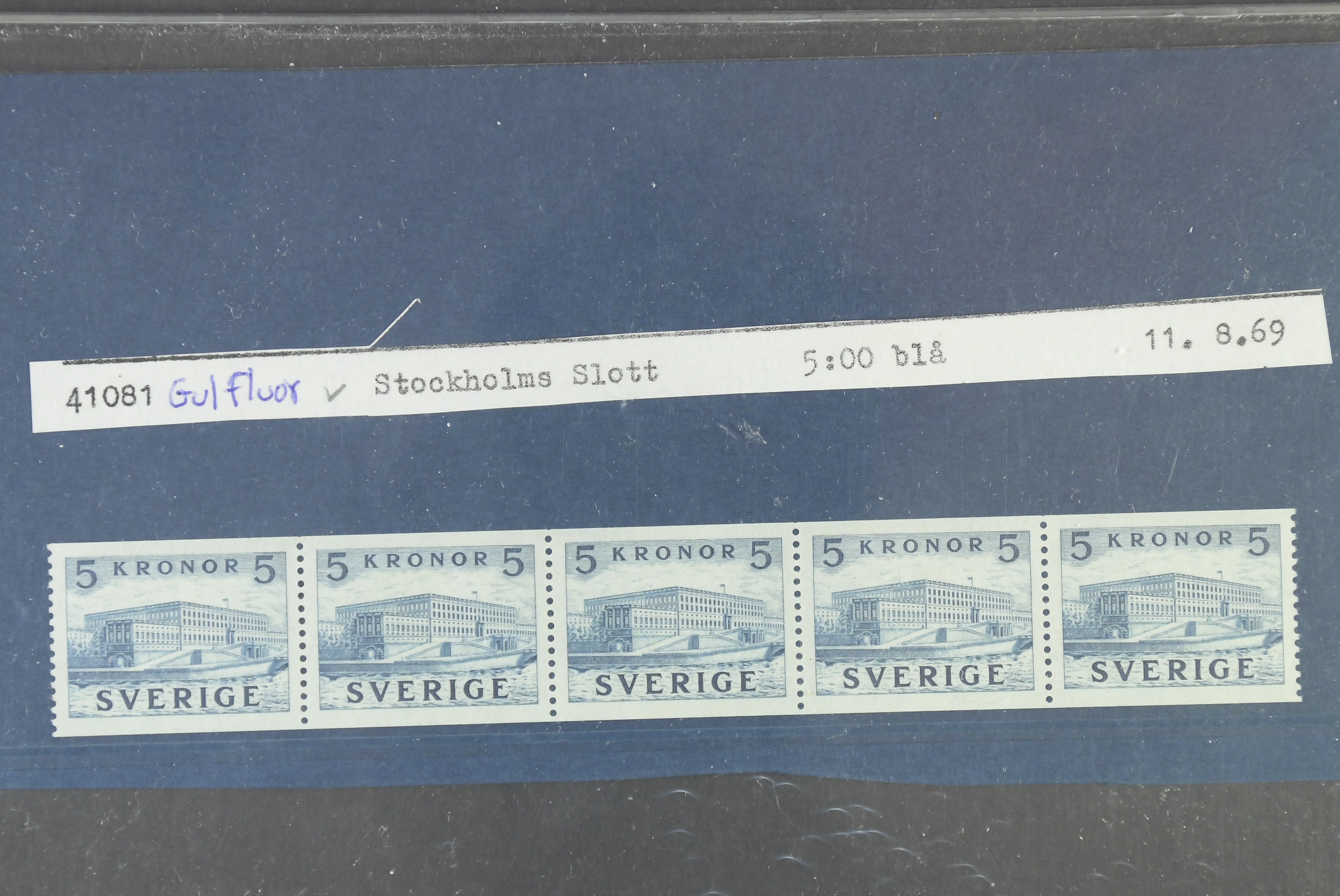 Sweden. Facit 332Av1 ★★, 1958 The Royal Castle 5 kr blue in superb strip-of five with yellow fluor paper. SEK 10000