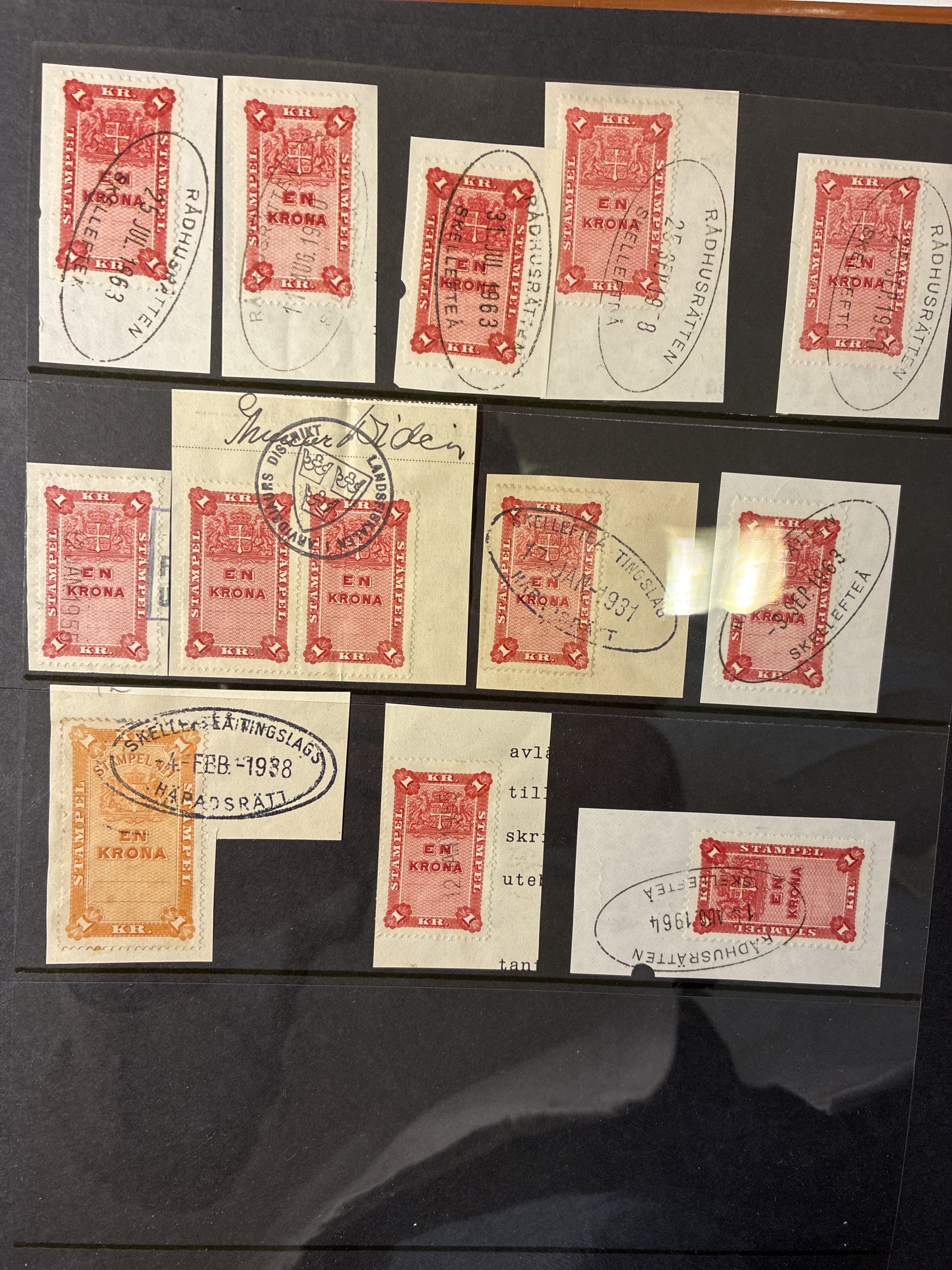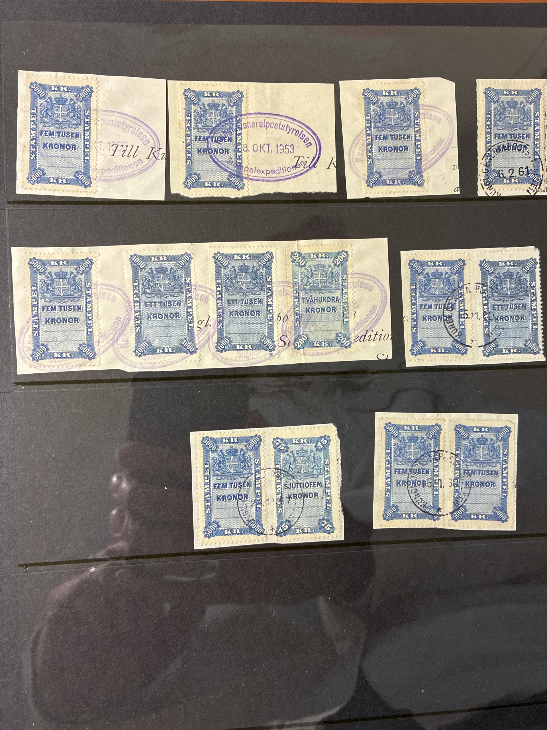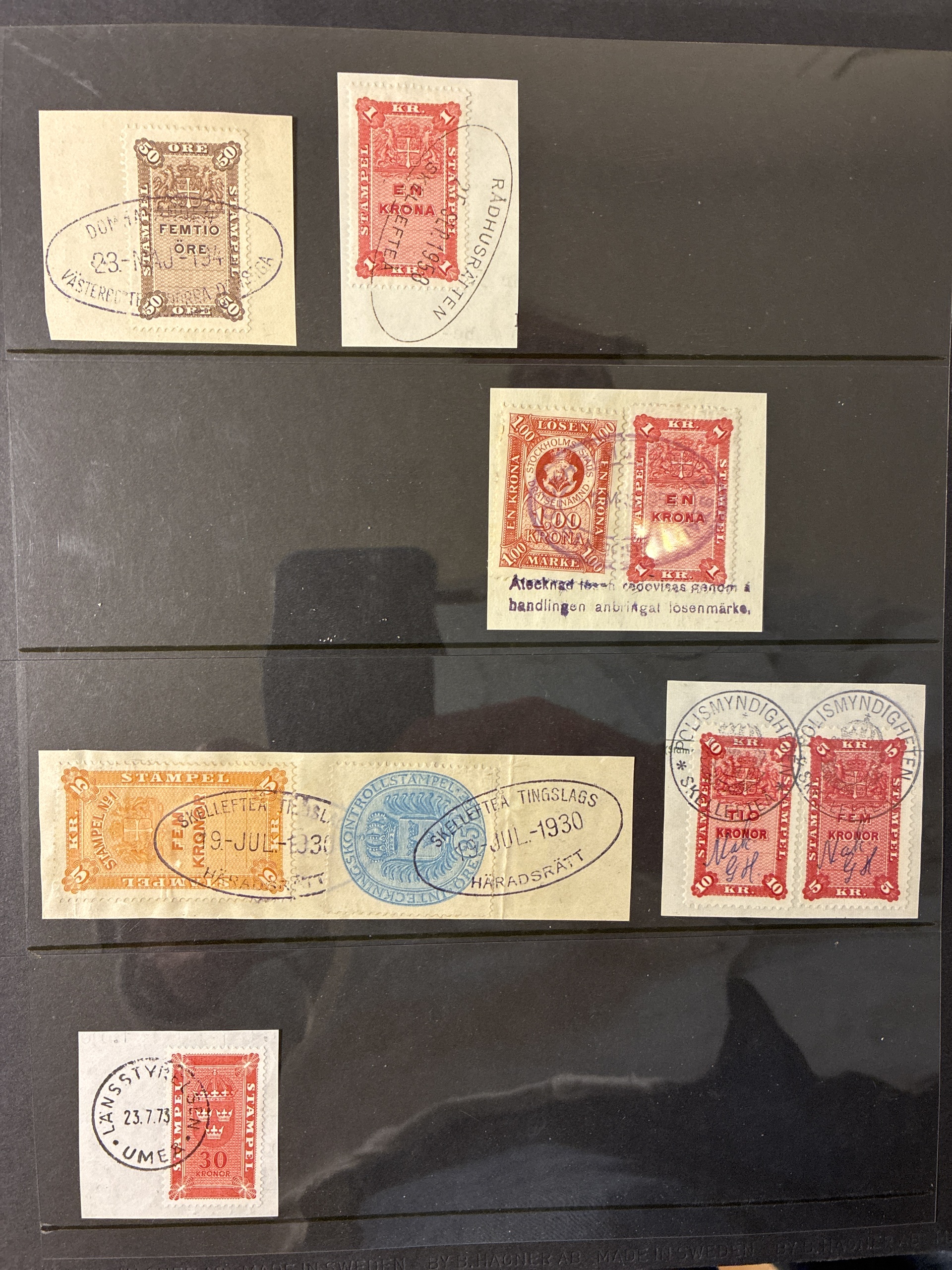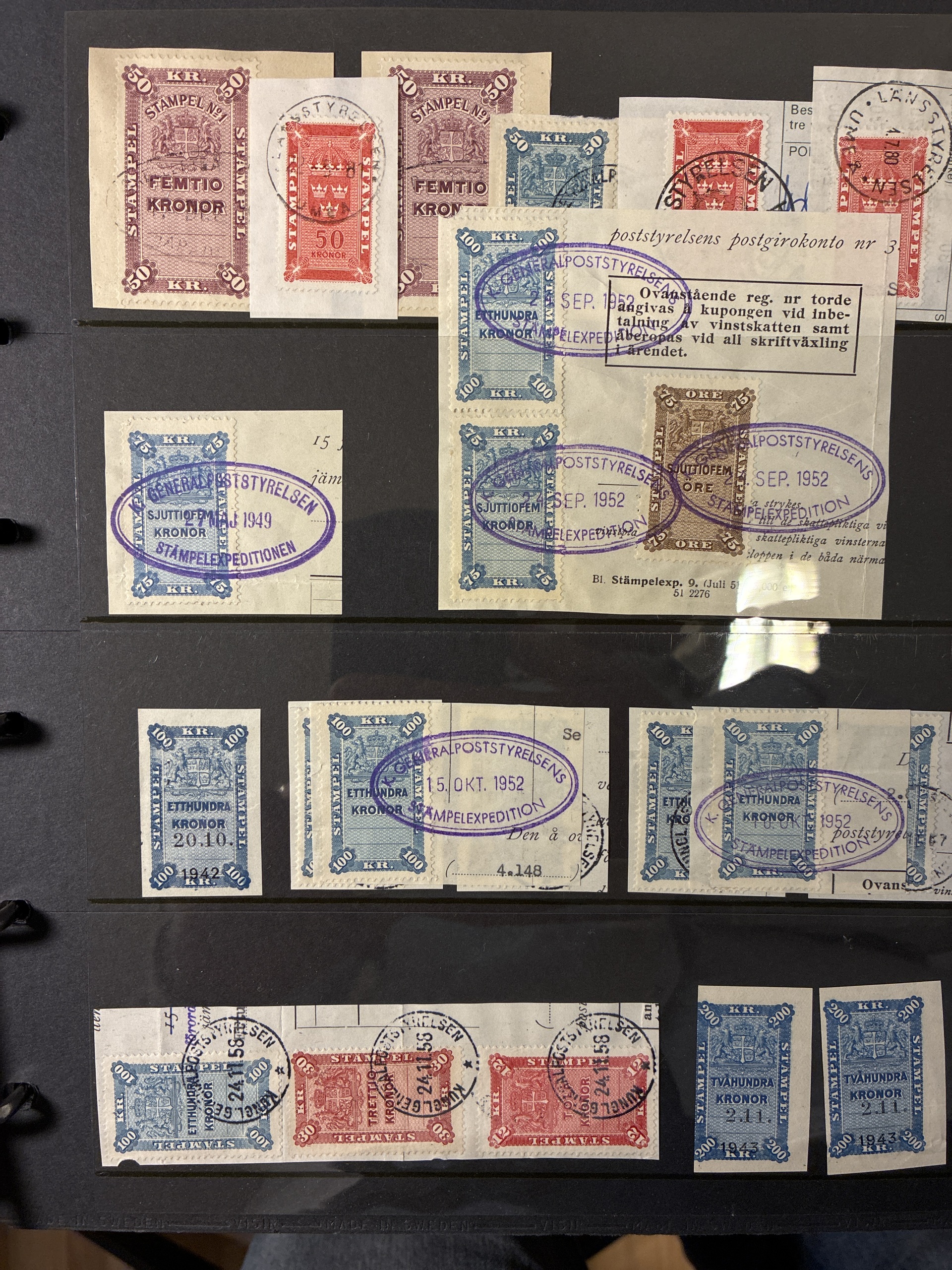 Sweden. Revenues, accumulation 1900s in visir album. Revenue values up to 5000. On pieces from documents. Please see a selection of scans at www.philea.se. Mostly good quality. (ca. 400)