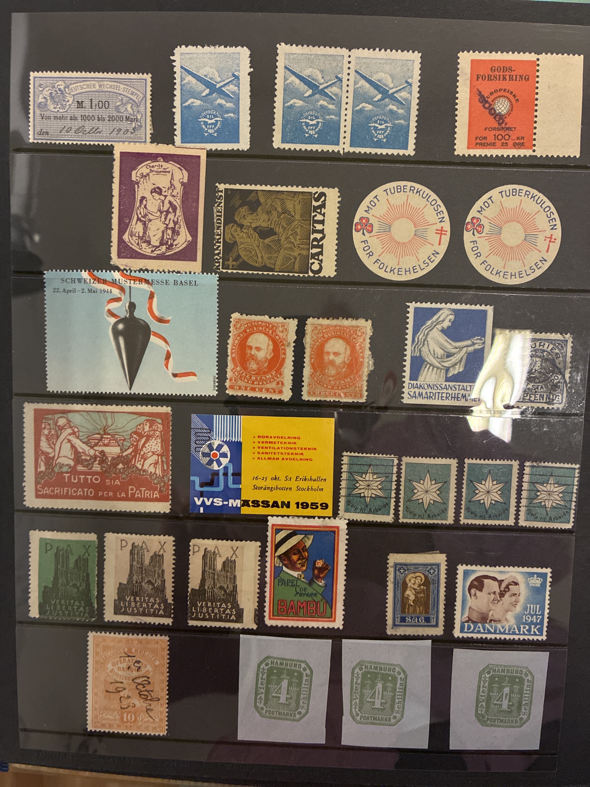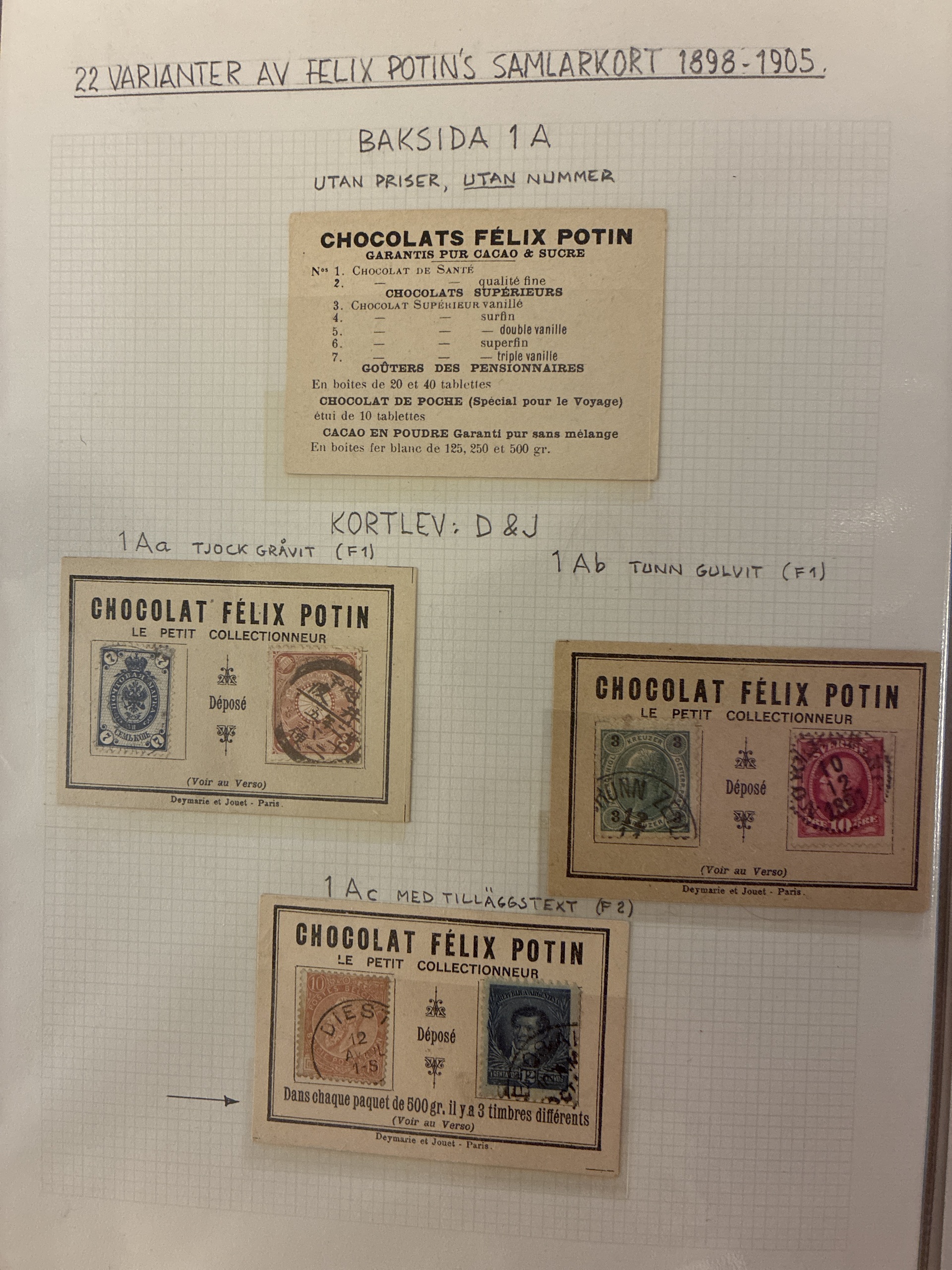Sweden. Cinderella, accumulation 1890– on leaves. S Ewert proofs, Dannemora-Hargs Jernväg Godsmärke, mot uuberkulos, French collector cards from 'Chocolats Felix Potin 1898–1905. Interesting mix. Please see a selection of scans at www.philea.se. Somewhat mixed quality. (170)