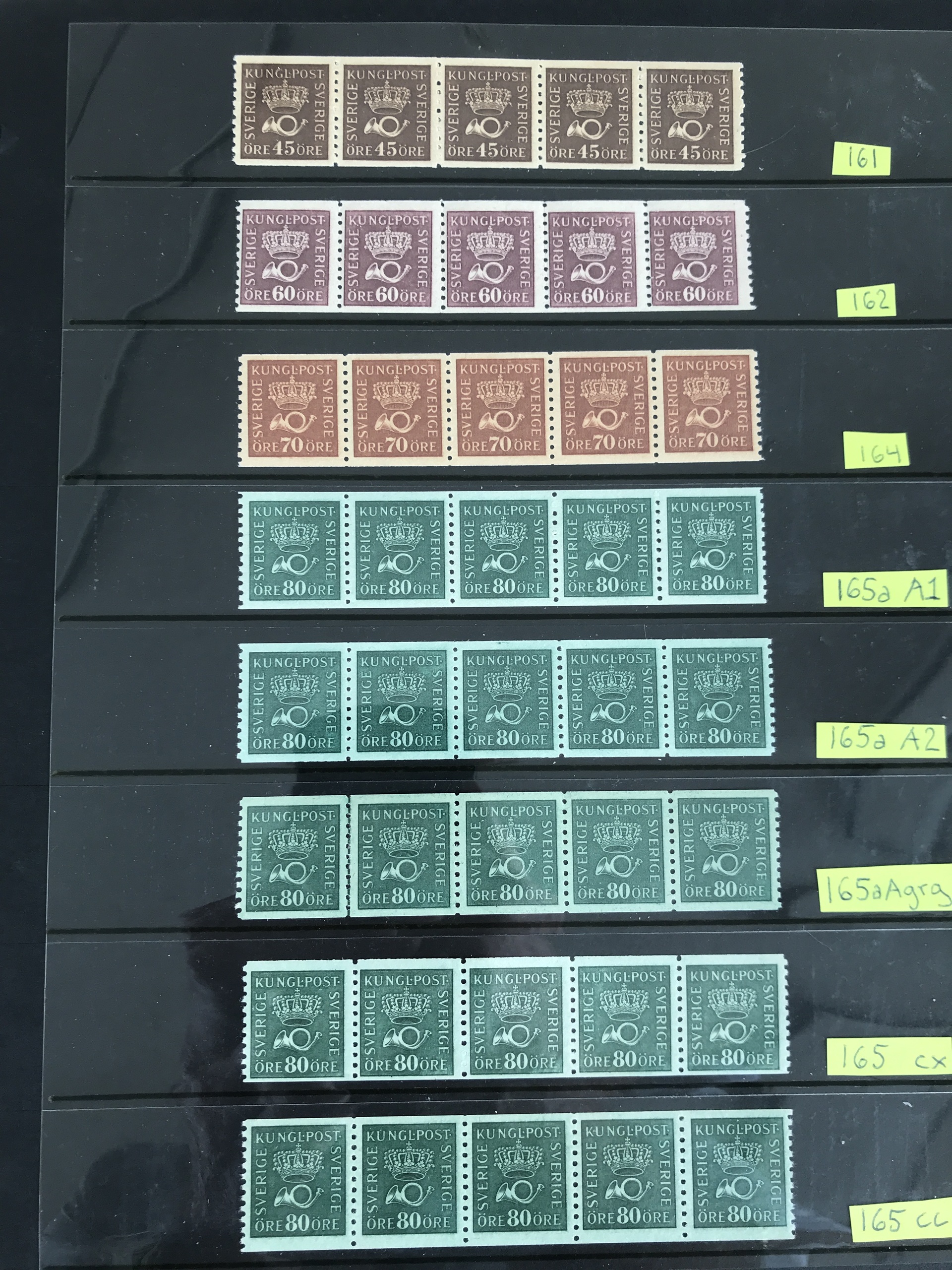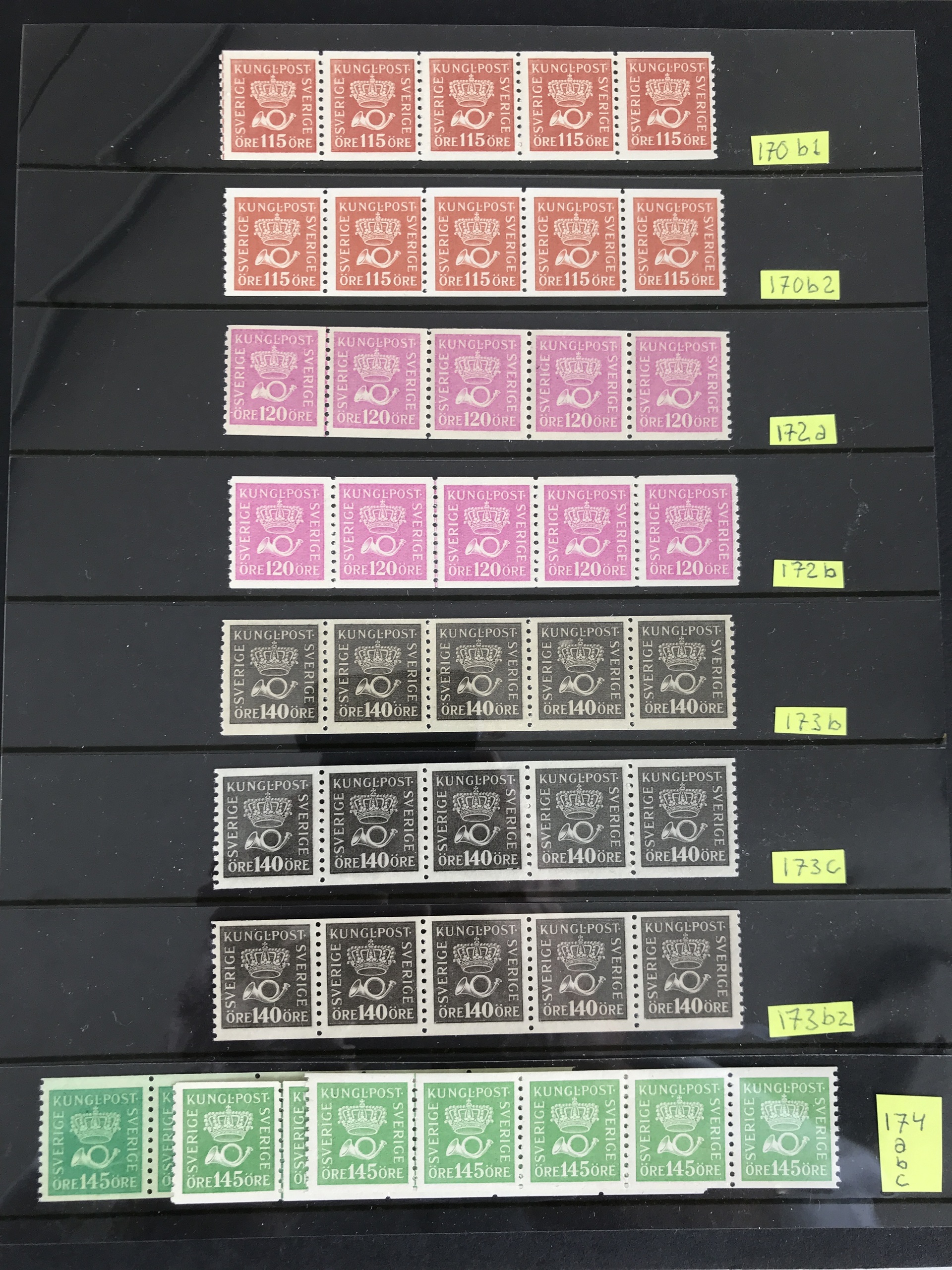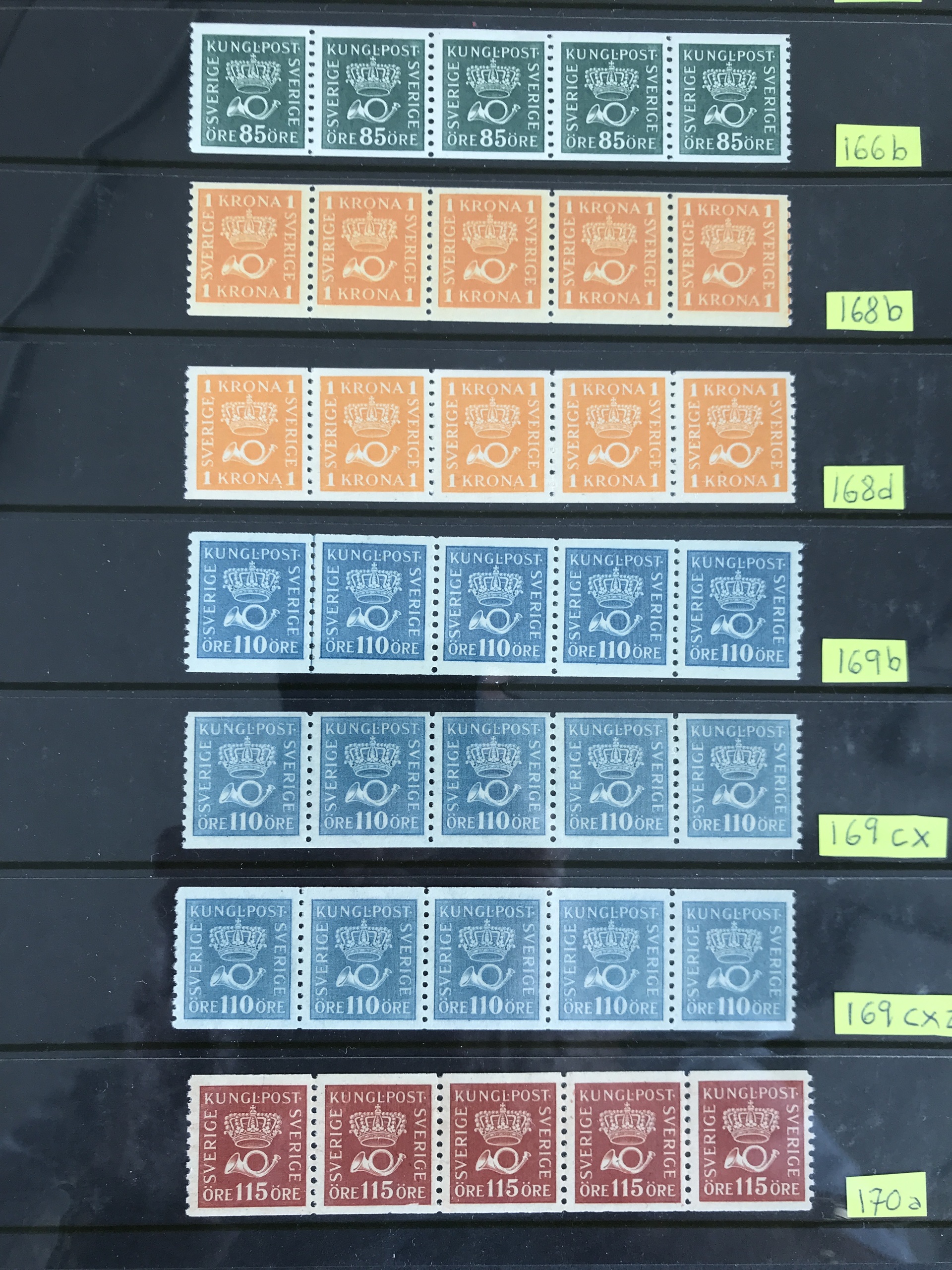 Sweden. ★★. 26 different strips of five Crown and Posthorn incl. F162 and 172a+b etc. F ca. 27600. The entire lot is presented at www.philea.se. Excellent quality.