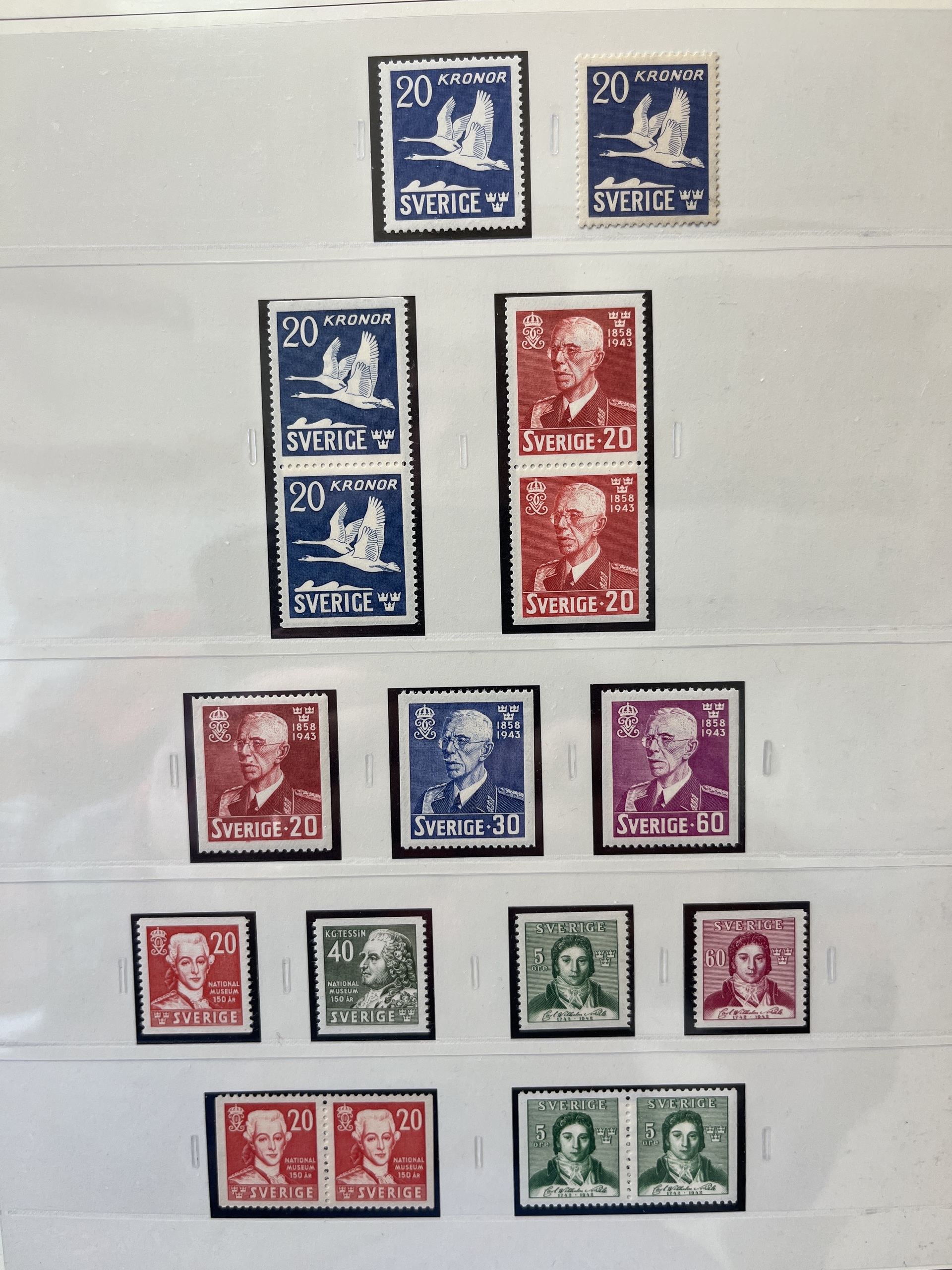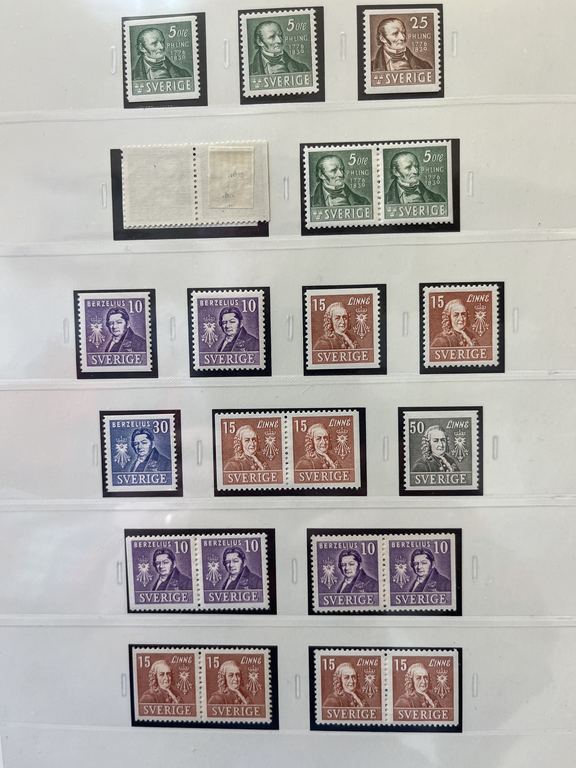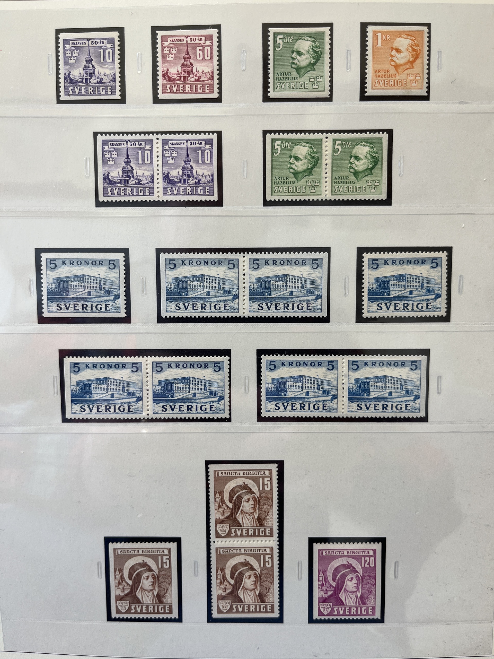 Sweden. Collection mostly ★★ 1938–1955 in SAFE album with stamp mounts. Incl. Stockholmia 55 in blocks of nine. Only a very few *. Although the Royal Castle CB and BC are among them. Fine quality.