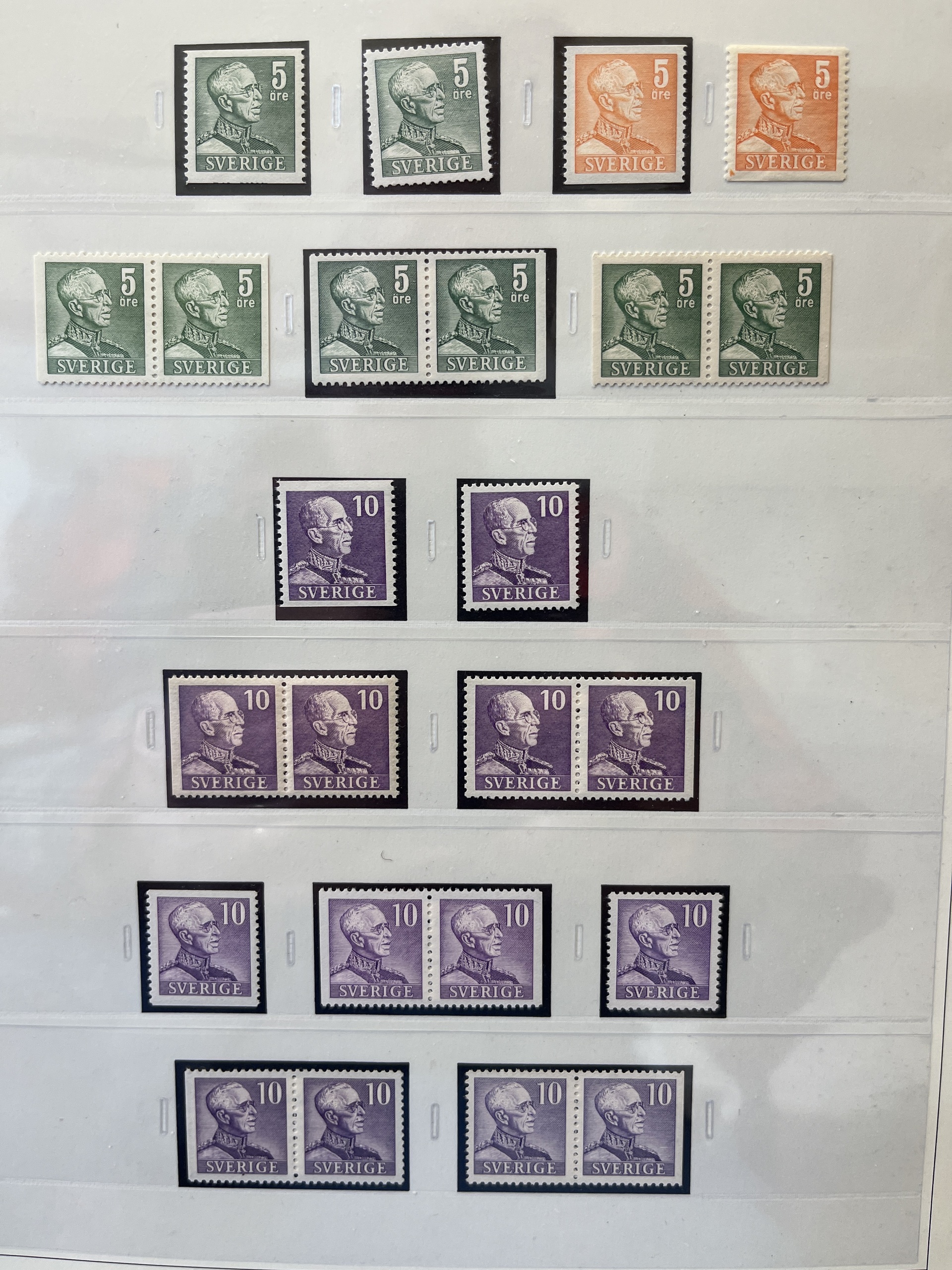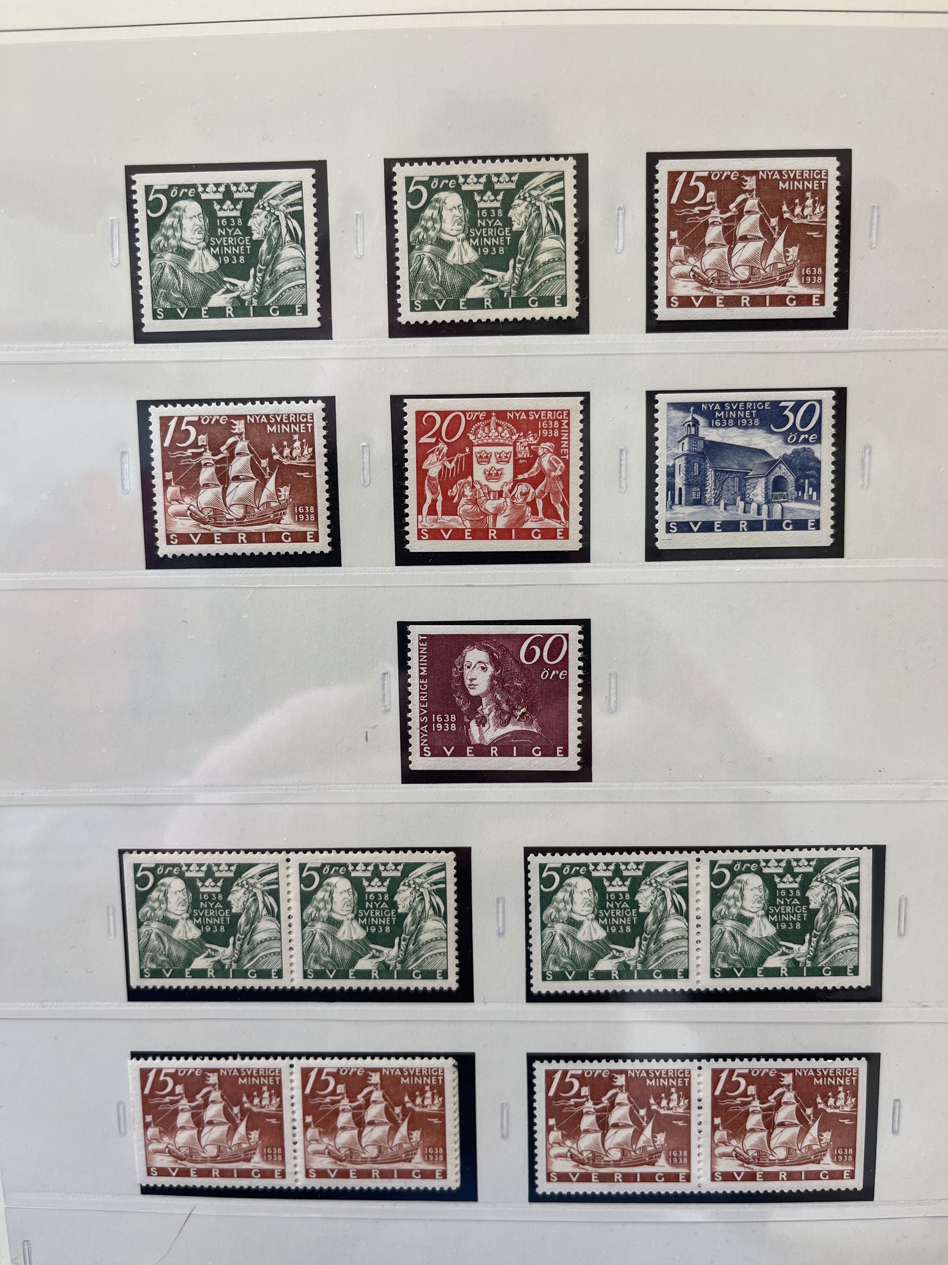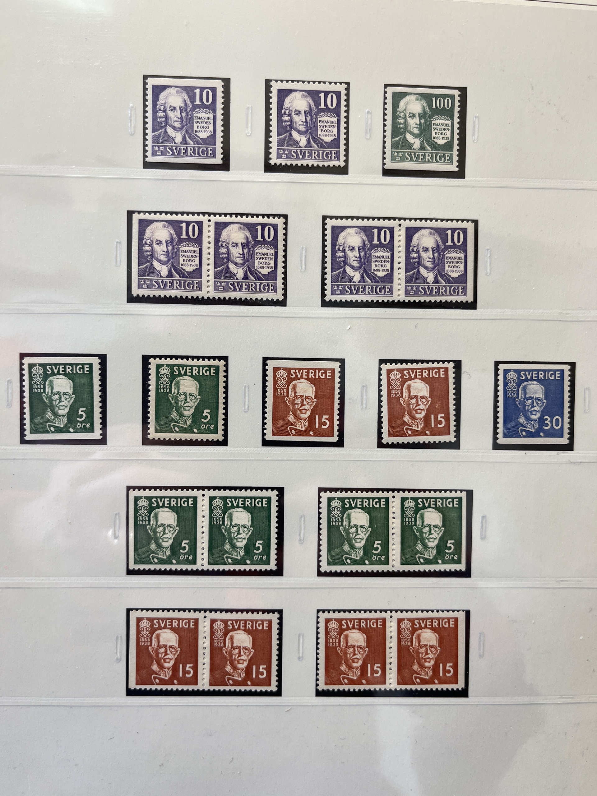 Sweden. Collection mostly ★★ 1938–1955 in SAFE album with stamp mounts. Incl. Stockholmia 55 in blocks of nine. Only a very few *. Although the Royal Castle CB and BC are among them. Fine quality.