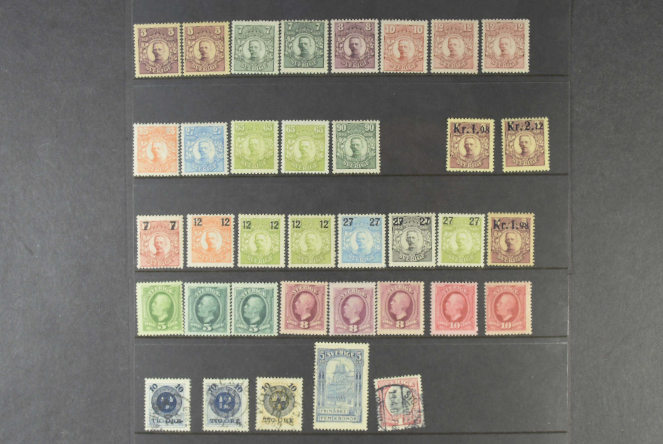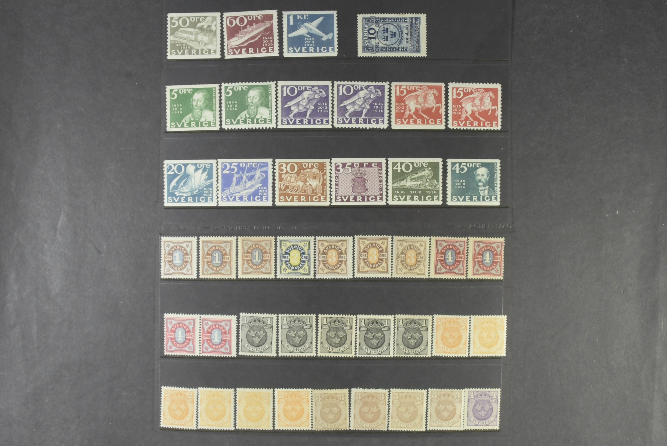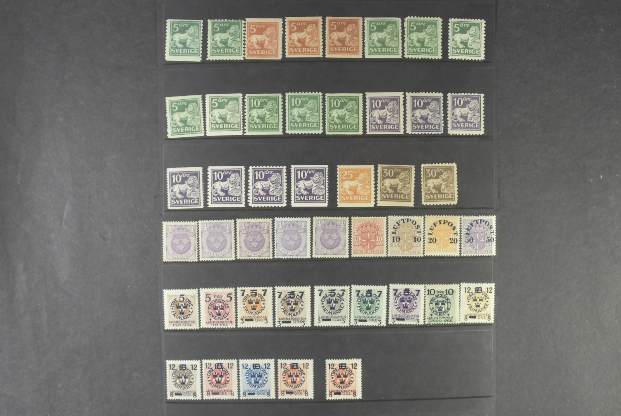 Sweden. Lot unused on six large stock cards. E.g. many Standing Lion, some Teritorial Defence and Air mail, etc. Mainly x but also a set Postal Service 1936 cpl. xx, and F125 xx (small discoluring in left margin). Fine quality.