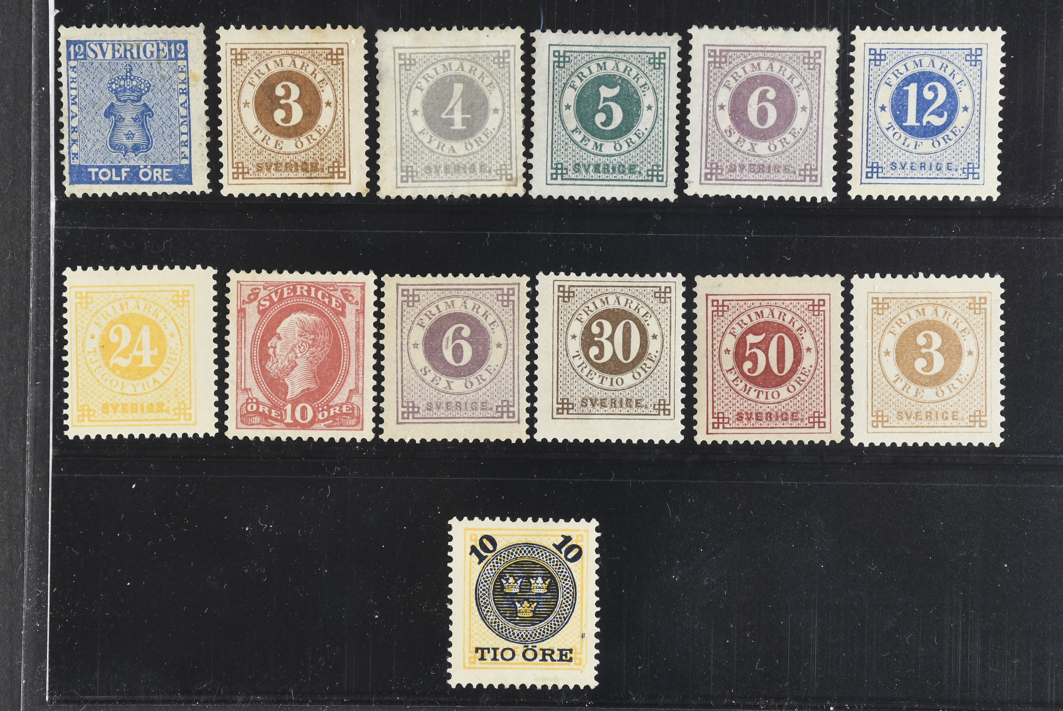 Sweden. ★ 1858–1891. All different, e.g. F 9, 28, 29 (ugly, broken corner), 30–32, 34, 39 (*), 44, 47, 48 (short perf). Mixed quality. F SEK 12950 if no defects) (13)