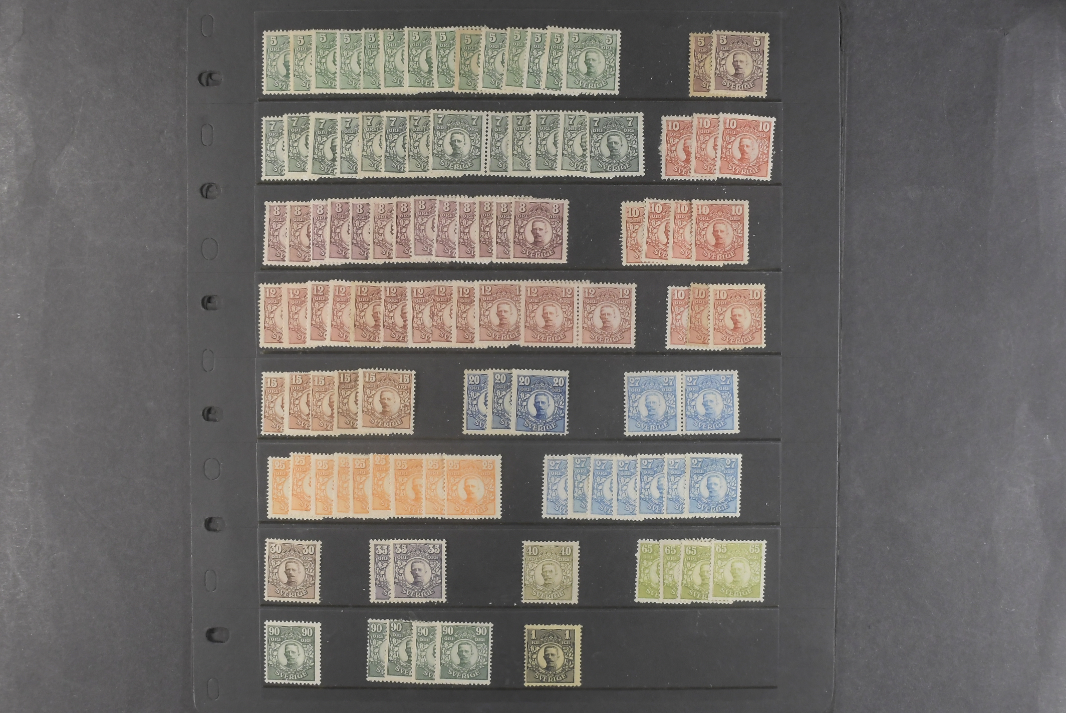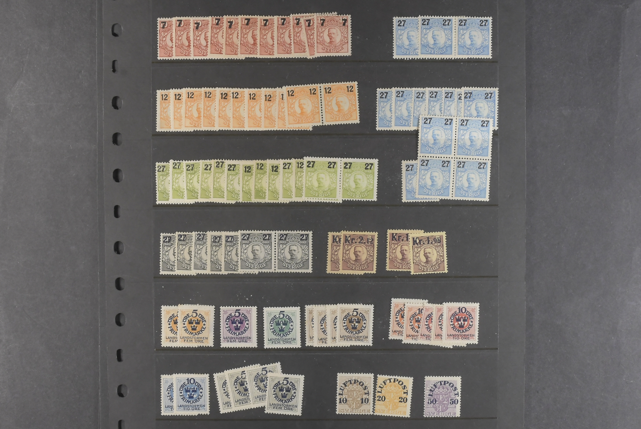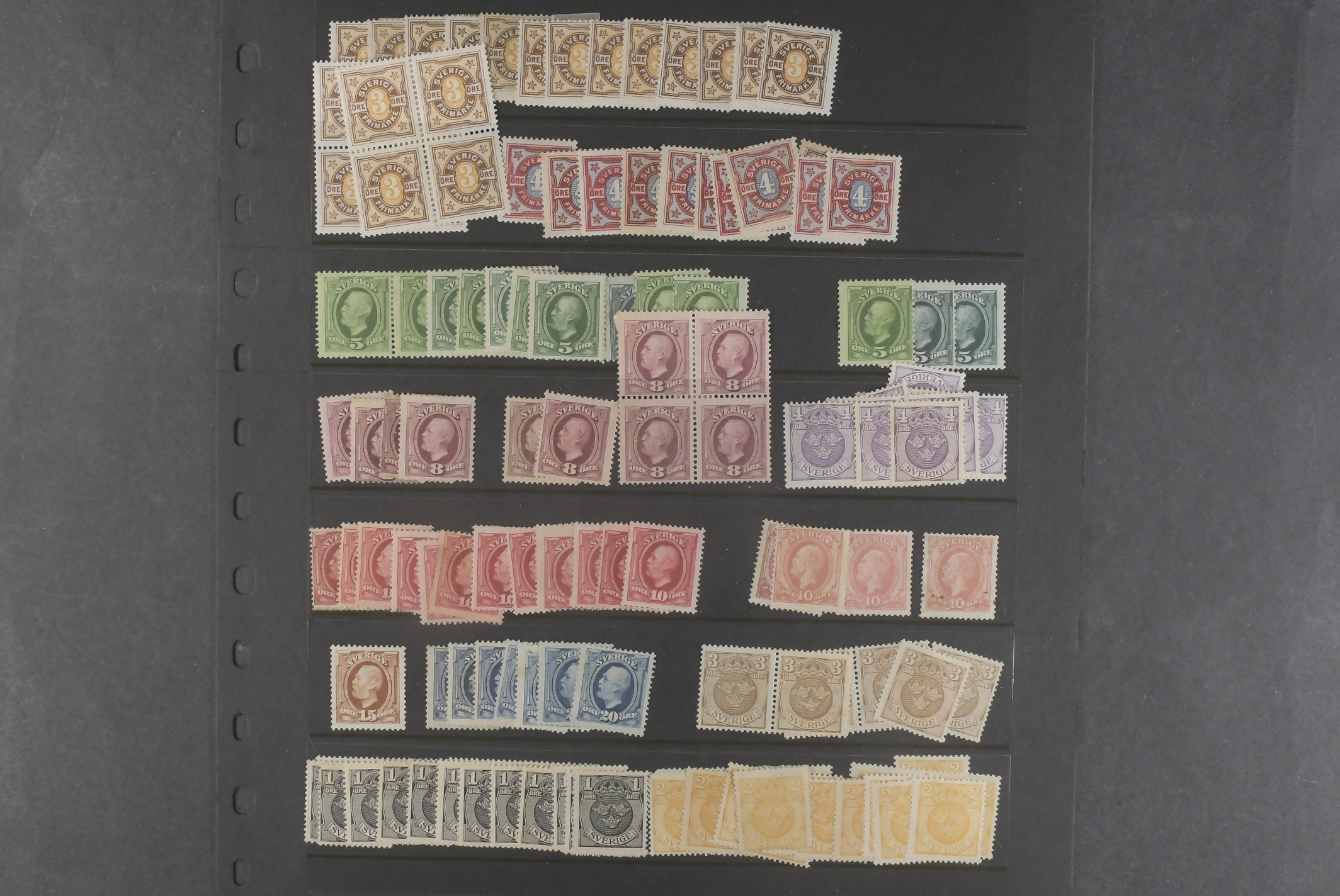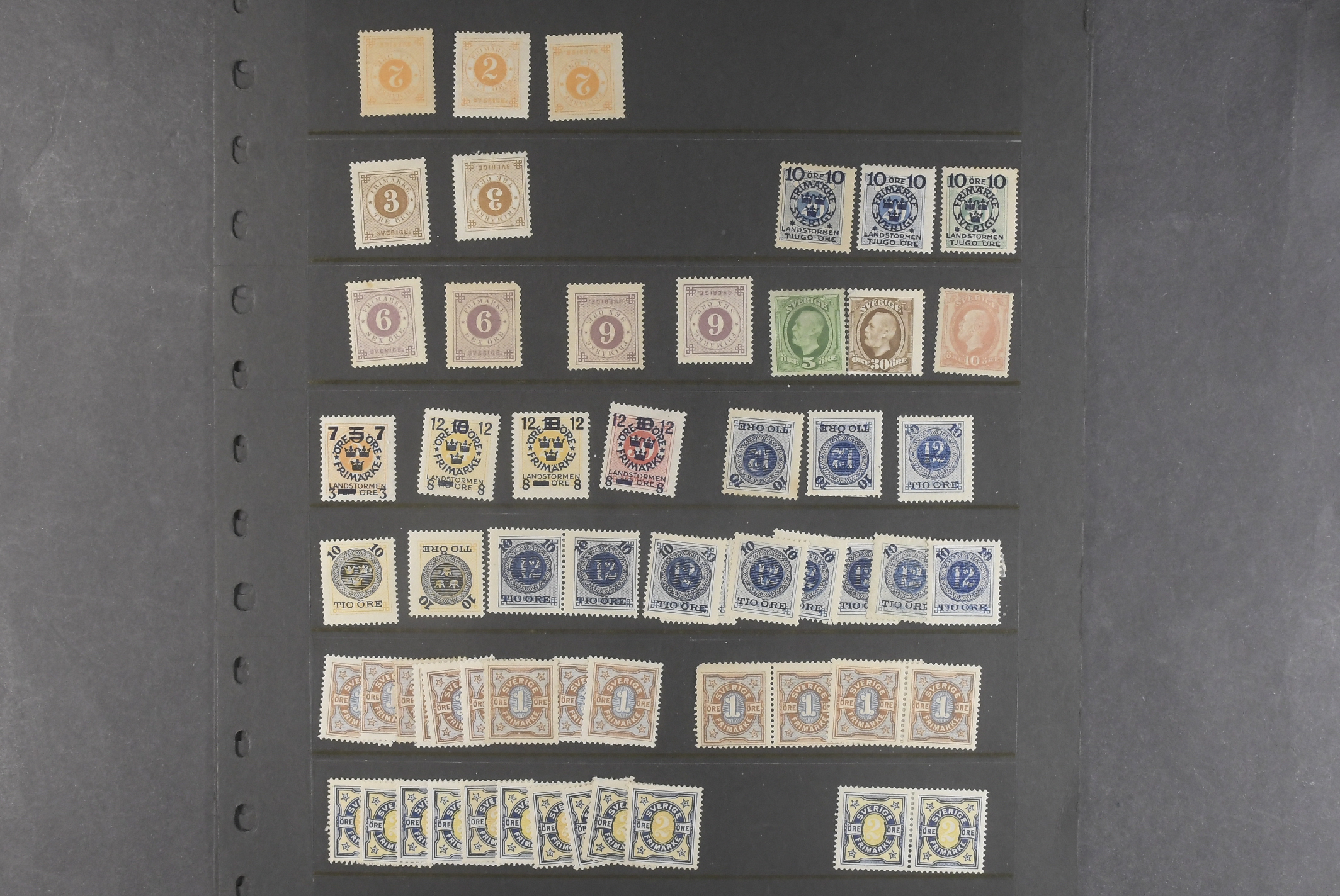 Sweden. Collection/accumulation ★★/★ 1885–1920 on visir leaves. Stock material from Circle Type with posthorn to Air Mail (1920) on four visir leaves. Mostly MNH. Options for watermarks, shades, etc. Not explored. Please see a selection of scans at www.philea.se. Mostly good quality. (>200)