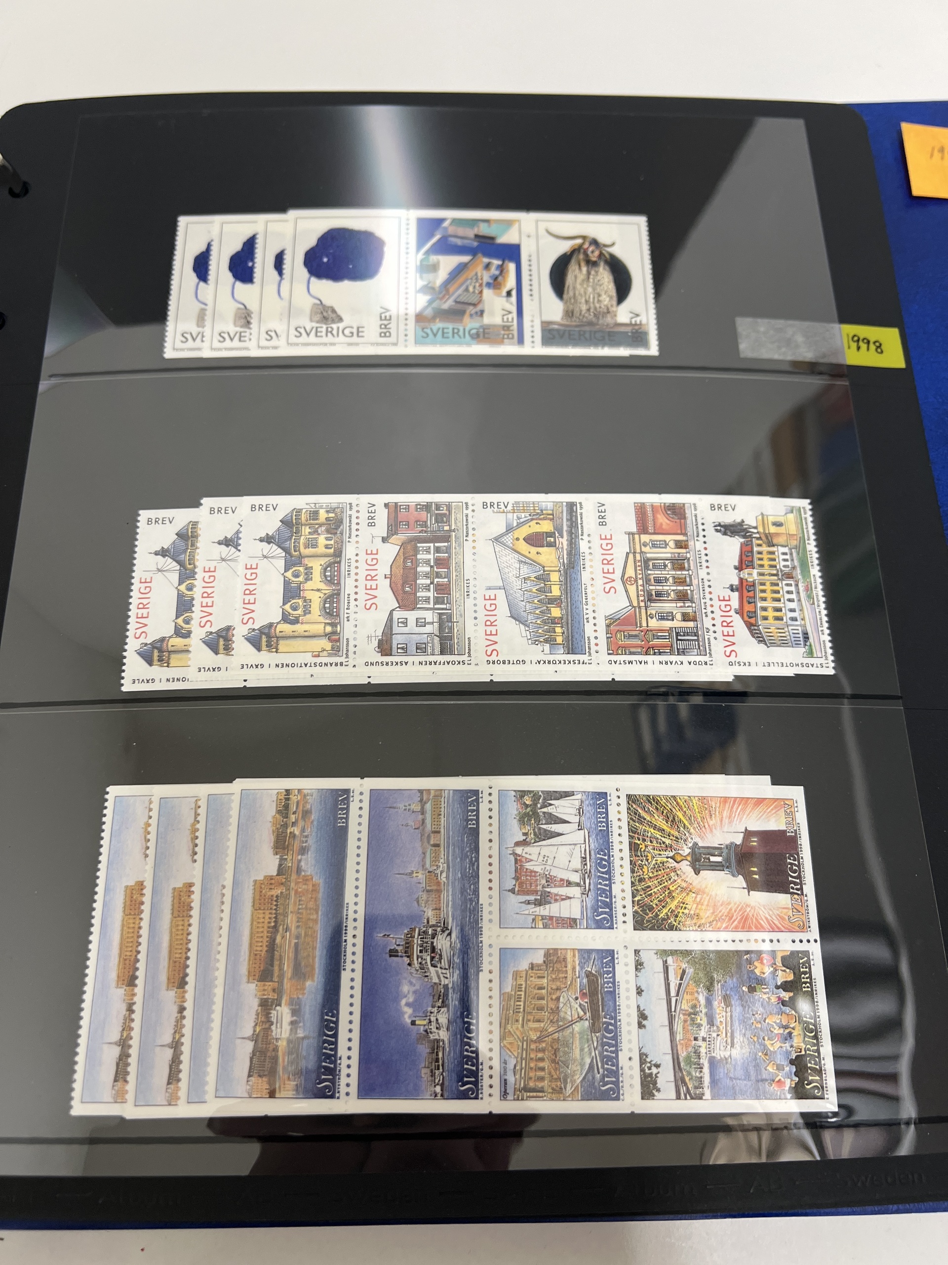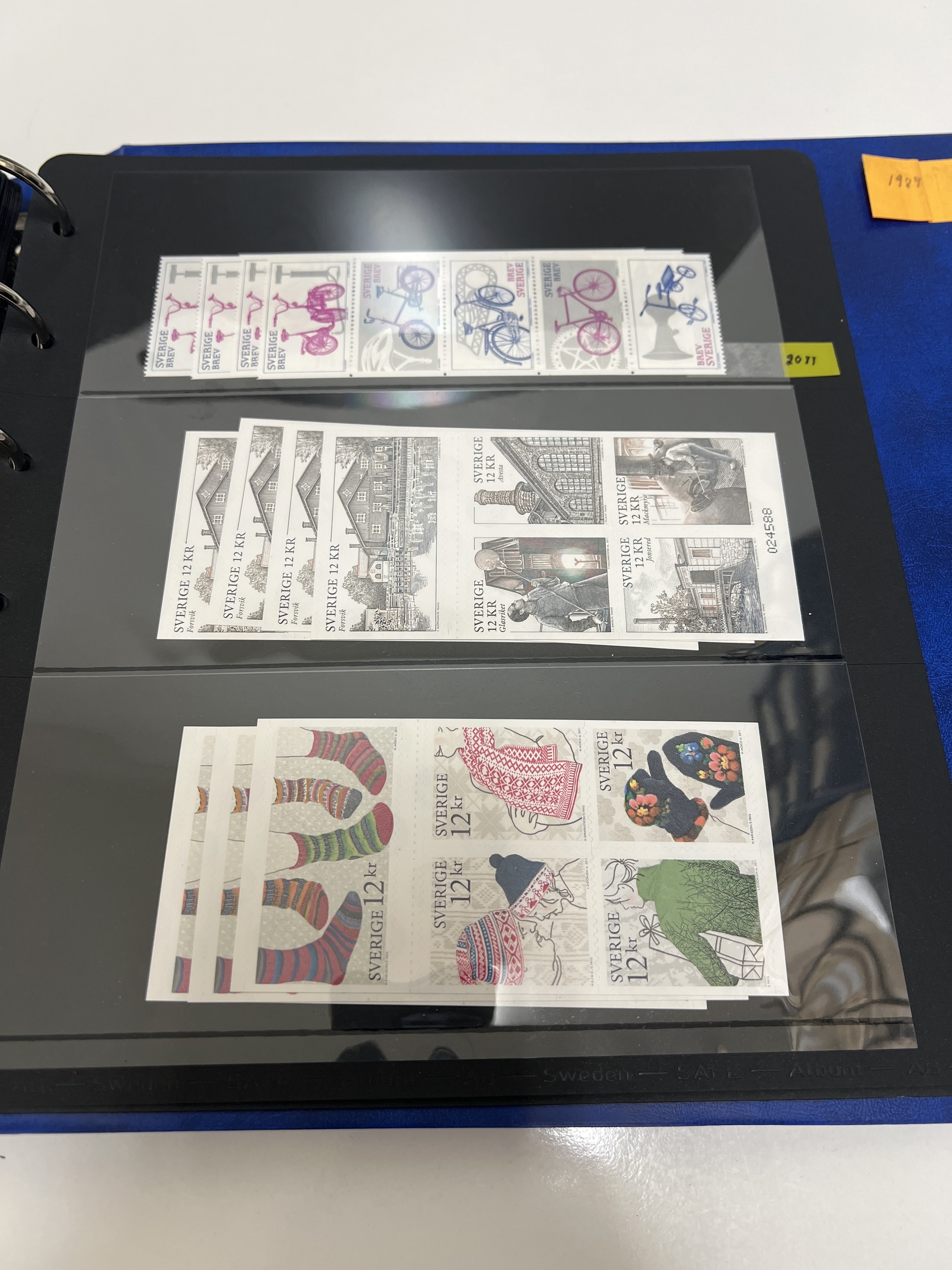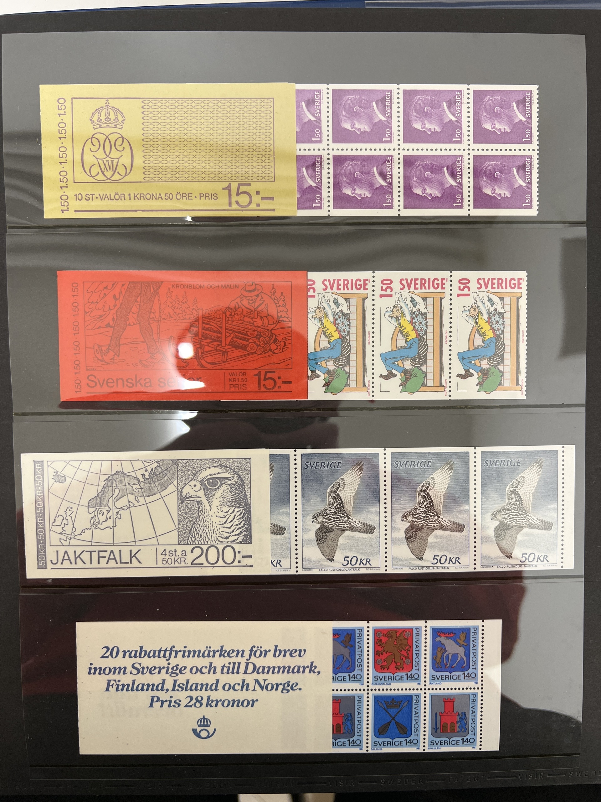 Sweden. Face value, collection/accumulation 1970s–2011 in visir album. Total facevalue 21600 kr, including 679 'Sverige BREV', booklets, sheets SS-blocks. 45 Christmas stamps (17 kr), 10 discount booklets(eight Nordic + two Sweden), and 75 discount stamps. Discount stamps/booklets are NOT counted in the total face value. No stamps before 1992 and no facevalue lower than 5 kr are counted. Excellent quality. Approx. 7 kg. (1000s)