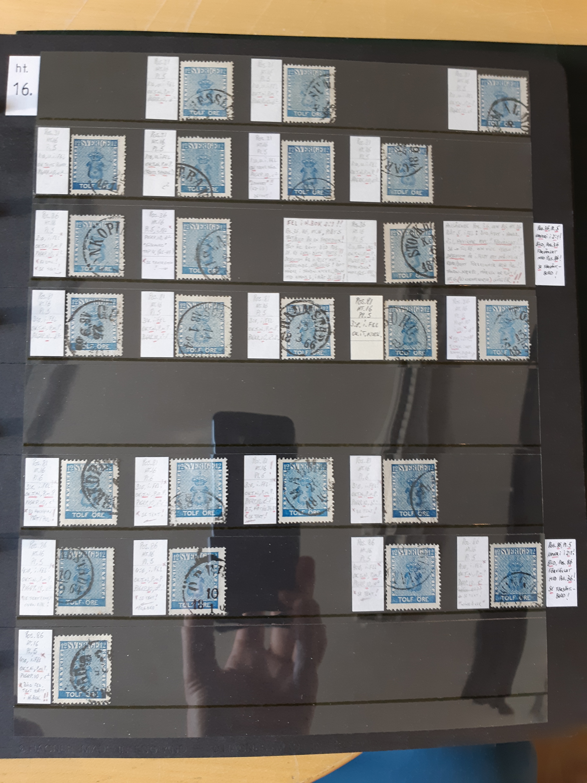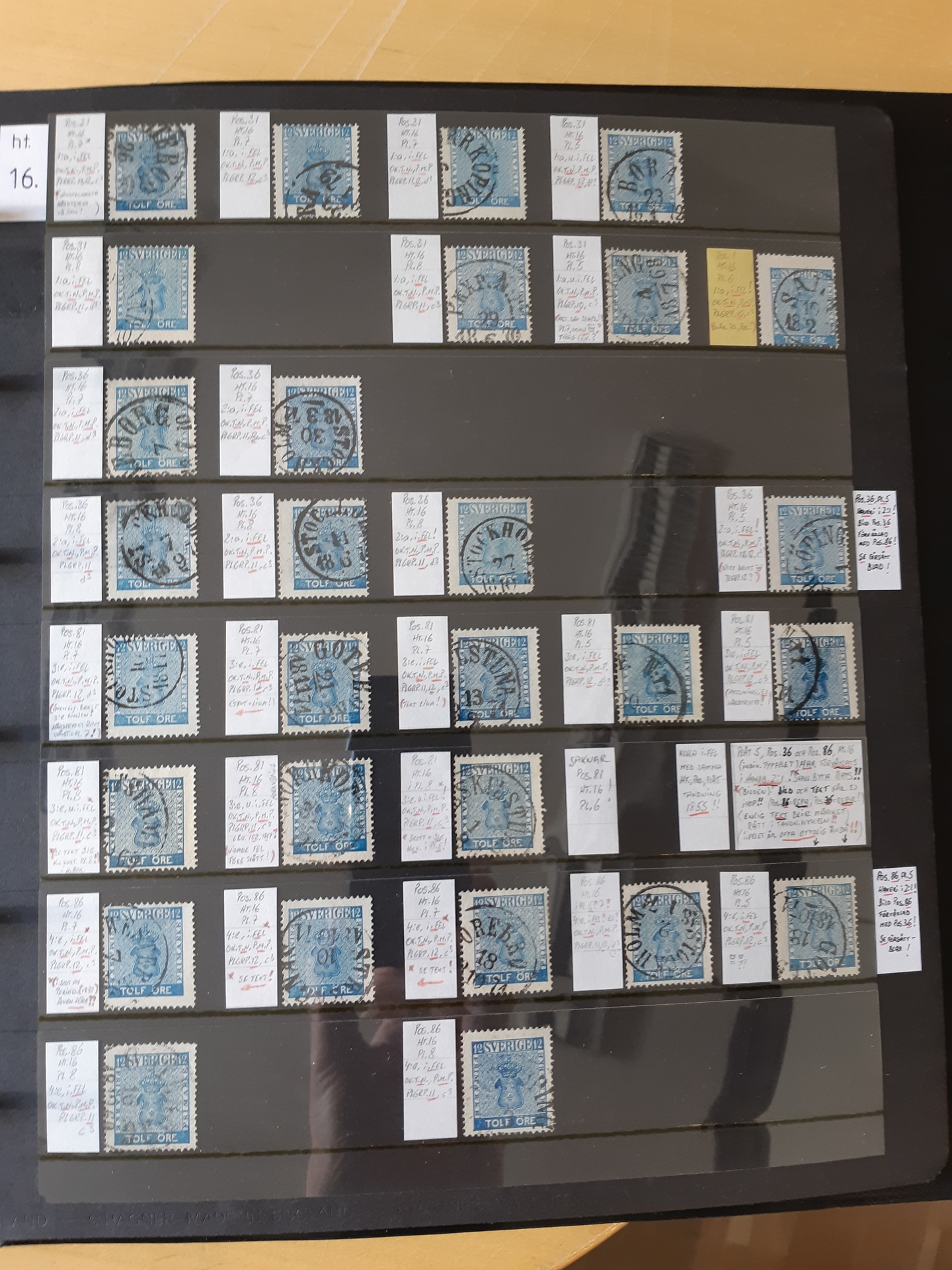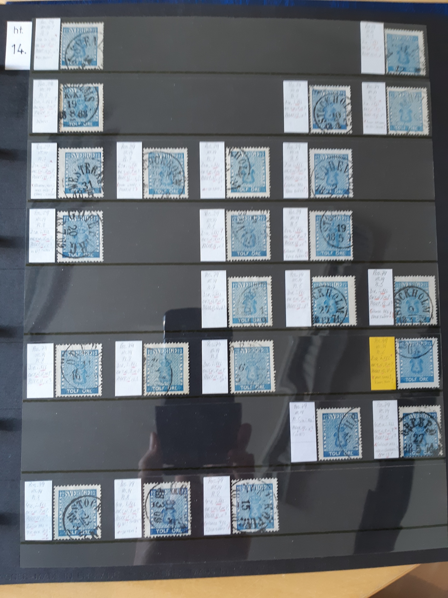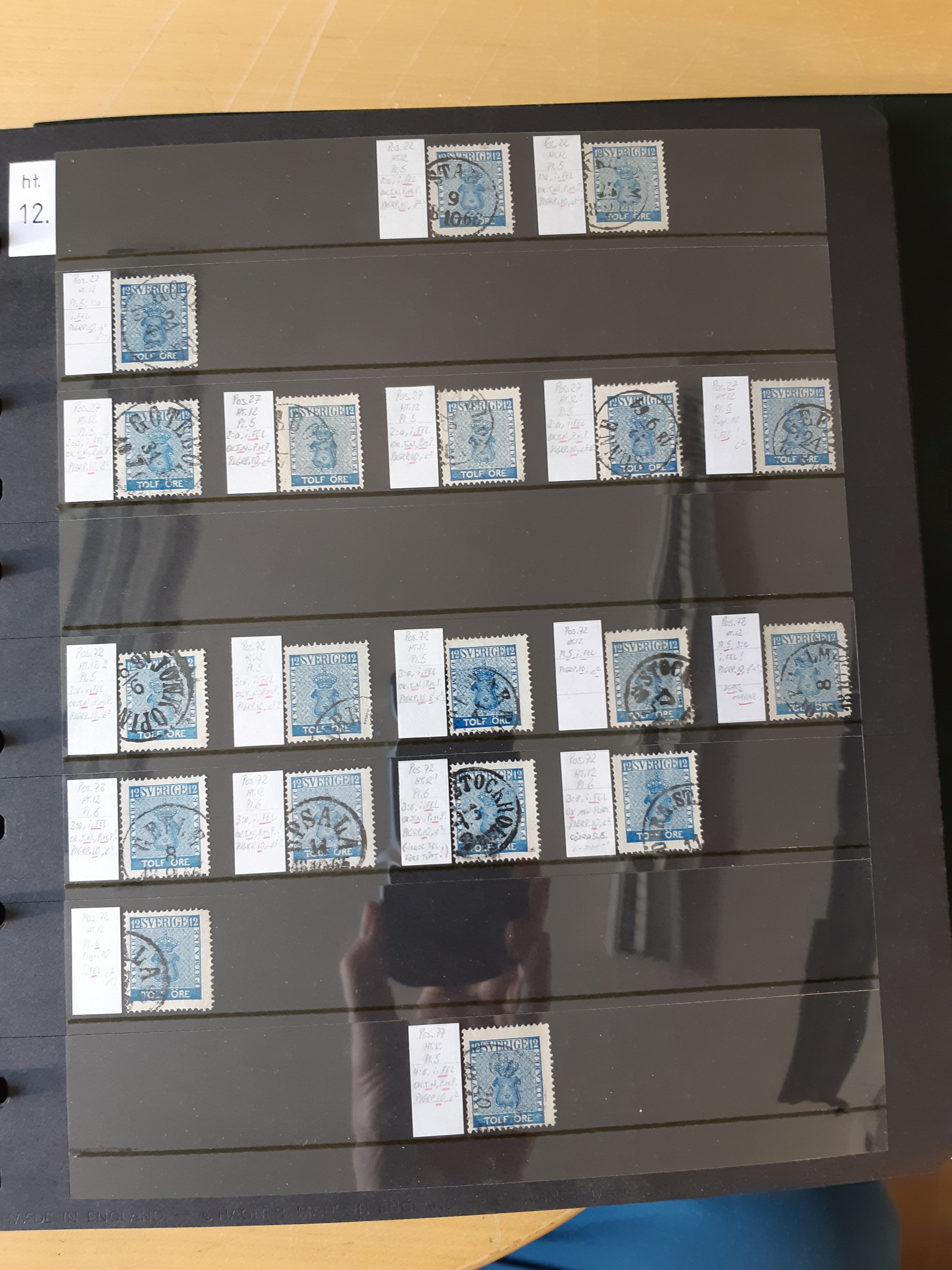Sweden. Collection used 12 ÖRE COAT-OF-ARMS from plate 5–8 in four visir albums in box. Interesting study of this popular stamp. Over three tousand two hundred stamps identified with shades, main types and positions in the plates. Very useful material. Please see a selection of scans at www.philea.se. Approx. 7 kg. (3225)