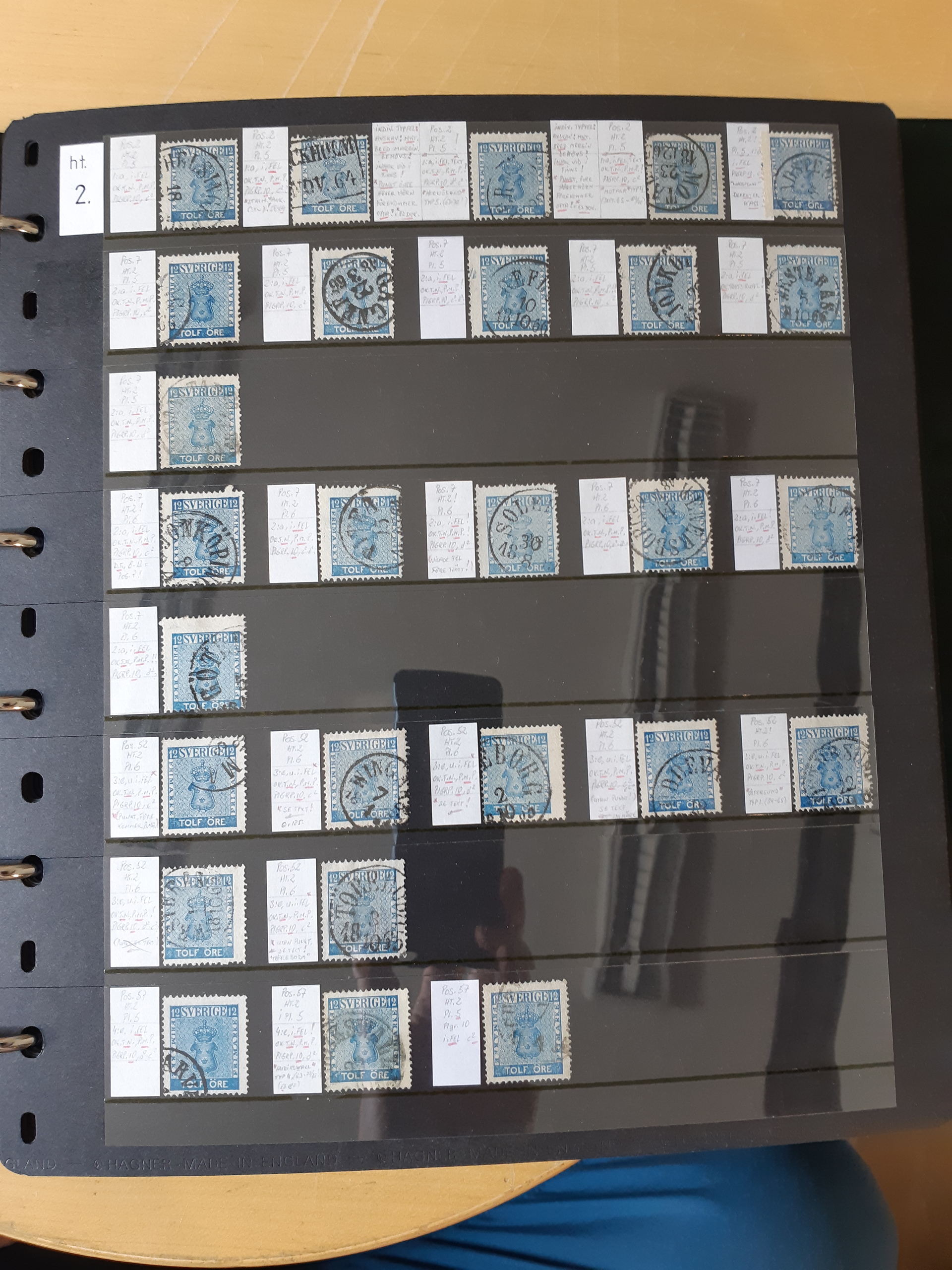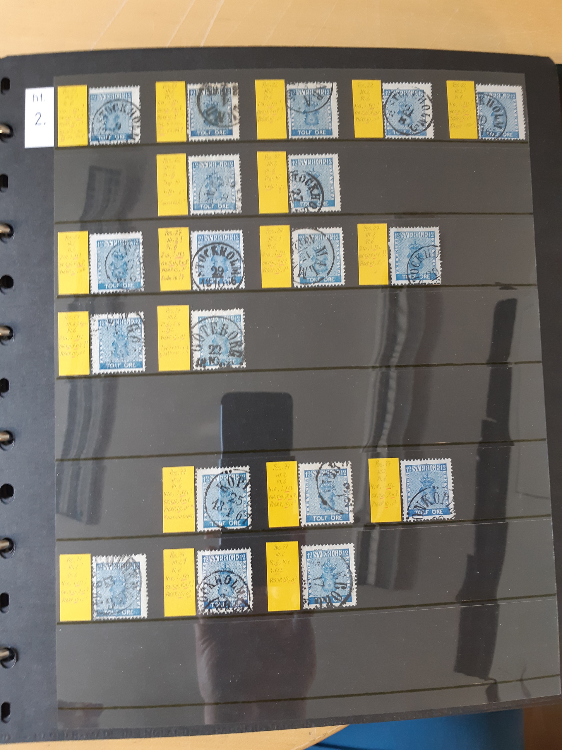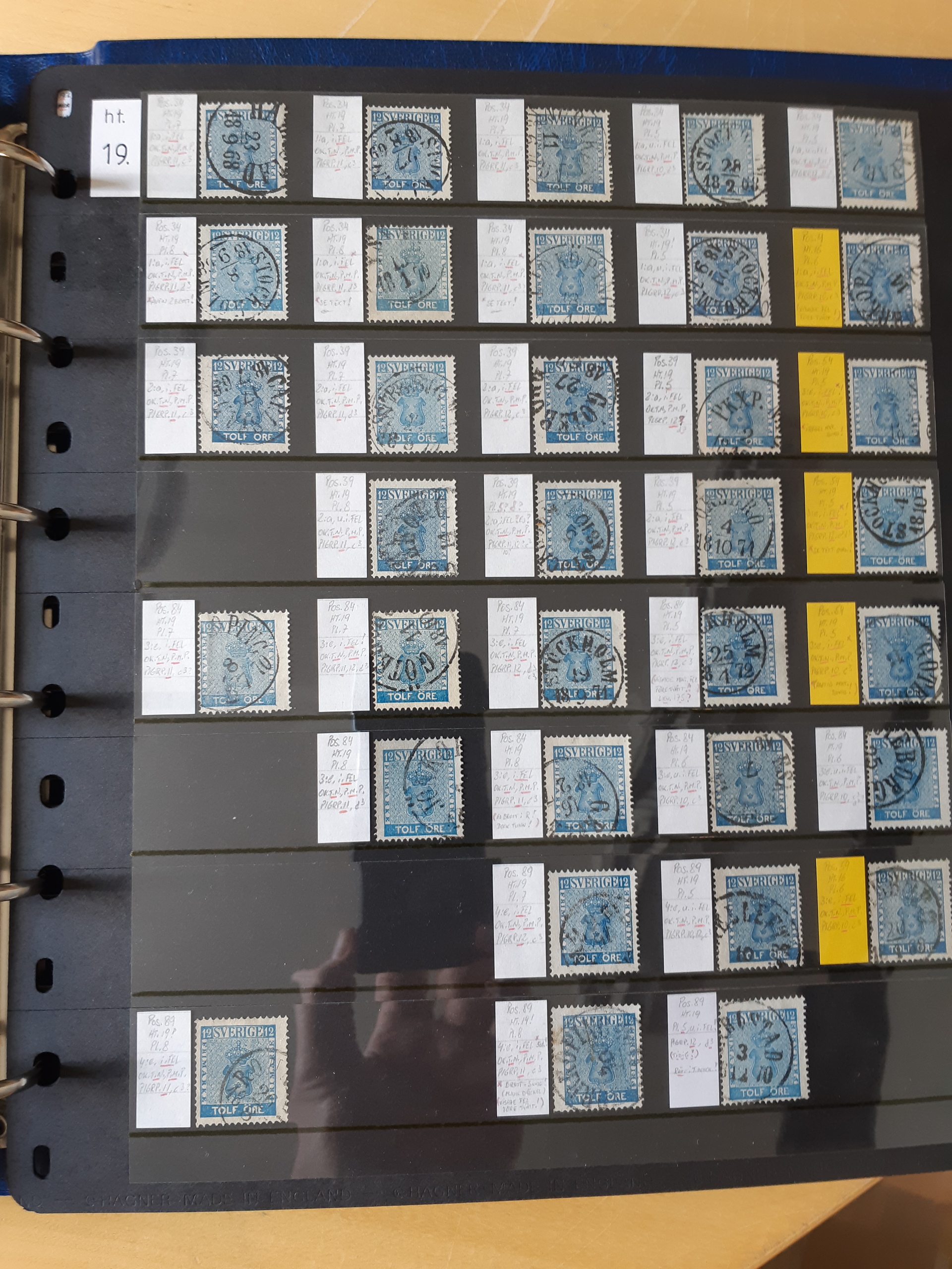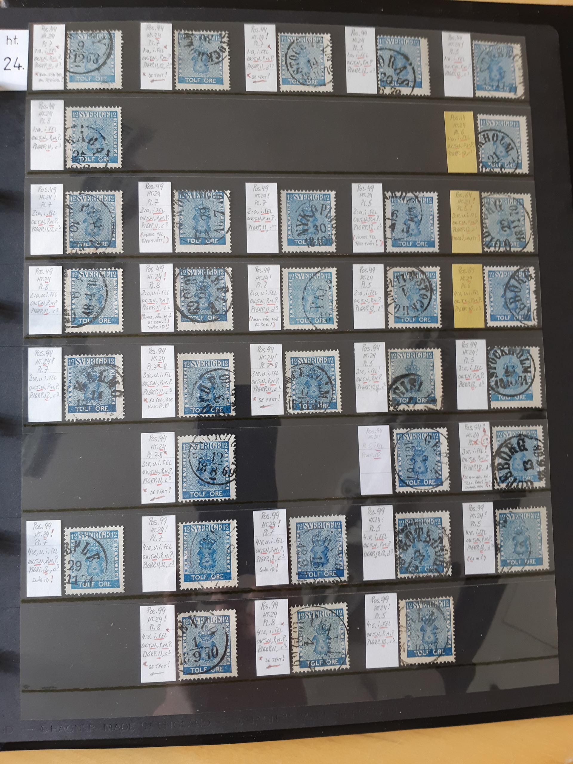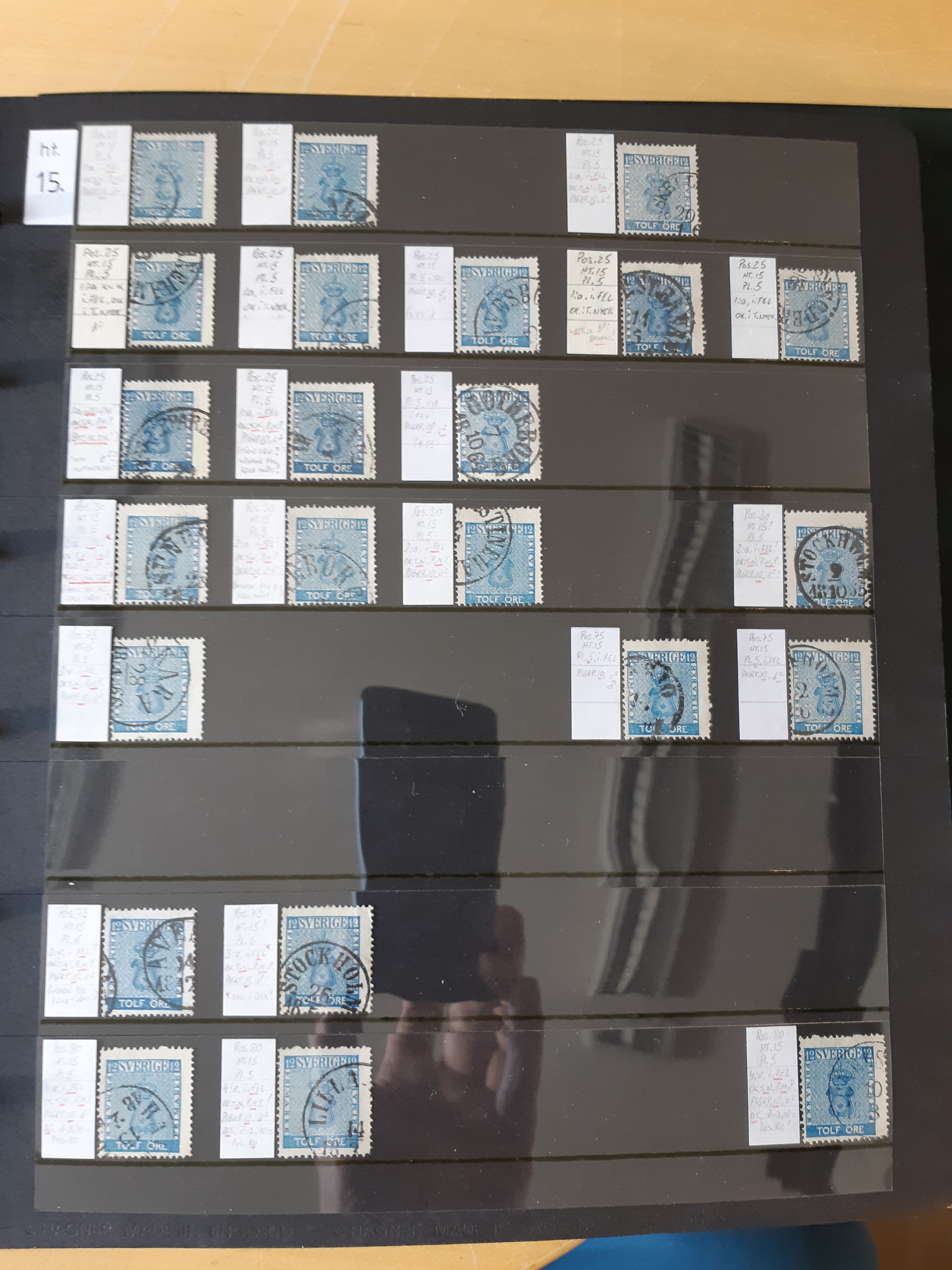 Sweden. Collection used 12 ÖRE COAT-OF-ARMS from plate 5–8 in four visir albums in box. Interesting study of this popular stamp. Over three tousand two hundred stamps identified with shades, main types and positions in the plates. Very useful material. Please see a selection of scans at www.philea.se. Approx. 7 kg. (3225)