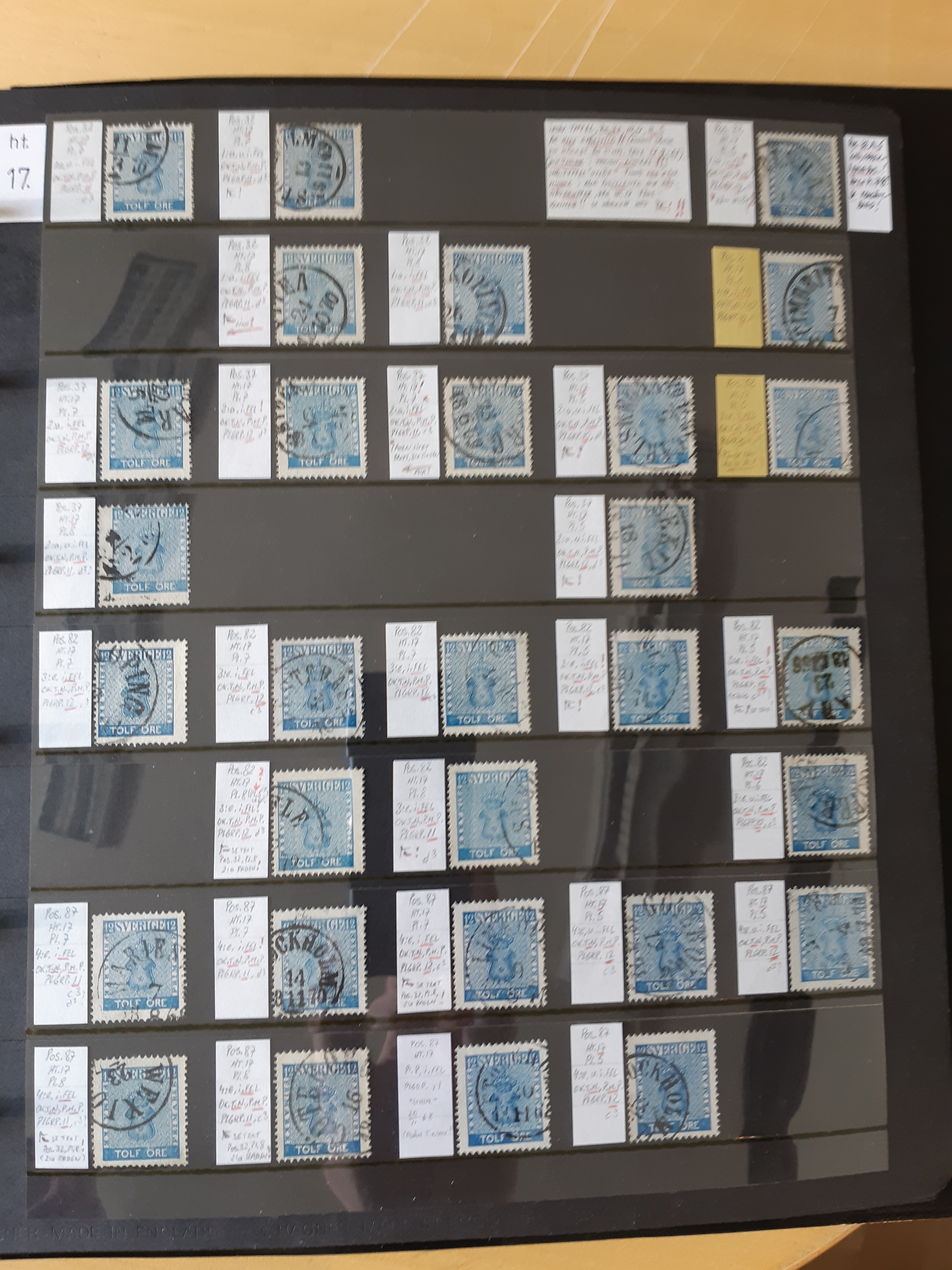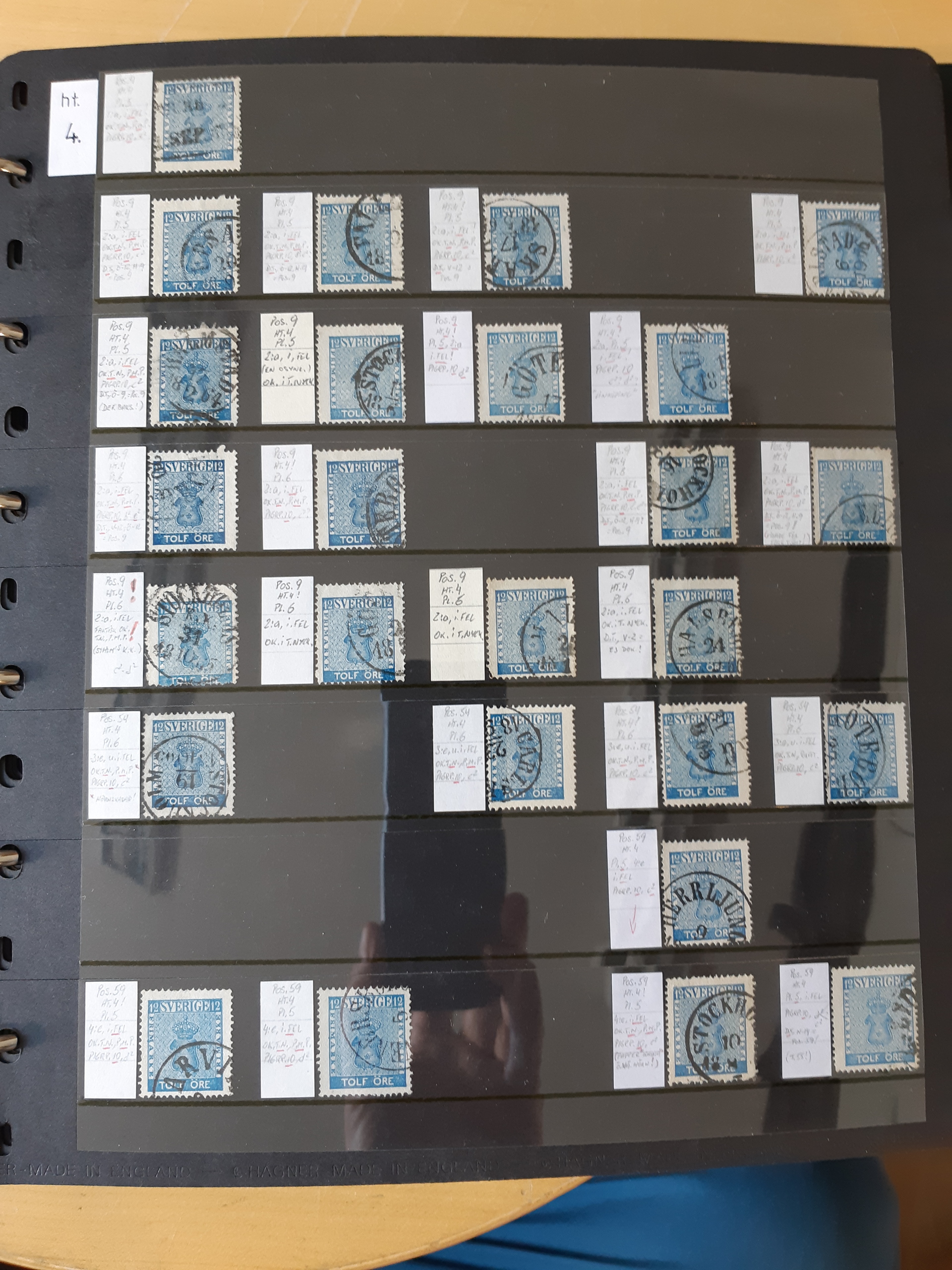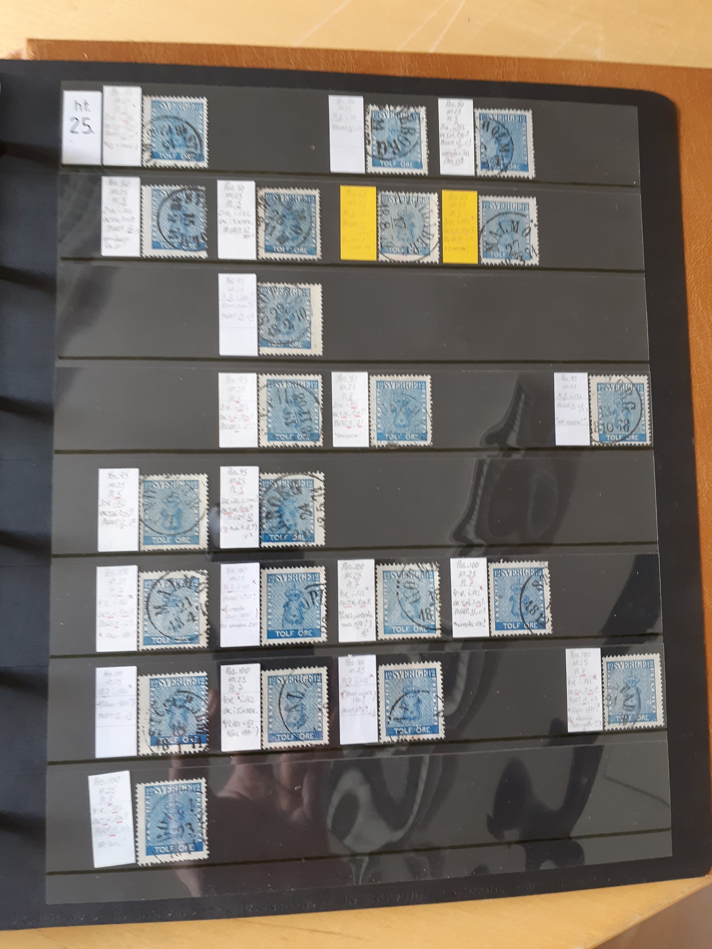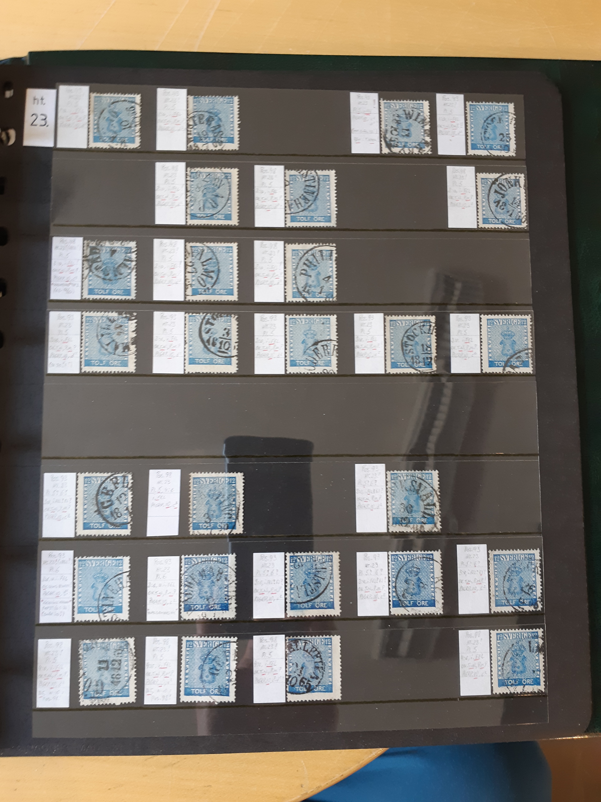Sweden. Collection used 12 ÖRE COAT-OF-ARMS from plate 5–8 in four visir albums in box. Interesting study of this popular stamp. Over three tousand two hundred stamps identified with shades, main types and positions in the plates. Very useful material. Please see a selection of scans at www.philea.se. Approx. 7 kg. (3225)