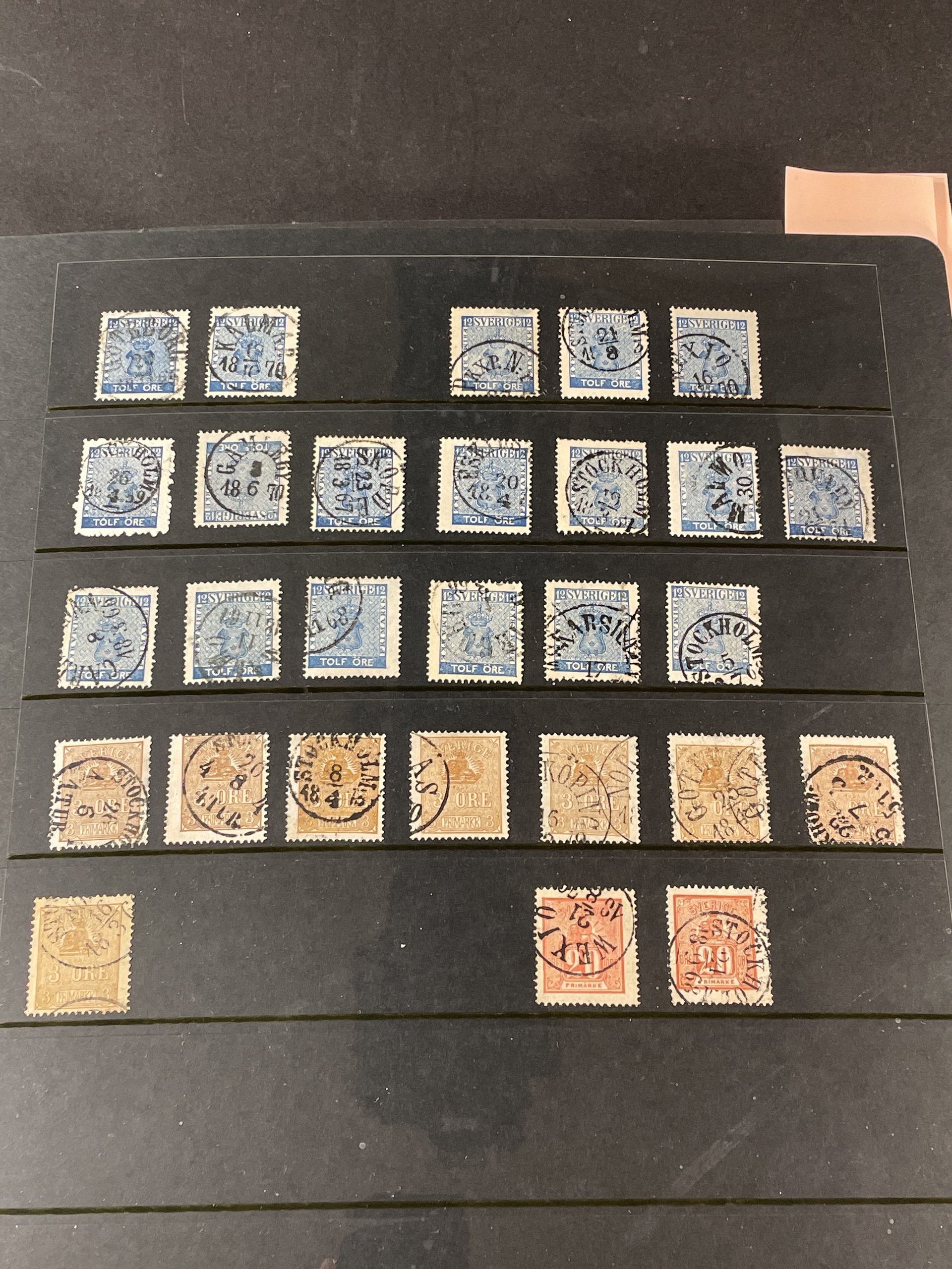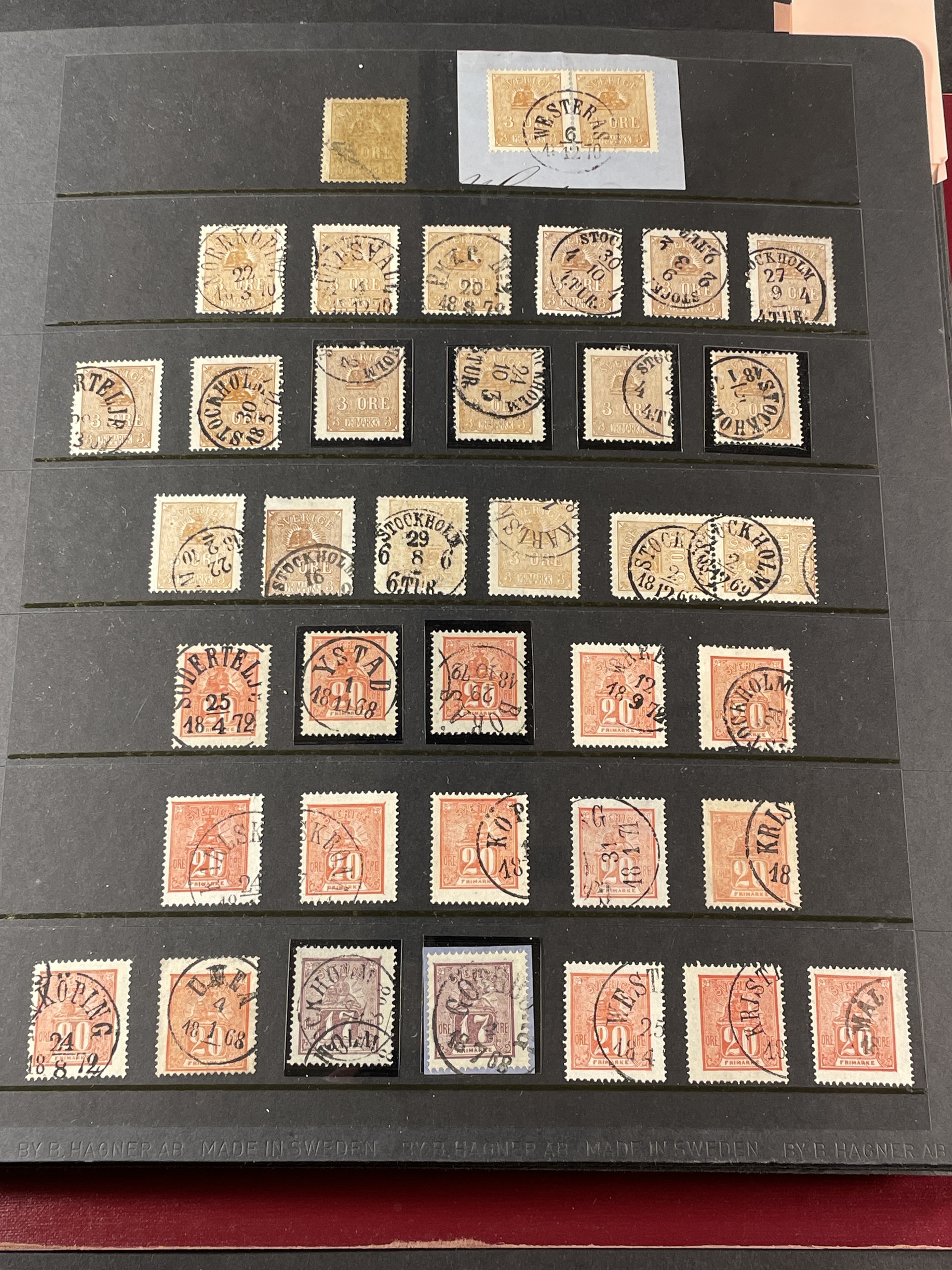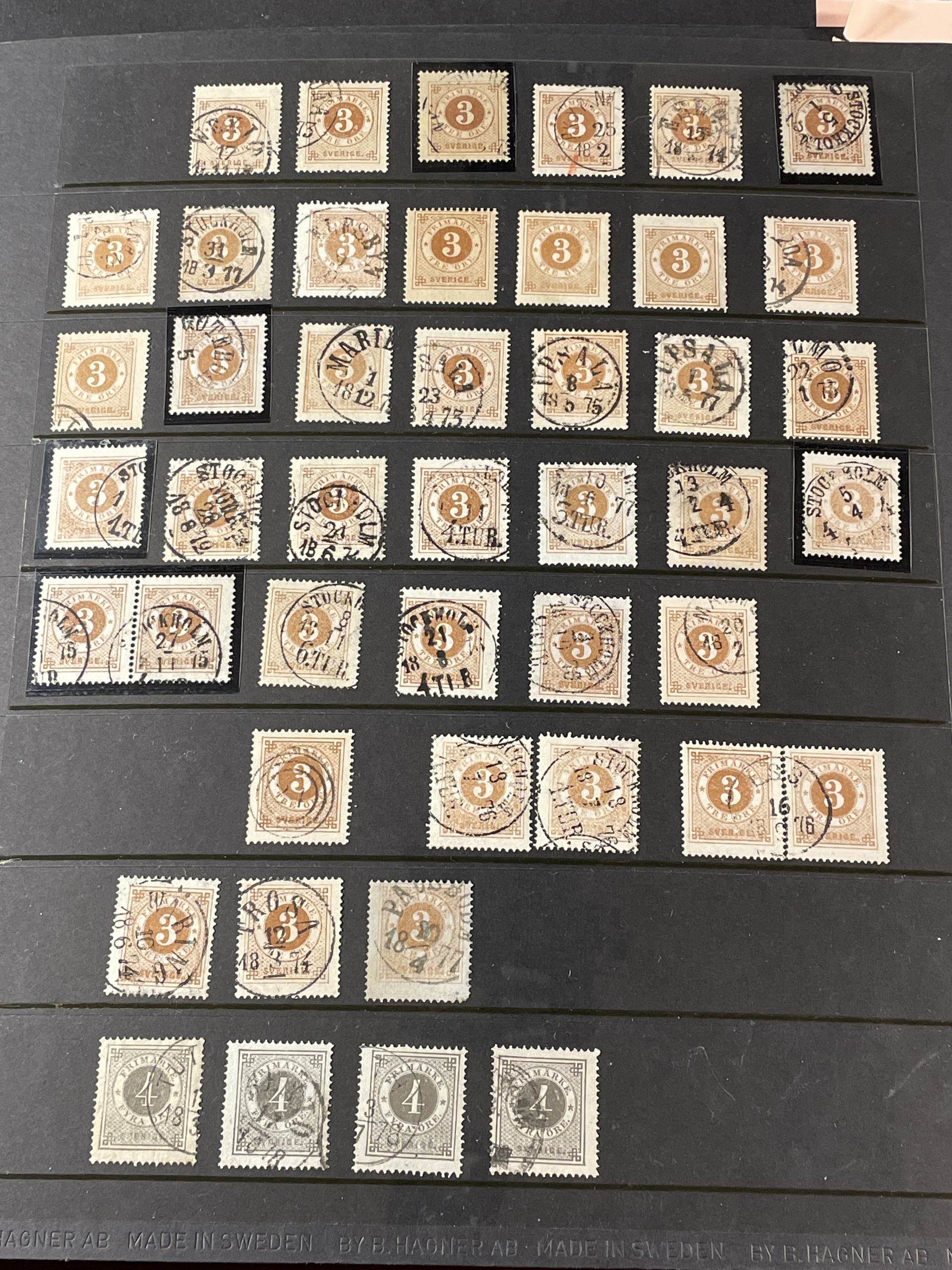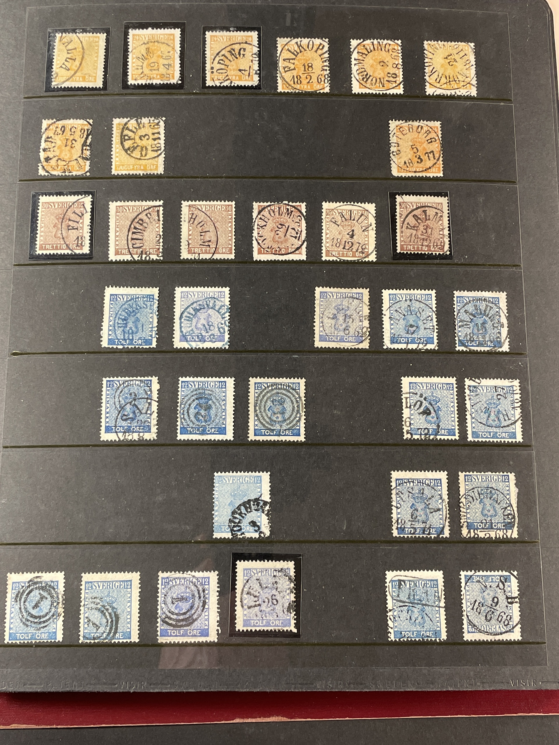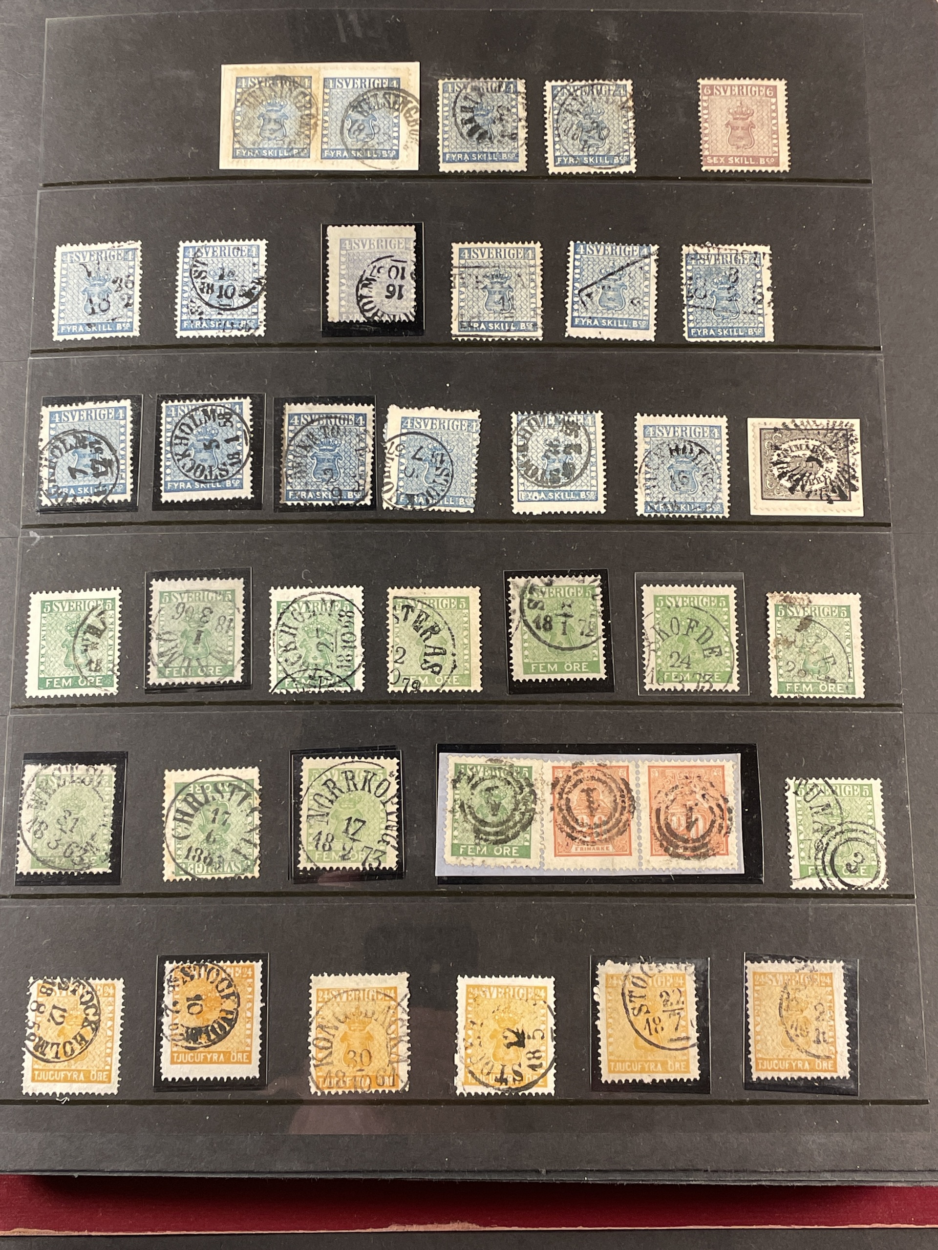 Sweden. Collection/accumulation used 1855–1880 in album. 4 skill. 16 stamps, 6 skill. E II cert. Franz Obermüller 2, 2, (1), Coat-of Arms, several beautiful, foreign canc., Lying Lion and Circle type Perf 14. Interesting collection on 50 leaves. Mostly good quality.