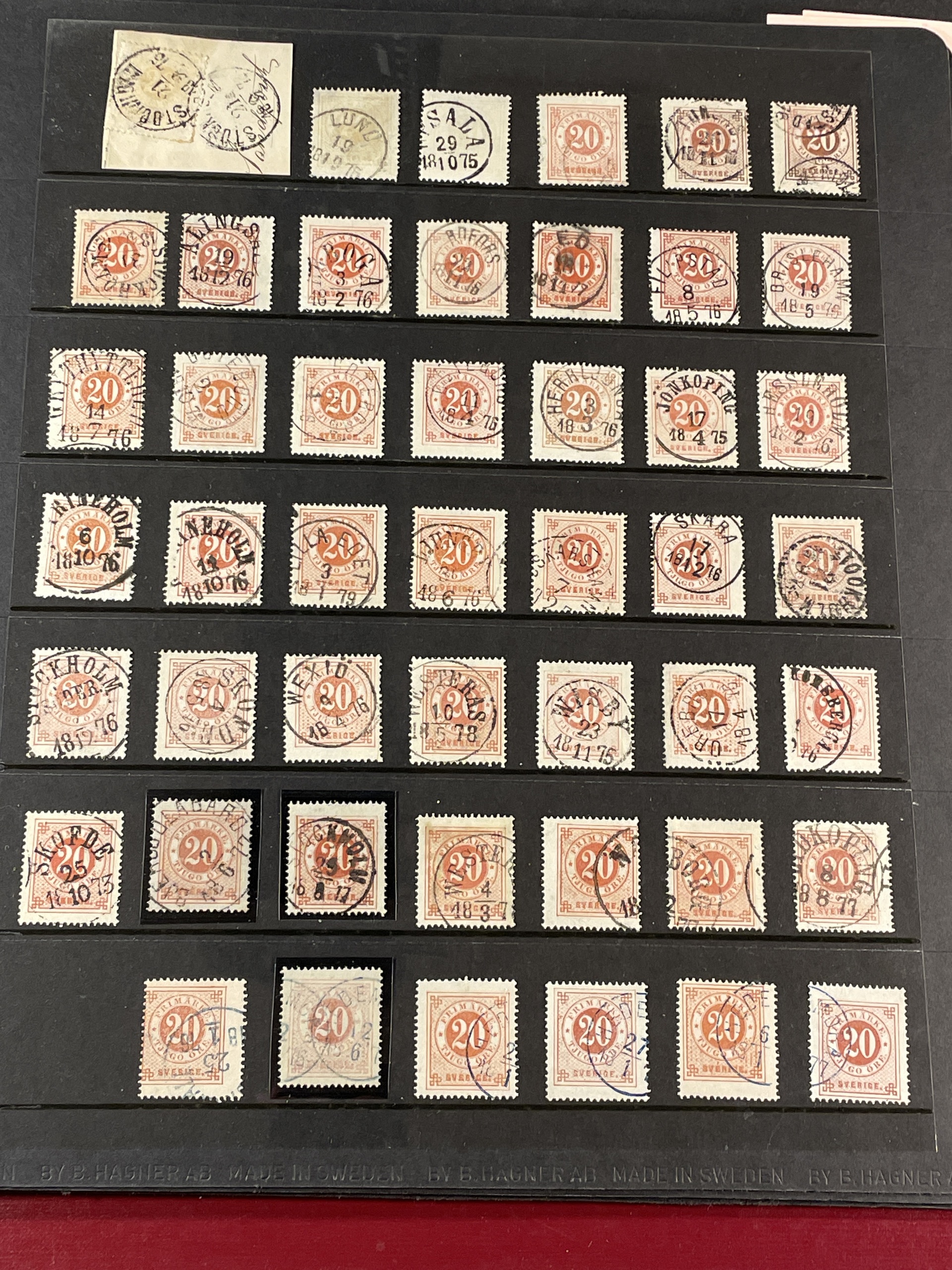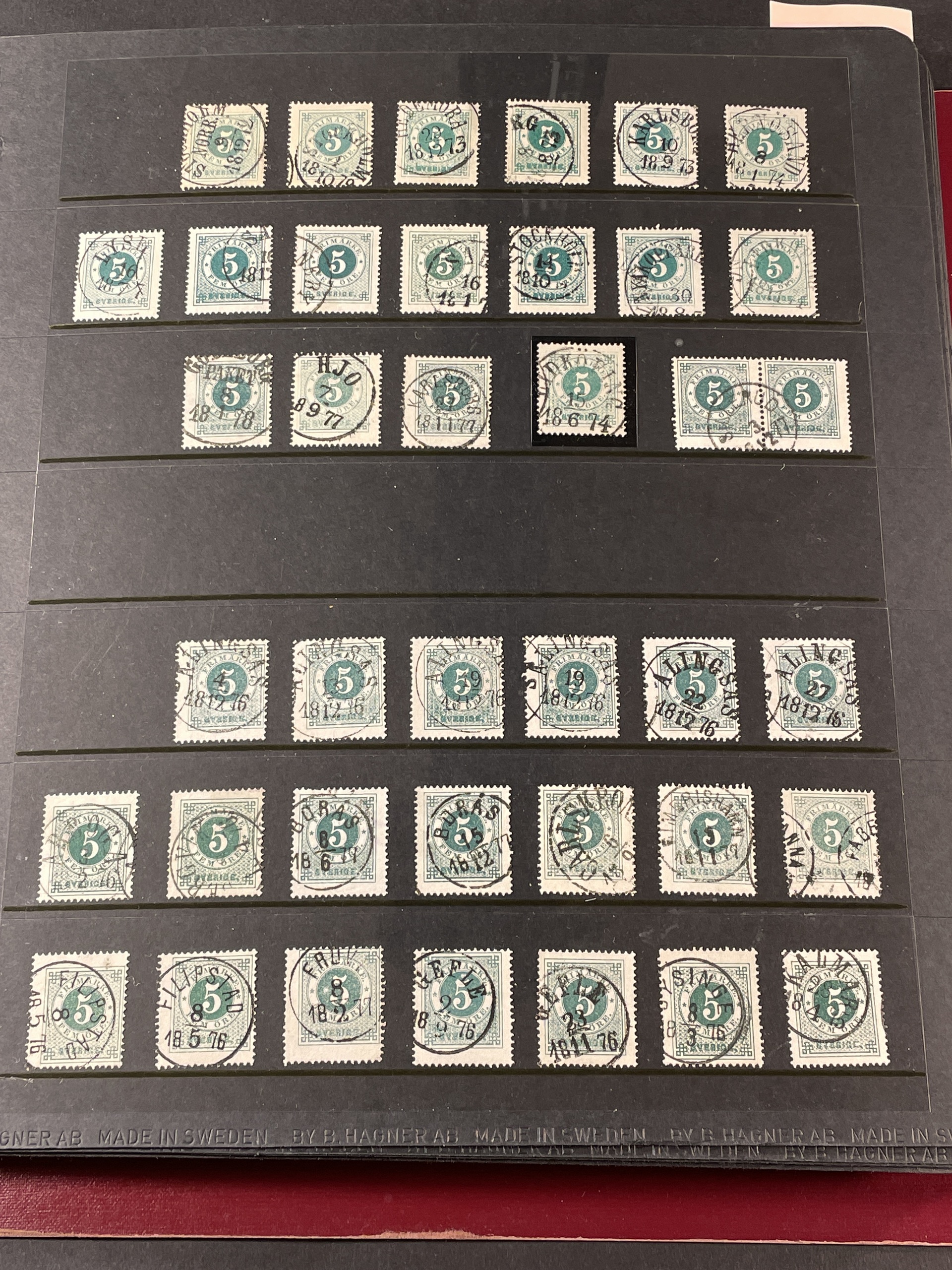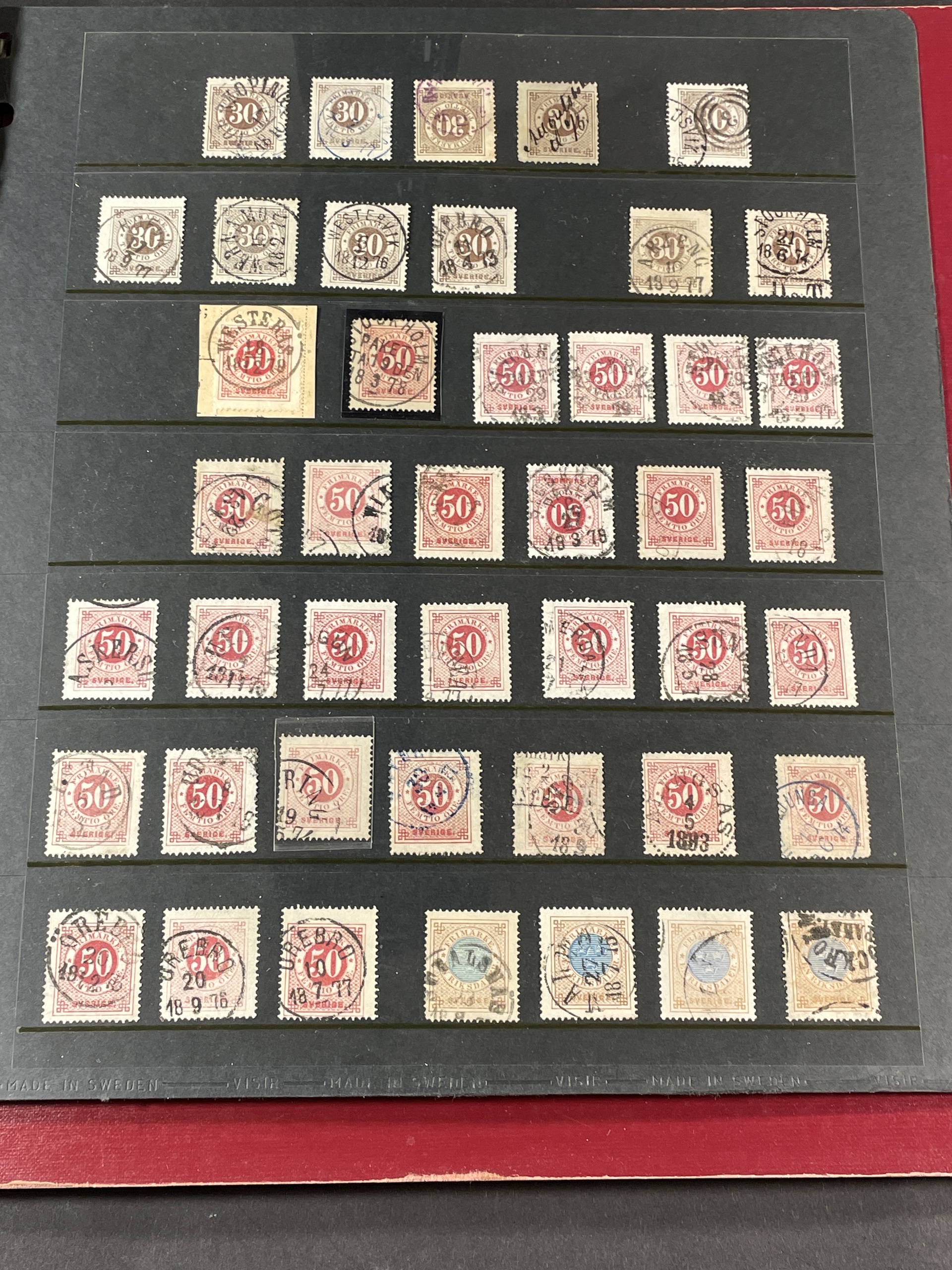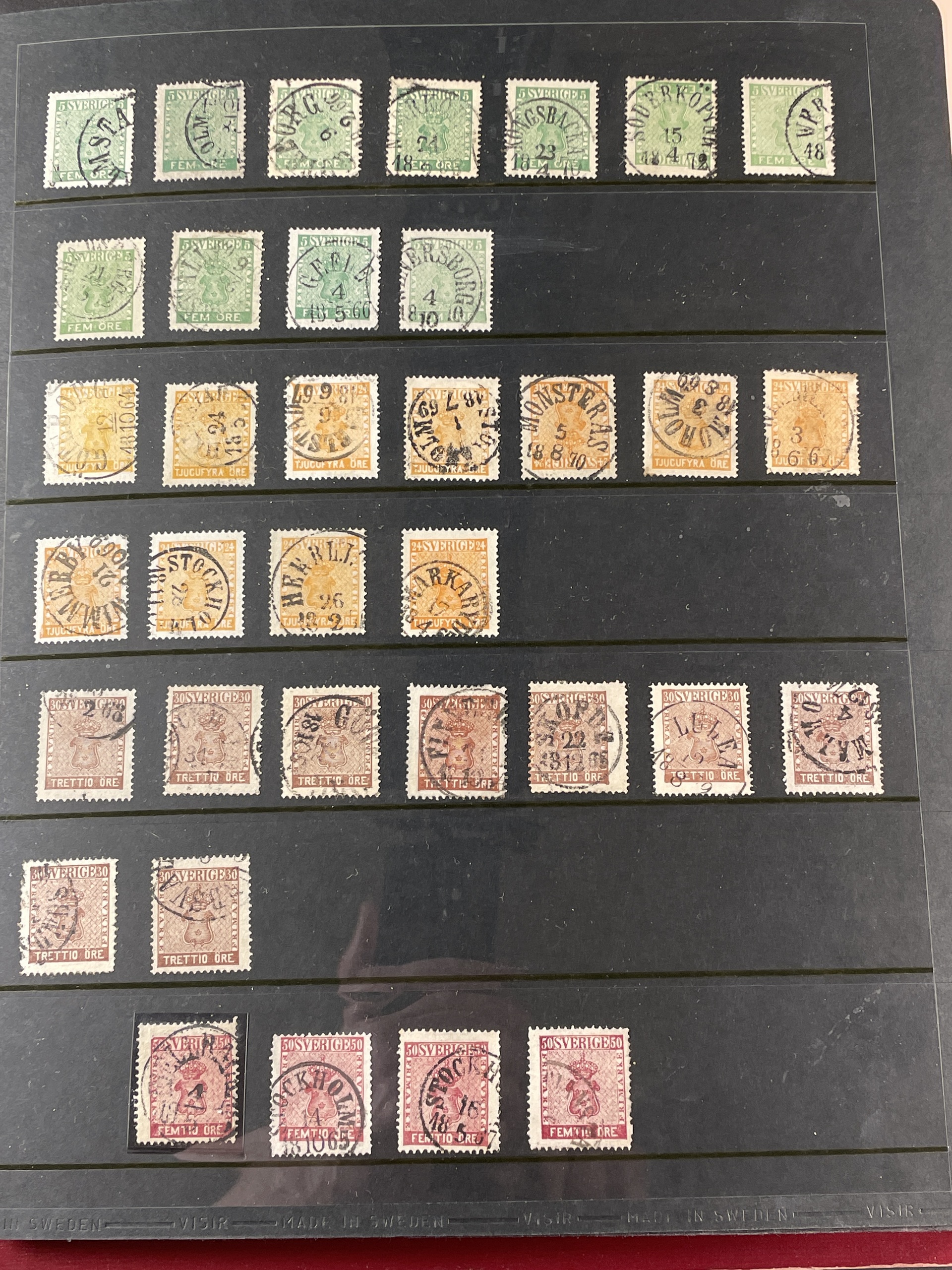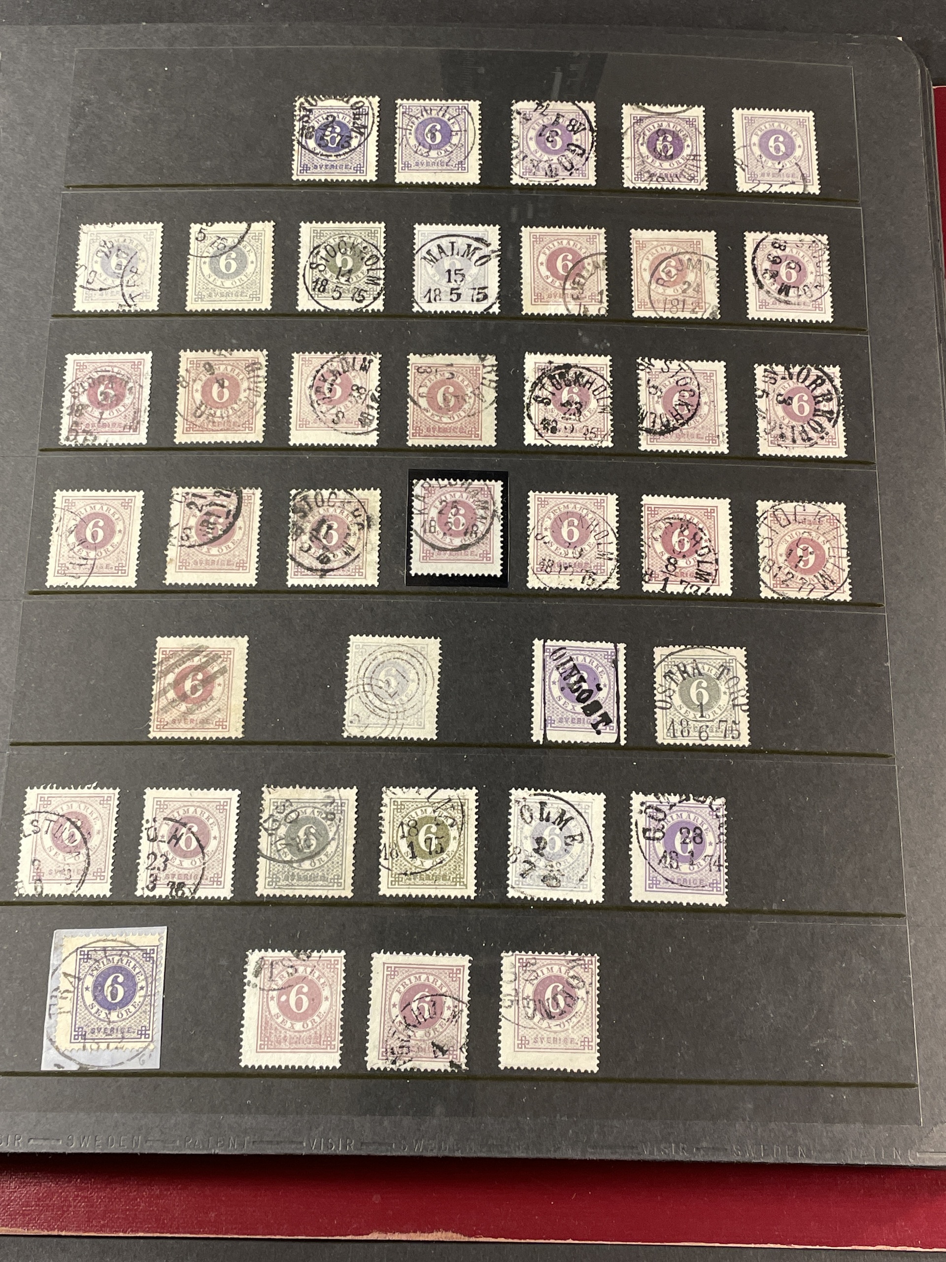 Sweden. Collection/accumulation used 1855–1880 in album. 4 skill. 16 stamps, 6 skill. E II cert. Franz Obermüller 2, 2, (1), Coat-of Arms, several beautiful, foreign canc., Lying Lion and Circle type Perf 14. Interesting collection on 50 leaves. Mostly good quality.