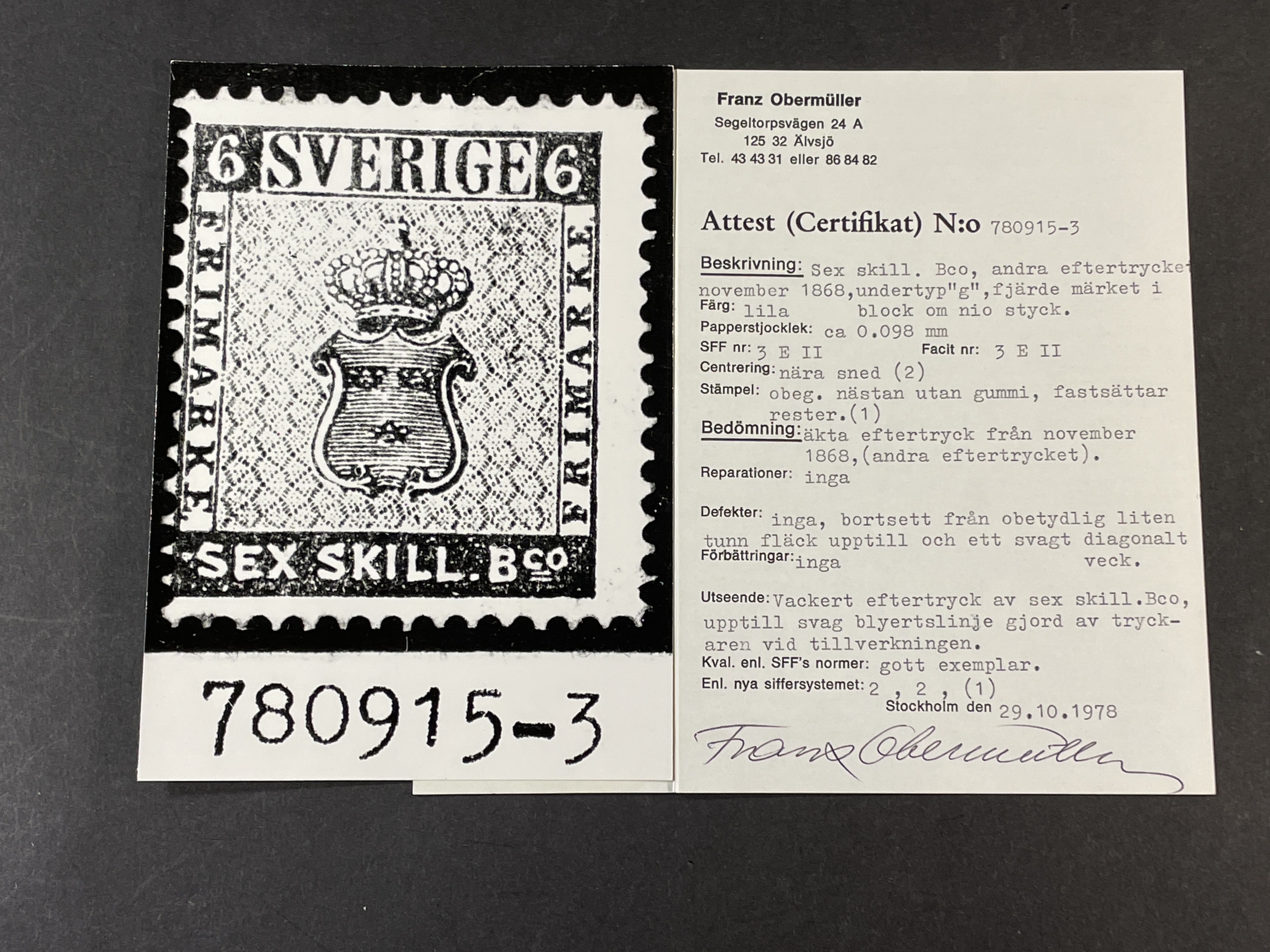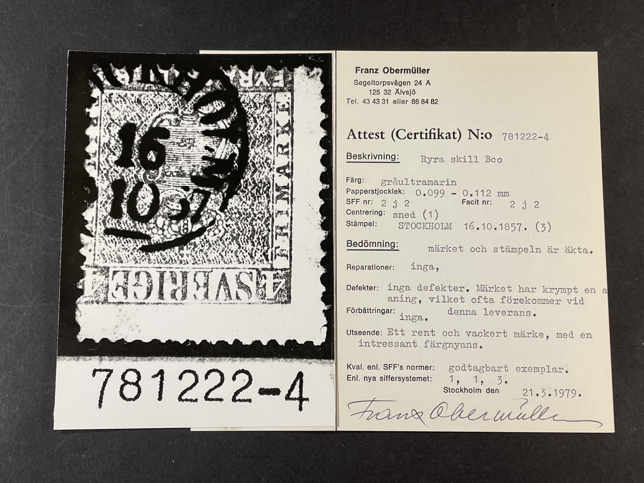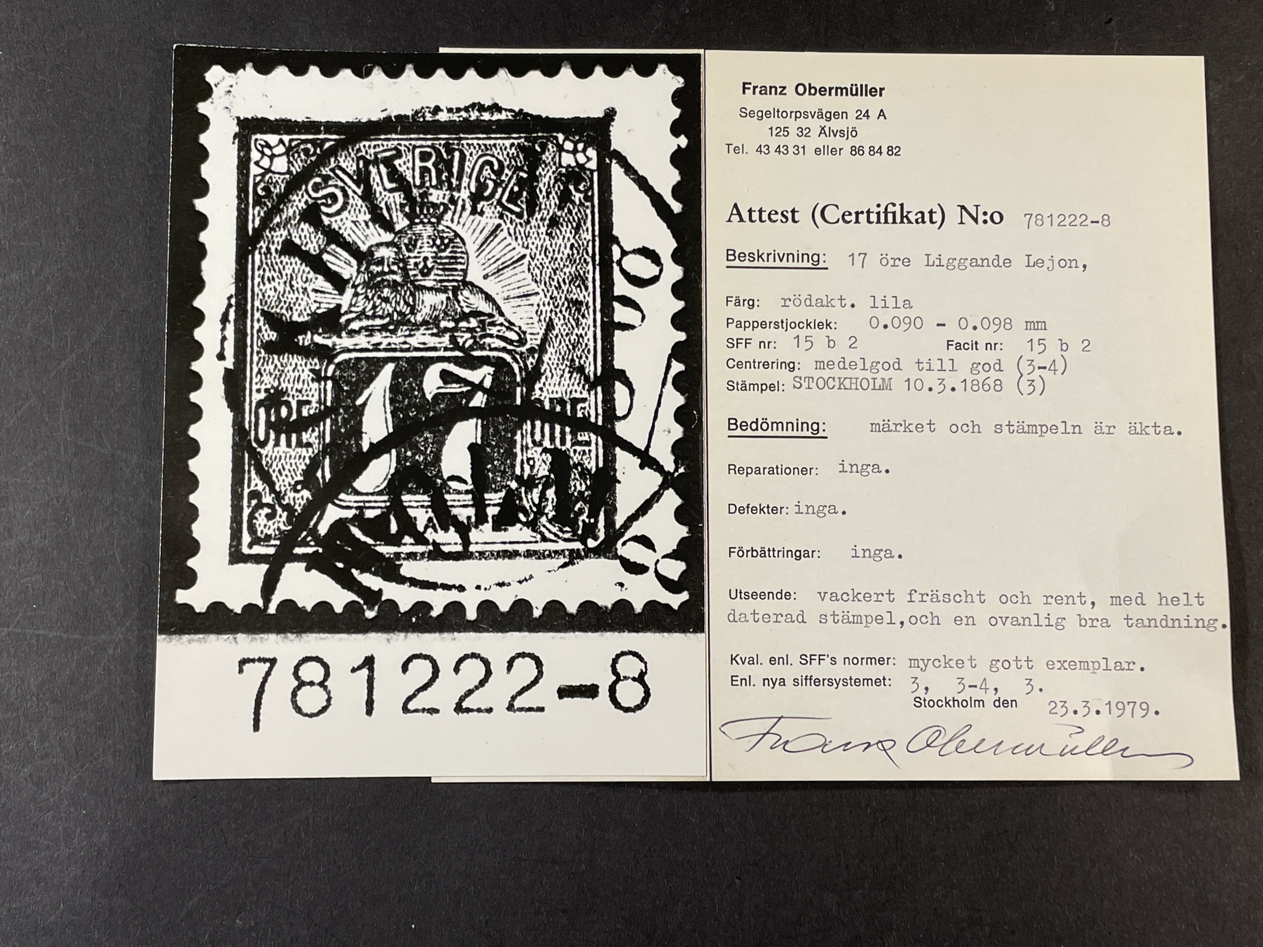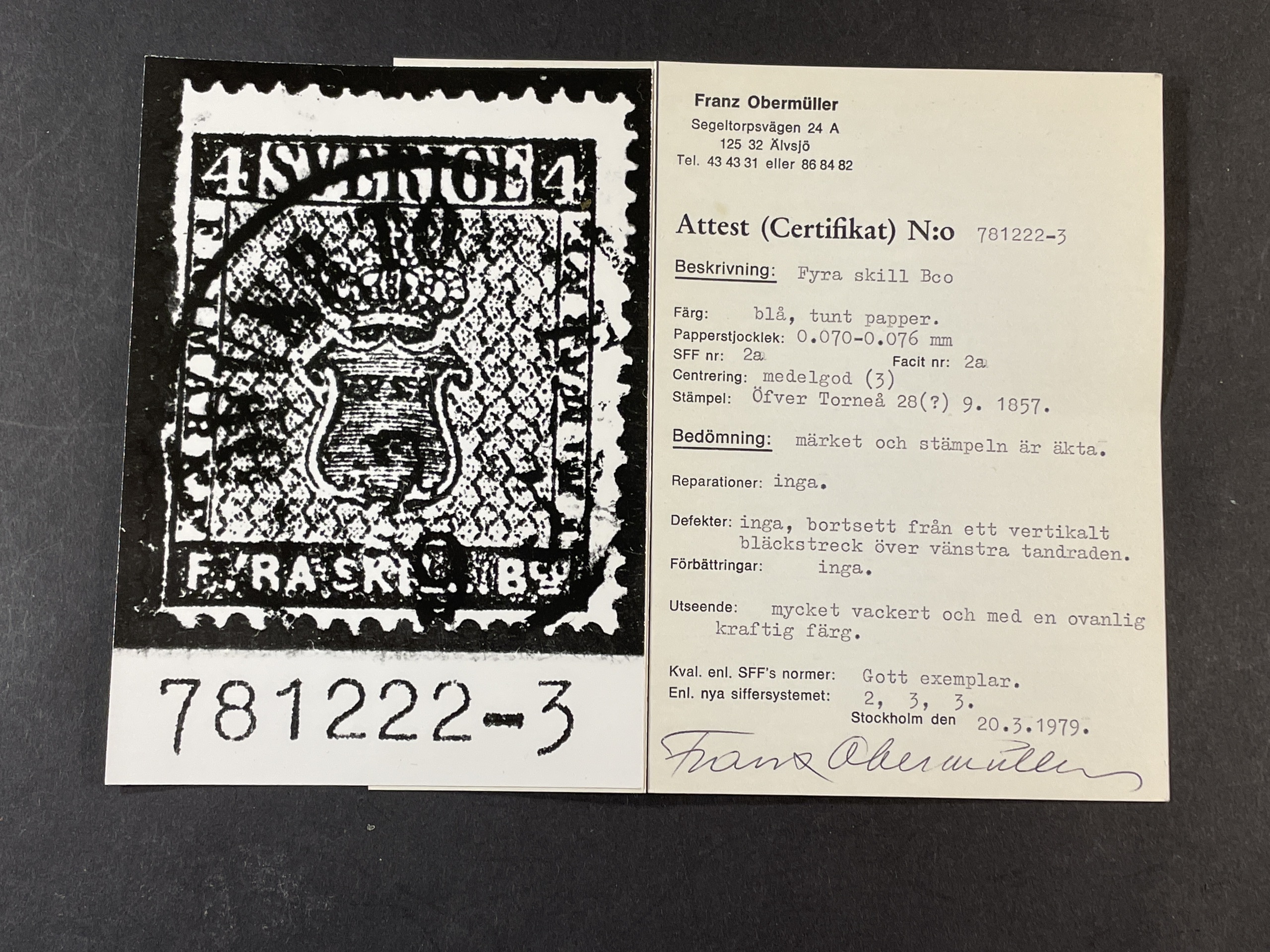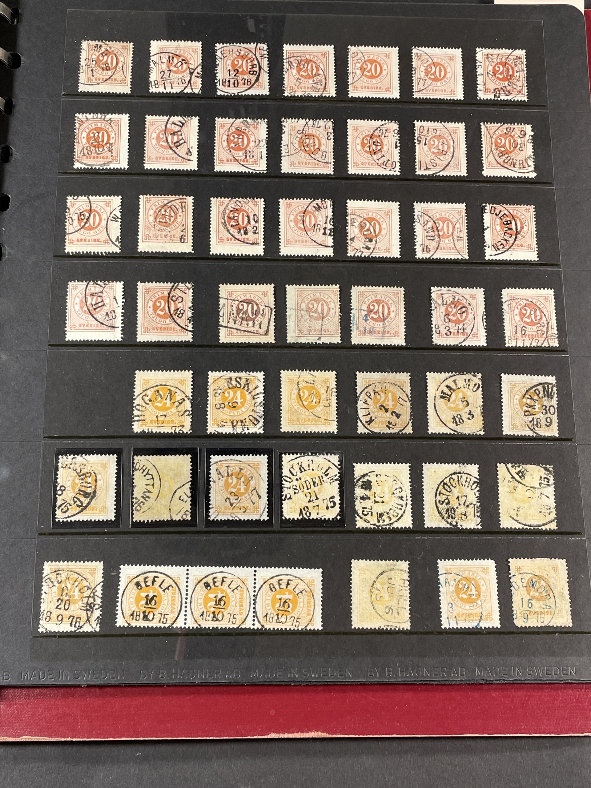 Sweden. Collection/accumulation used 1855–1880 in album. 4 skill. 16 stamps, 6 skill. E II cert. Franz Obermüller 2, 2, (1), Coat-of Arms, several beautiful, foreign canc., Lying Lion and Circle type Perf 14. Interesting collection on 50 leaves. Mostly good quality.