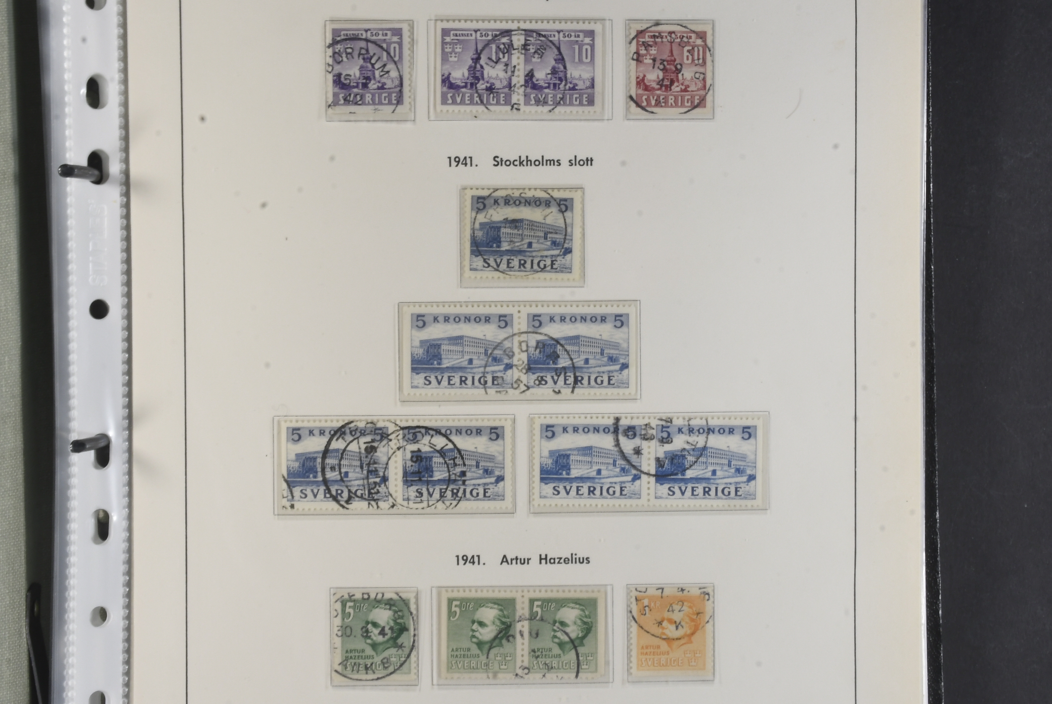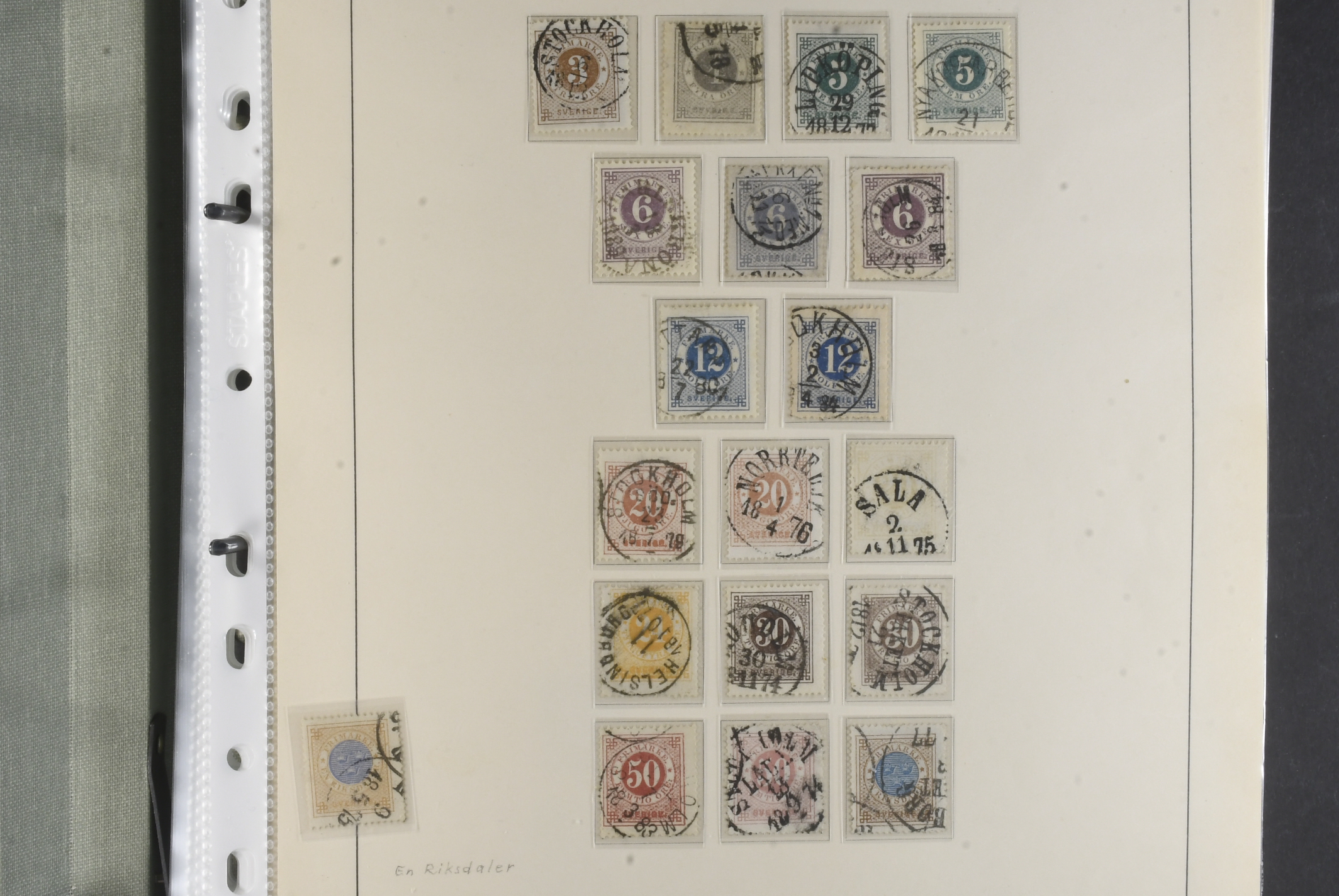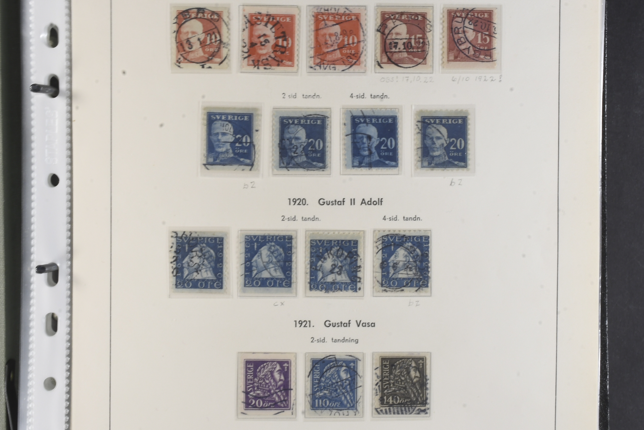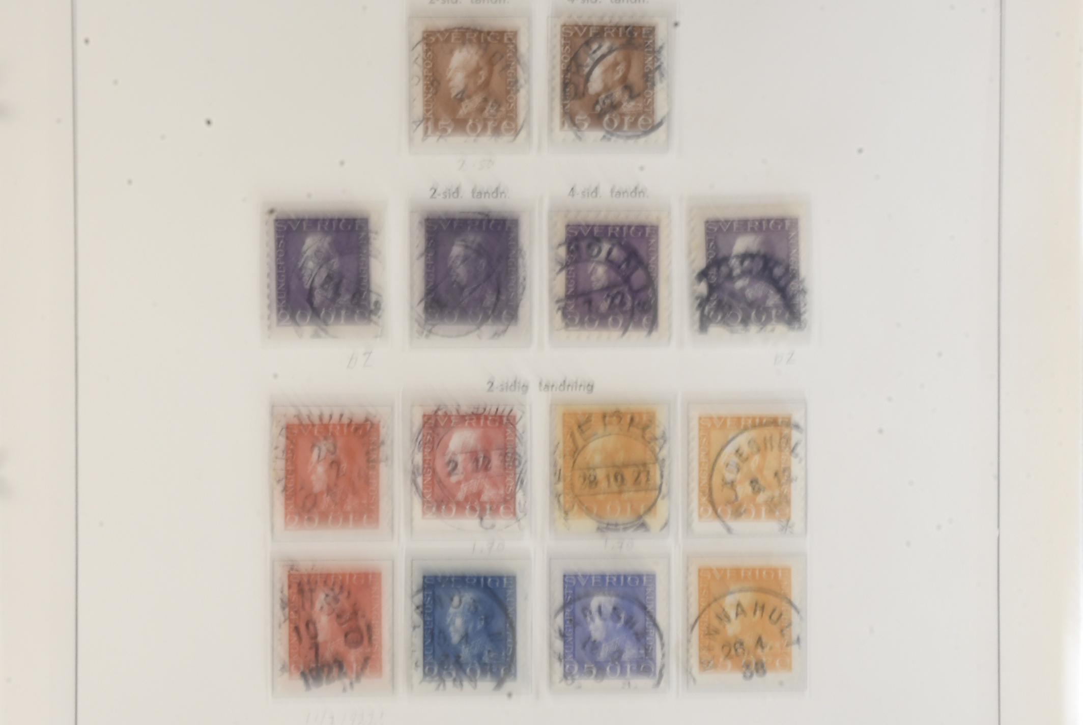 Sweden. Collection used 1855–1960 in album. Starts with one copy of F2. From 1862 almost complete, incl many BC-/CB-pairs.The coil stamp period well represented. Many fine–excellent cancellations observed. Please explore. Please see a selection of scans at www.philea.se. Fine quality. (>500)