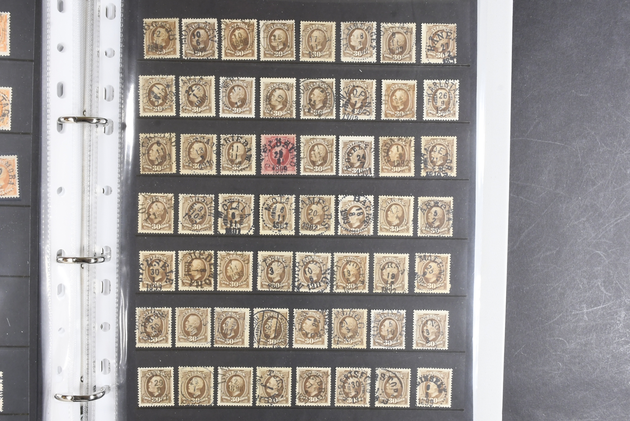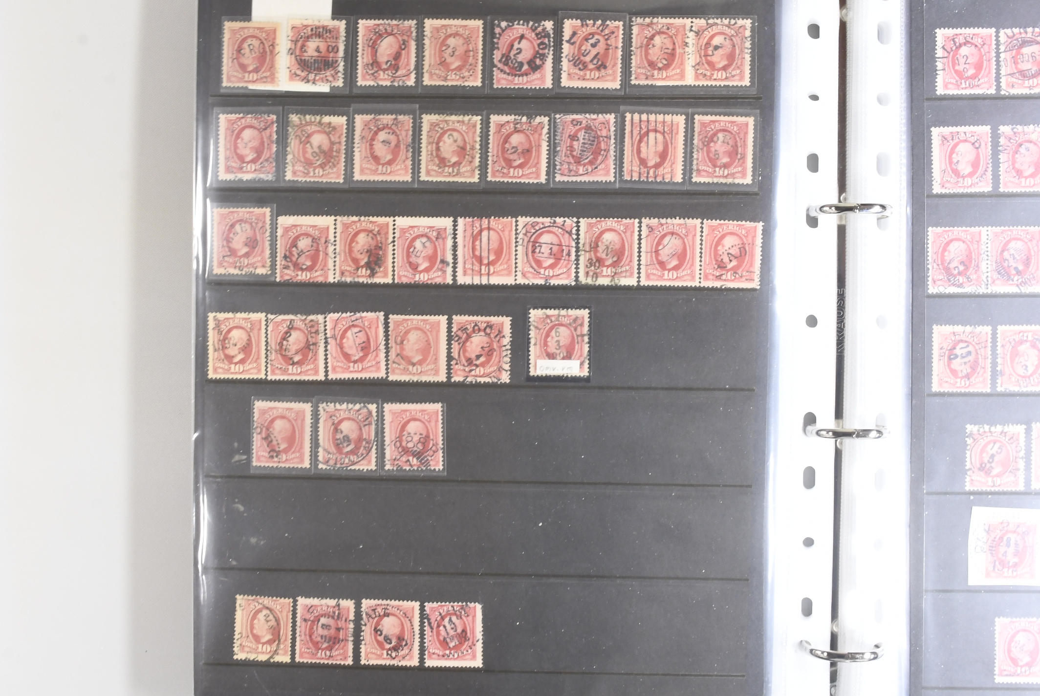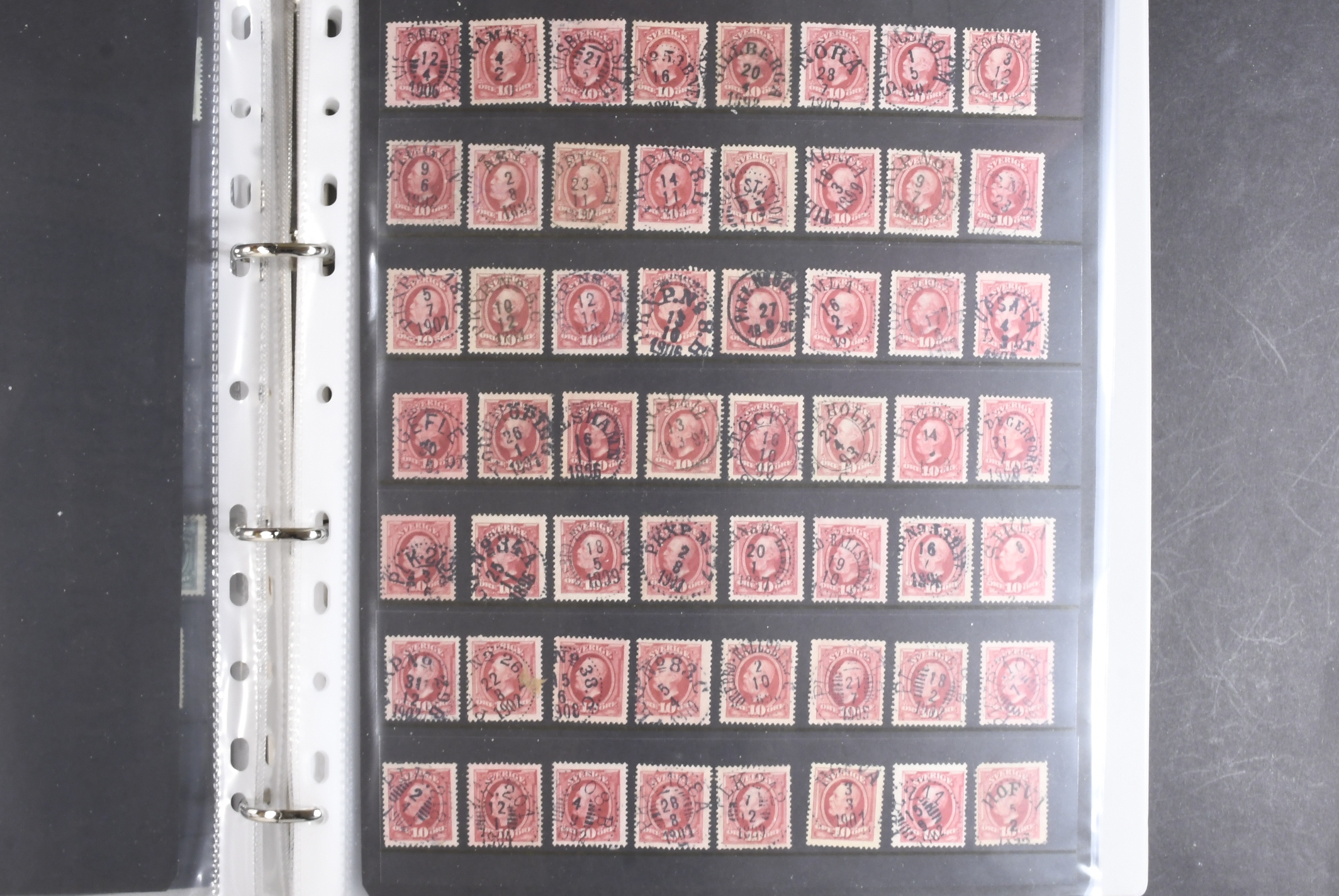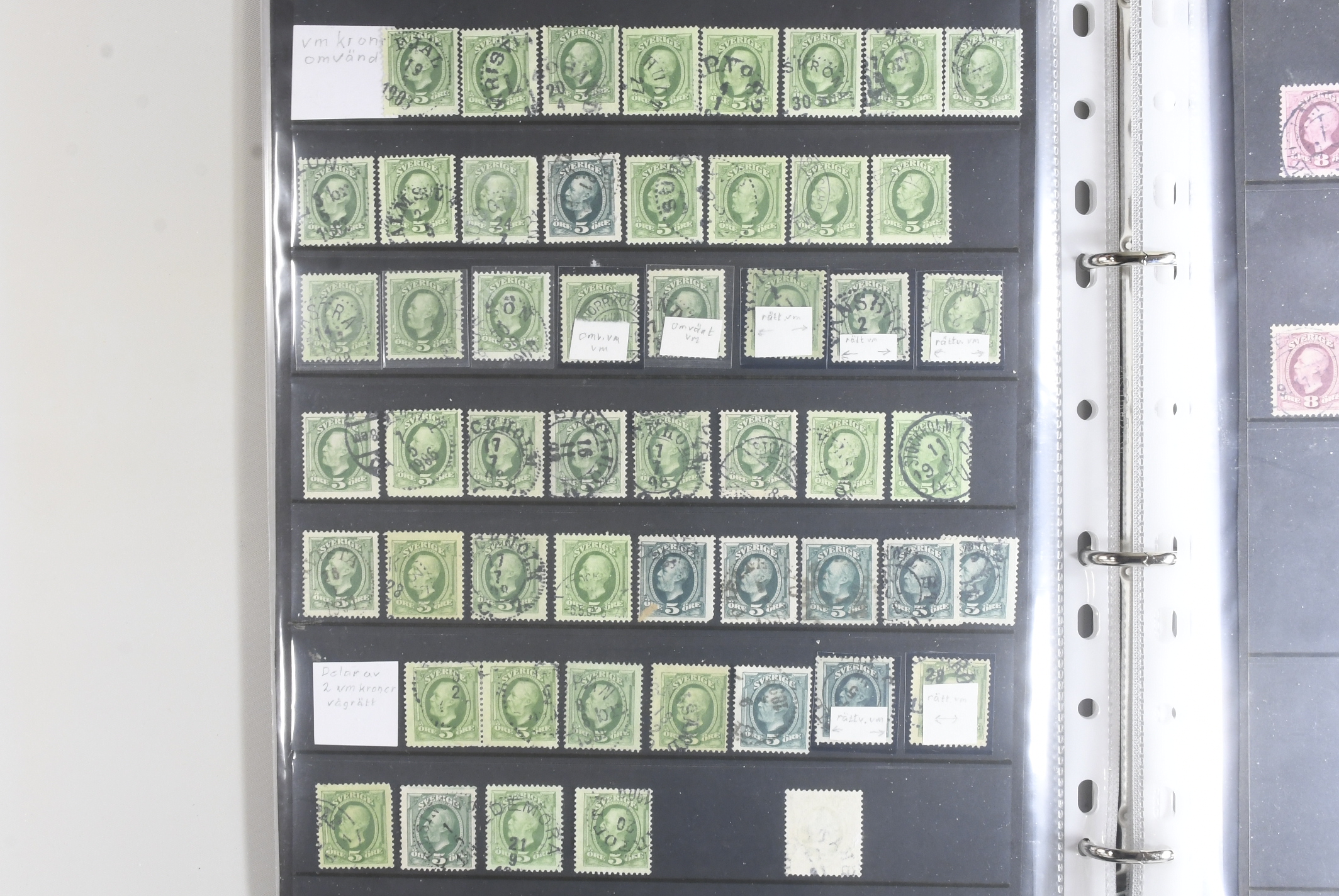 Sweden. Collection/accumulation used 1872–1891 in stockbook. Circle type (all three versions) and Bi-coloured Numeral Type. Study material concerning shades, printings, printing errors, etc. A number of fine – excellent cancellations observed. Please see a selection of scans at www.philea.se. Mostly good quality. (>1000)
