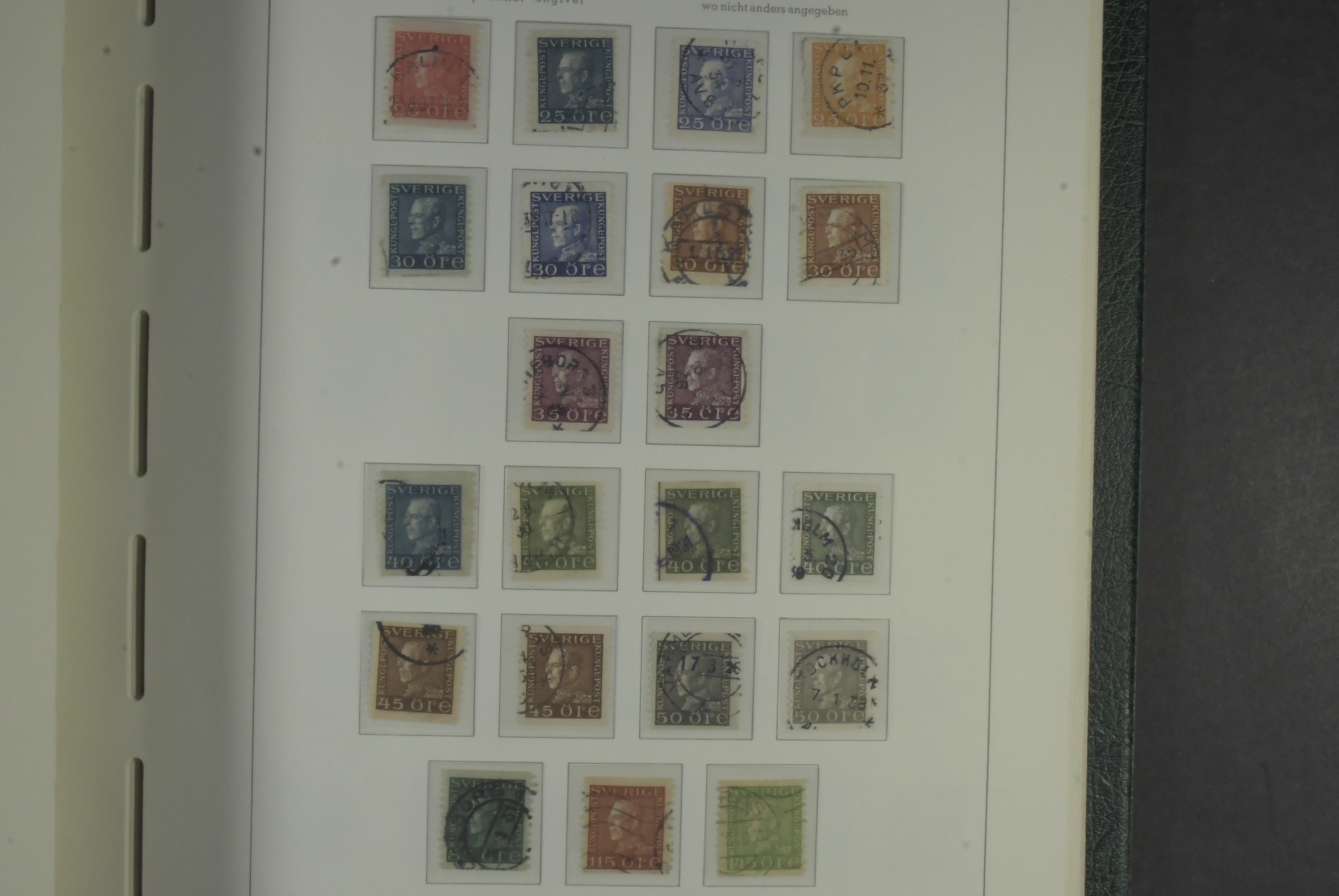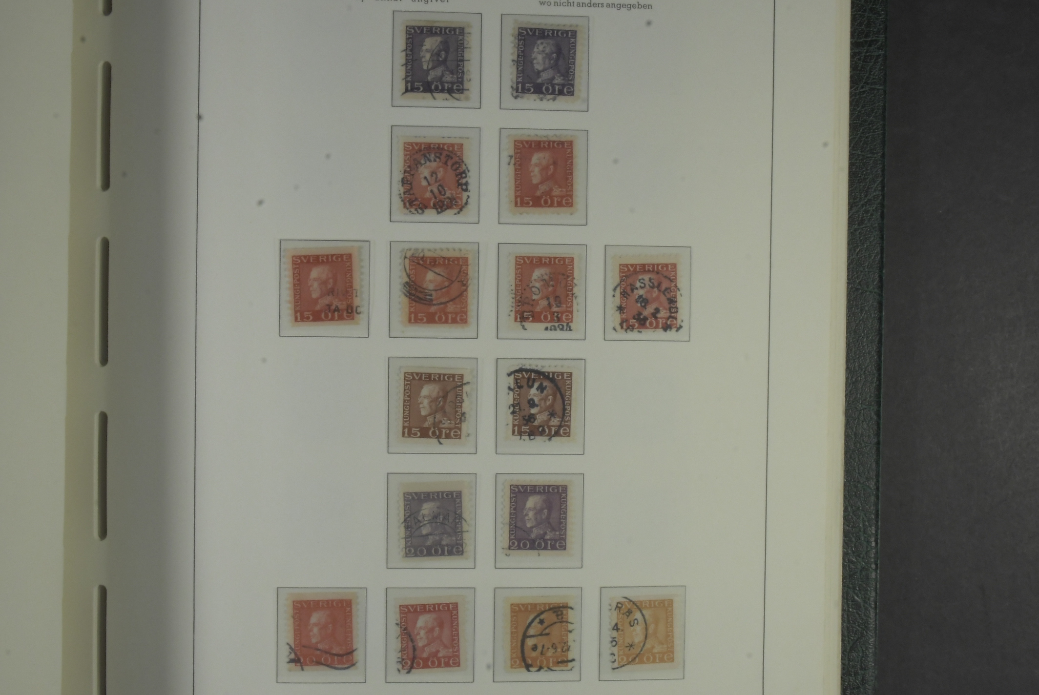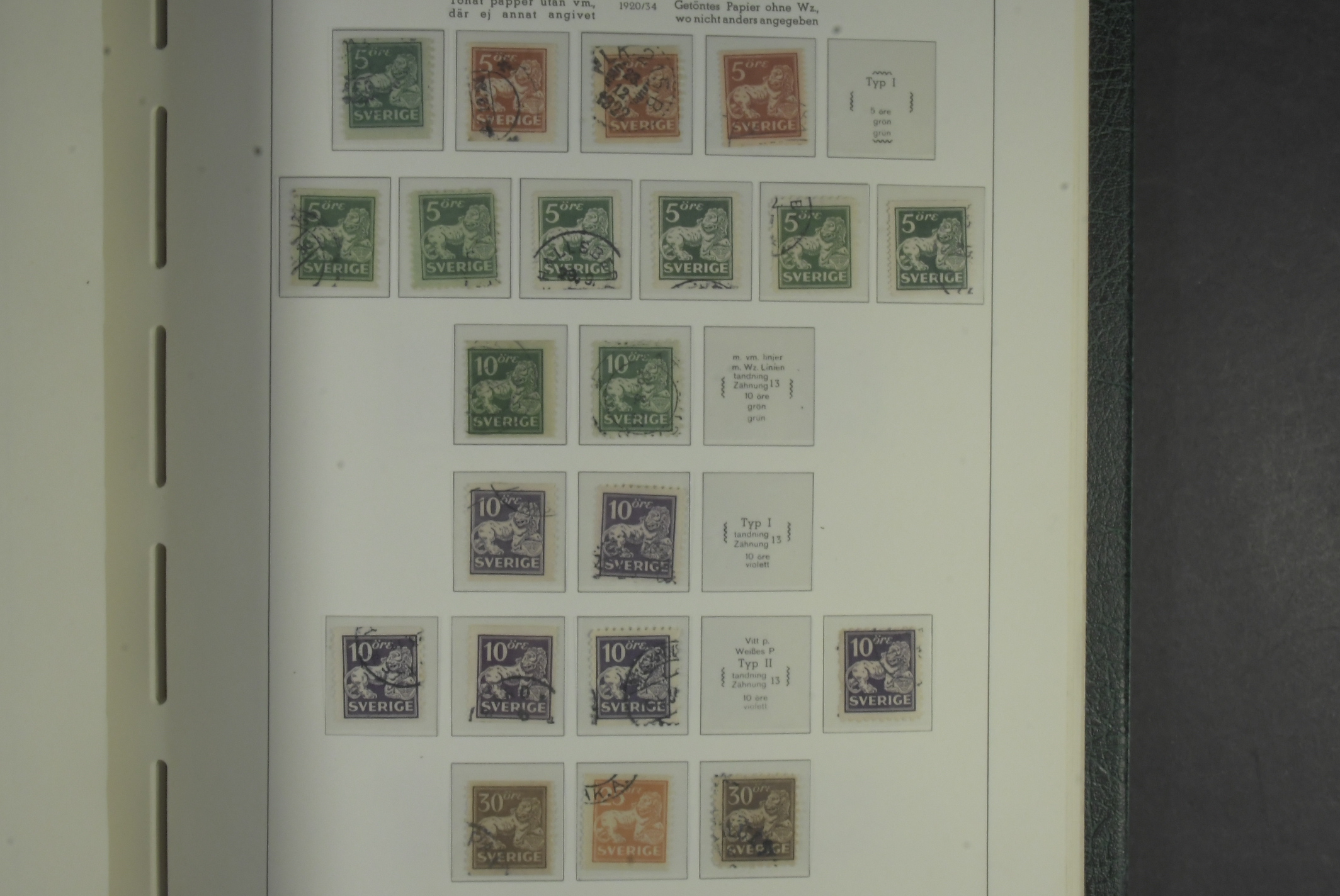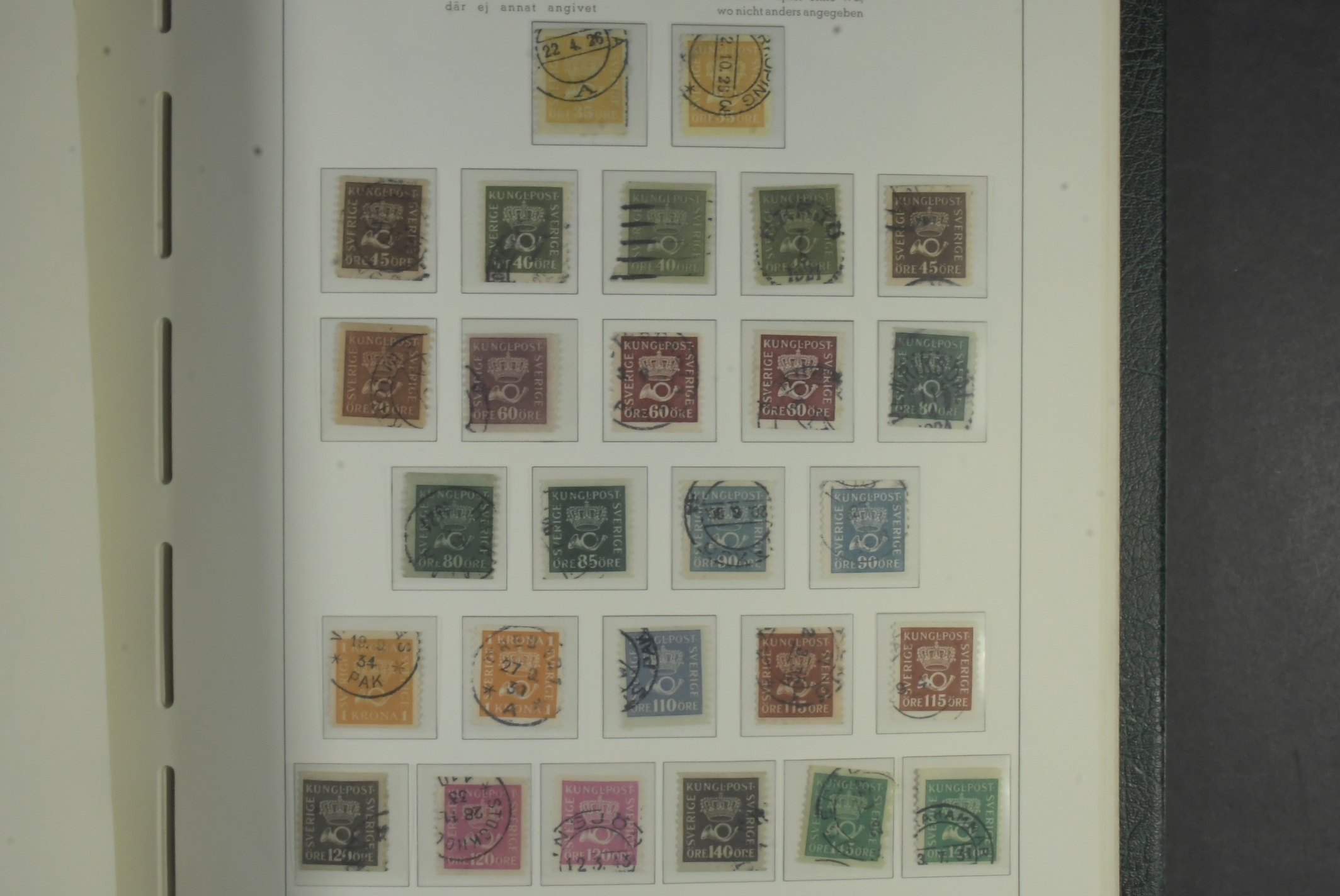 Sweden. Used 1862–1957 in Leuchtturm album with stamp mounts. Green album covering 1855–1957 as new. Many sets. Mostly good quality. (400)