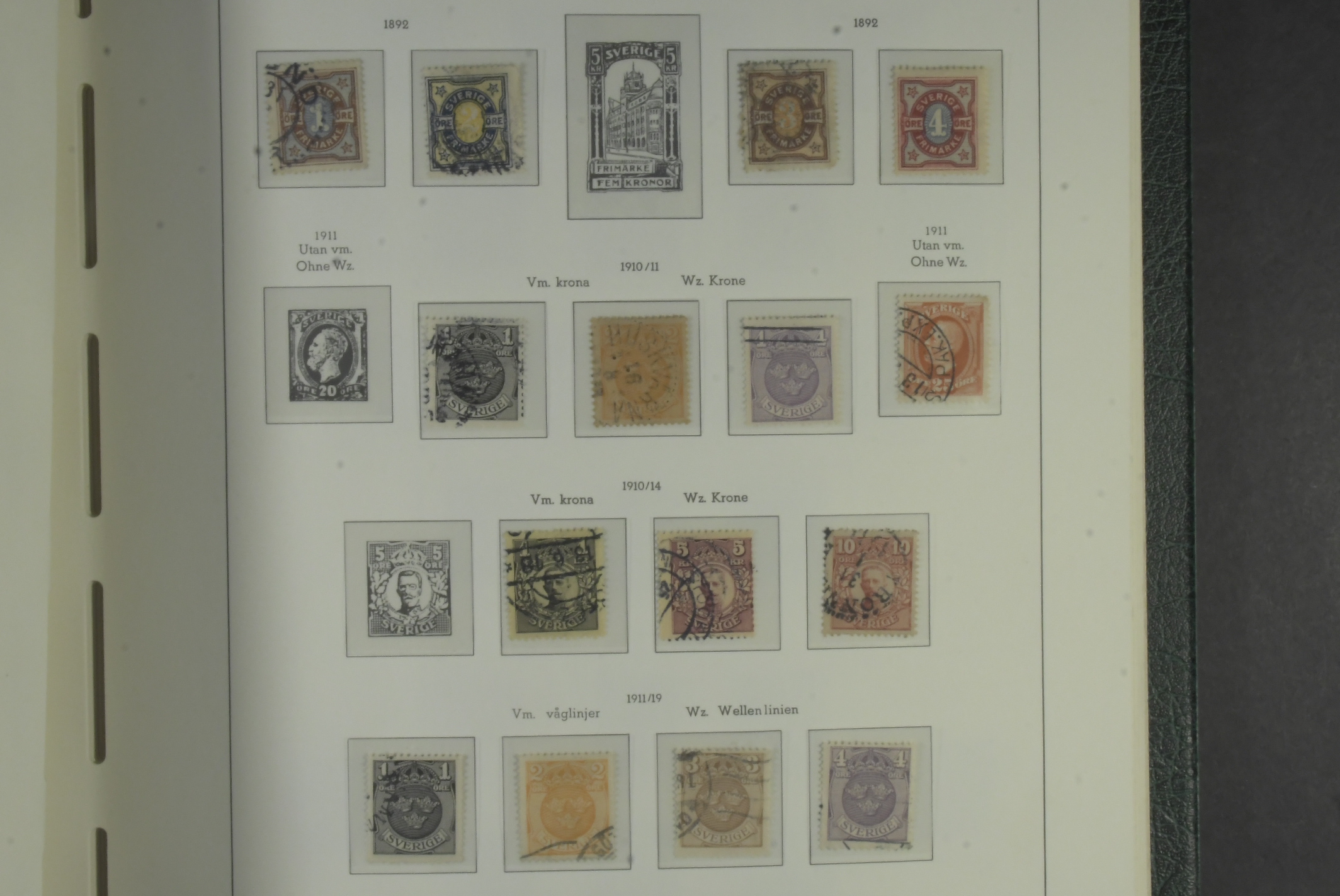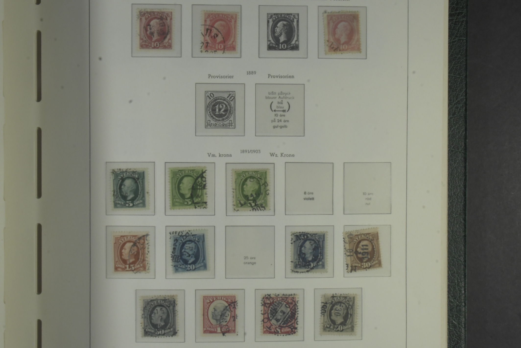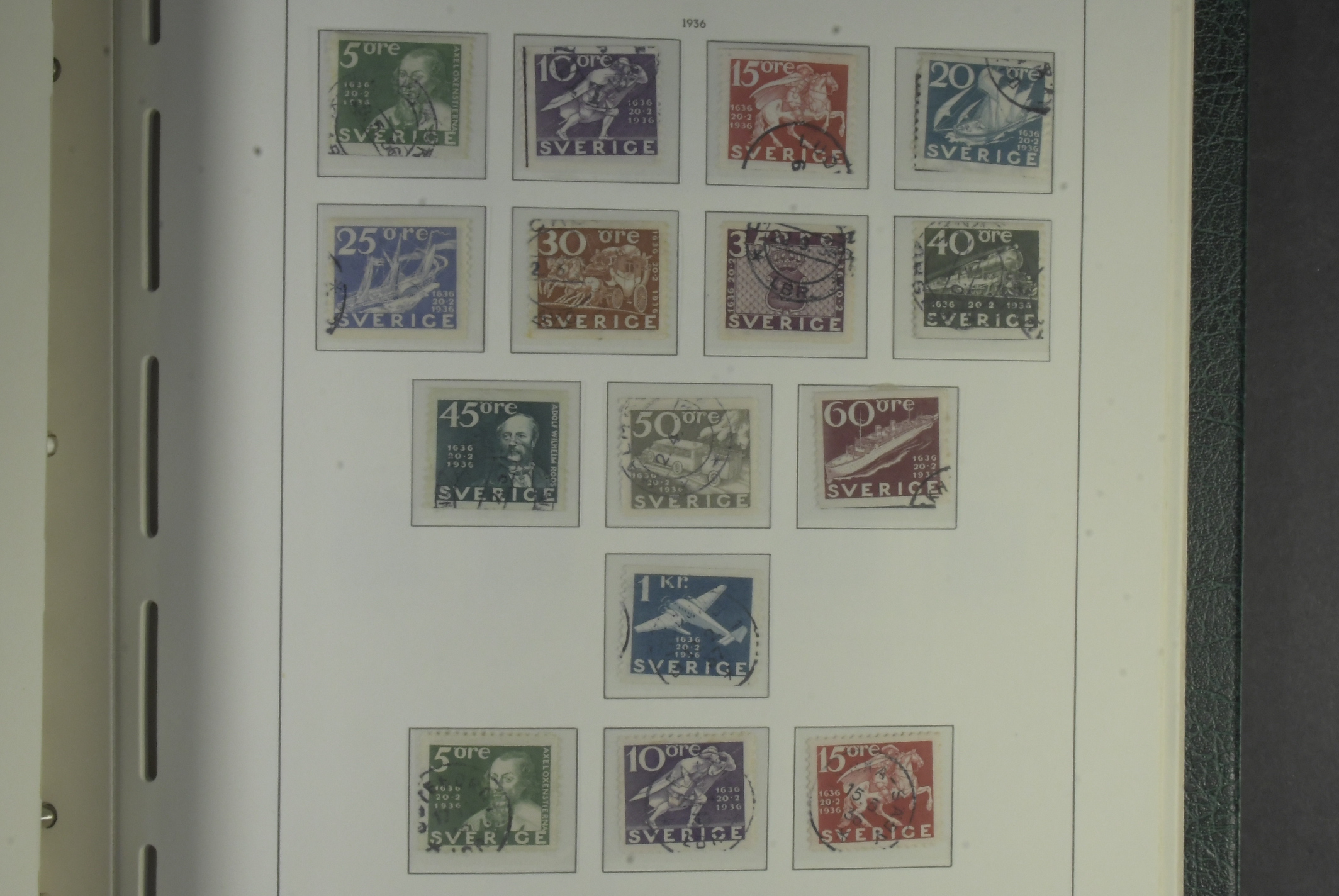 Sweden. Used 1862–1957 in Leuchtturm album with stamp mounts. Green album covering 1855–1957 as new. Many sets. Mostly good quality. (400)