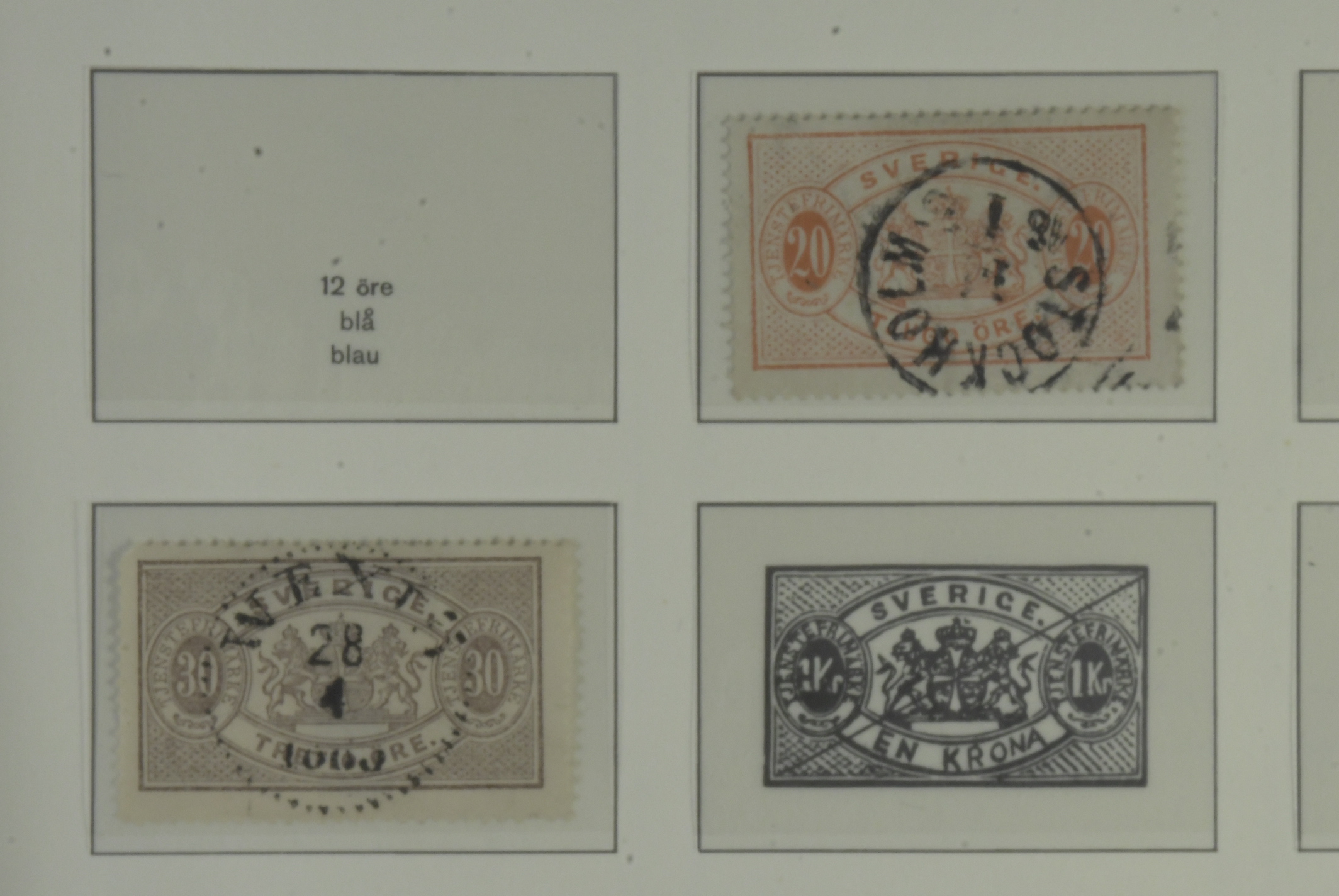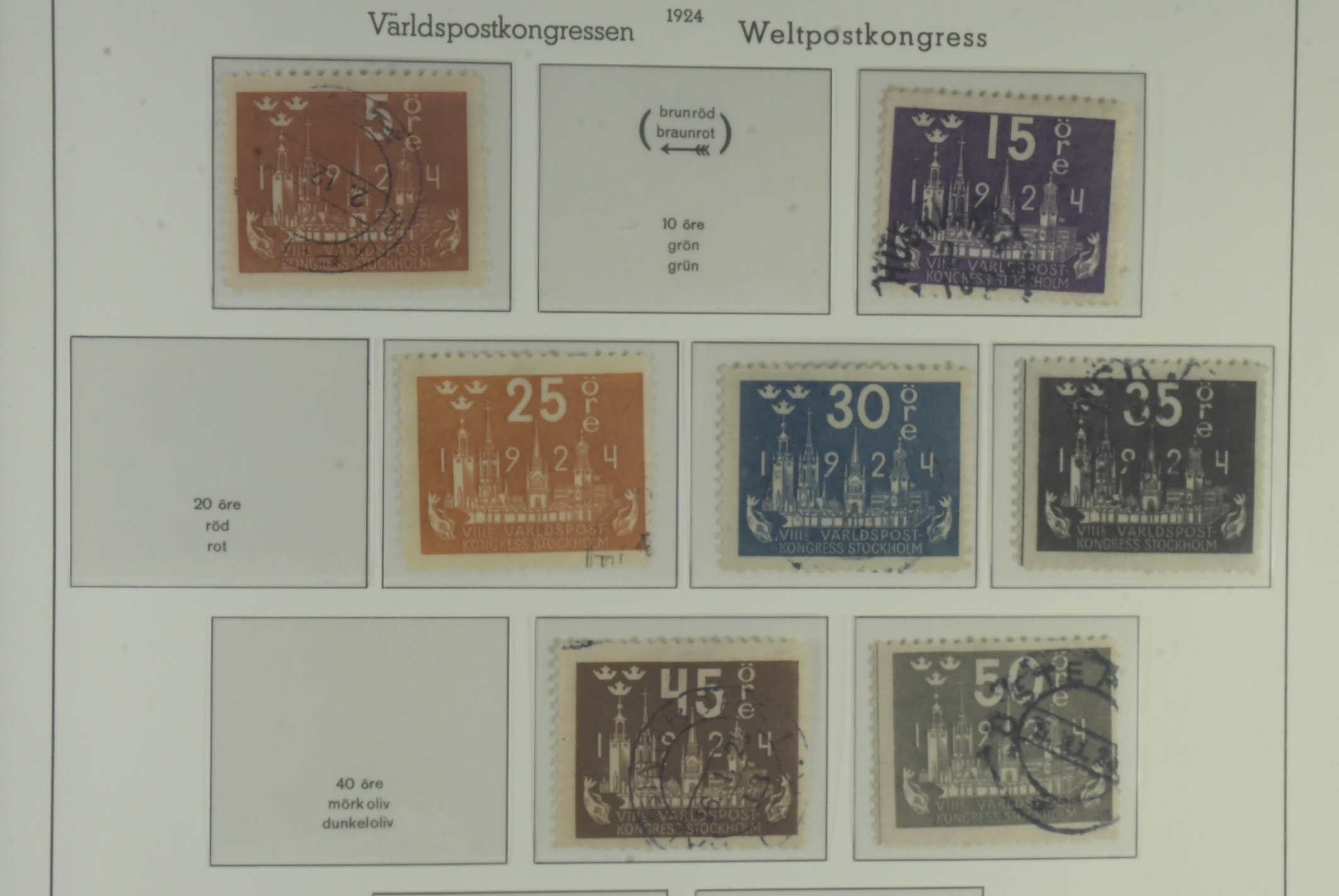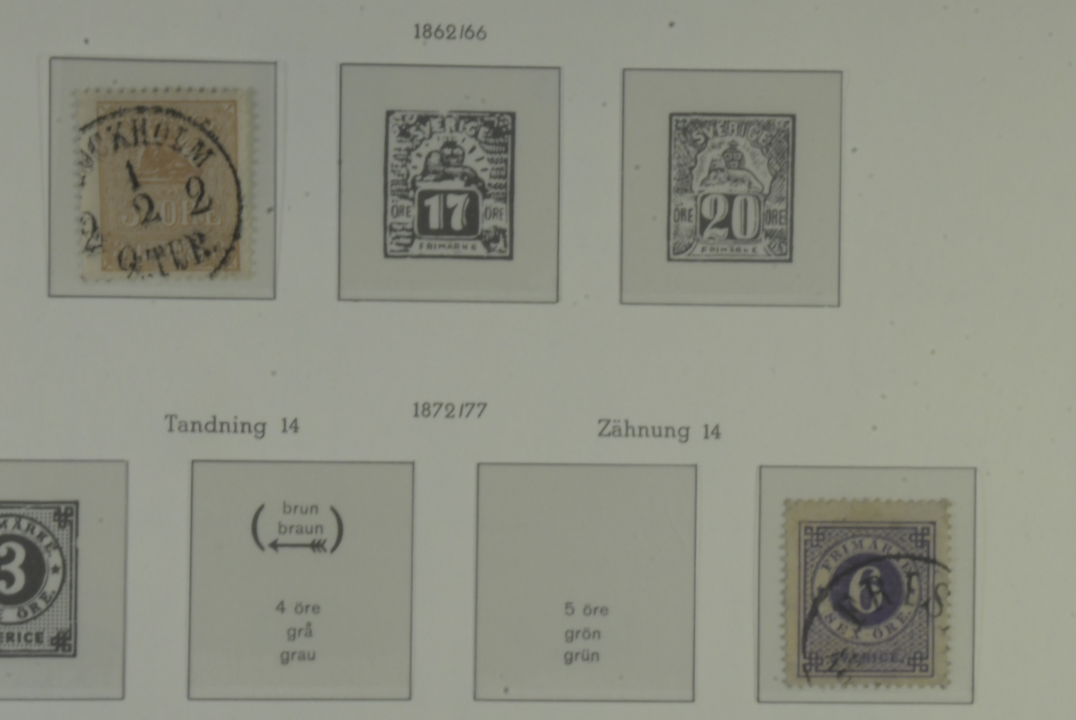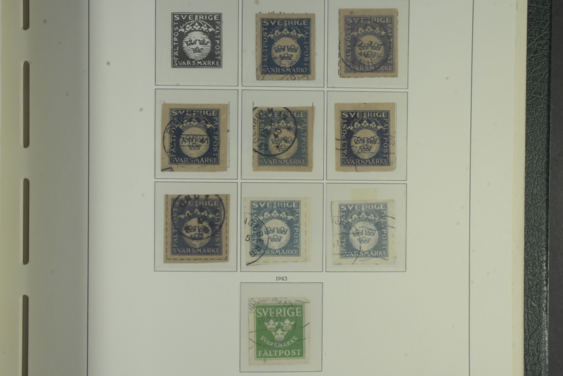 Sweden. Used 1862–1957 in Leuchtturm album with stamp mounts. Green album covering 1855–1957 as new. Many sets. Mostly good quality. (400)