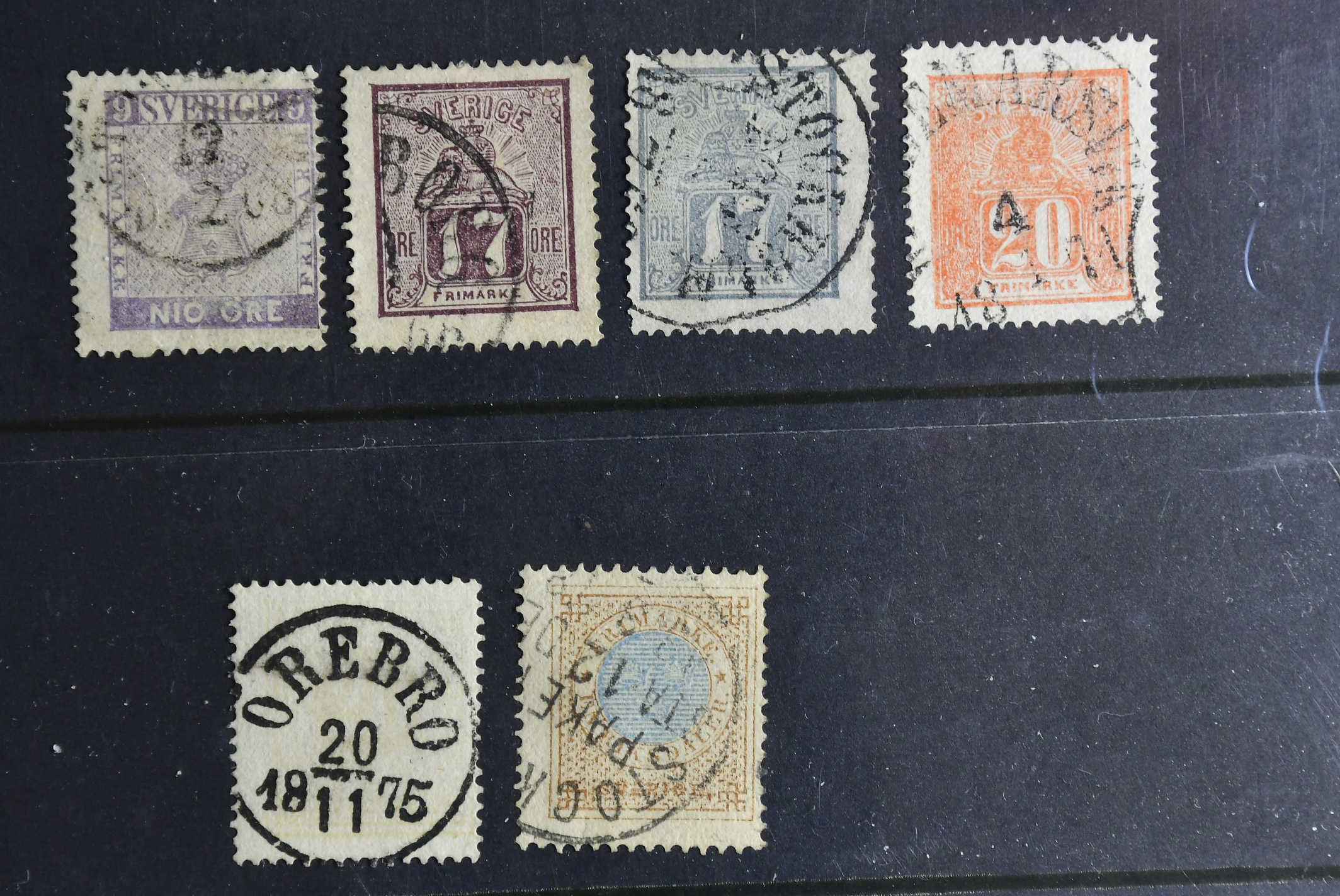 Sweden. Lot used. Six stamps: F no.: 8, 15, 15c, 16, 22f and 37. Very mixed quality.