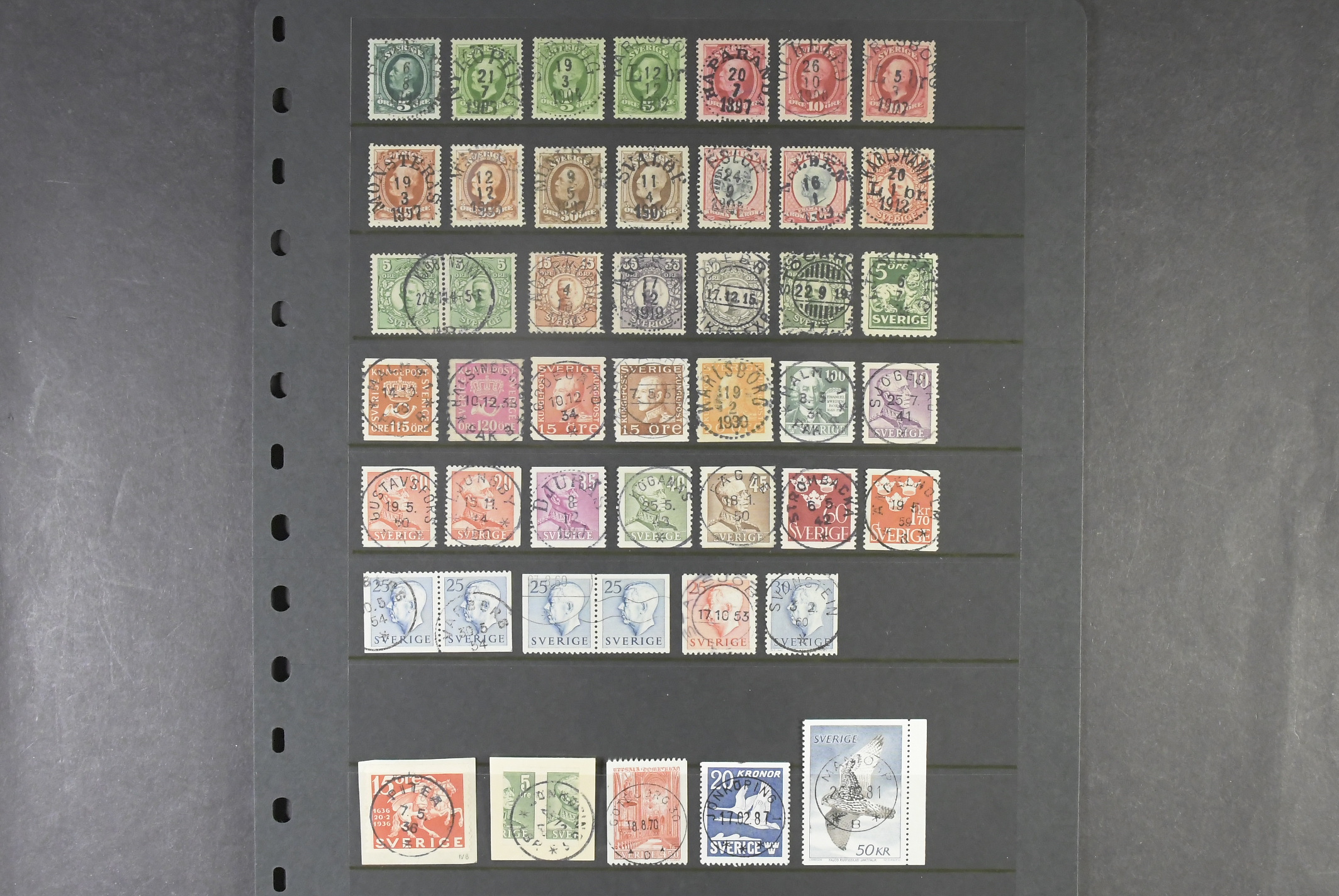 Sweden. Collection used mostly OSCAR II–1950s on visir leave. Selected stamps with EXCELLENT cancellations, plus one mis-cut stamp from a vending machine and three pairs incl. one with pmk KJØBENHAVN 22.8.14. The entire lot is presented at www.philea.se. (43)