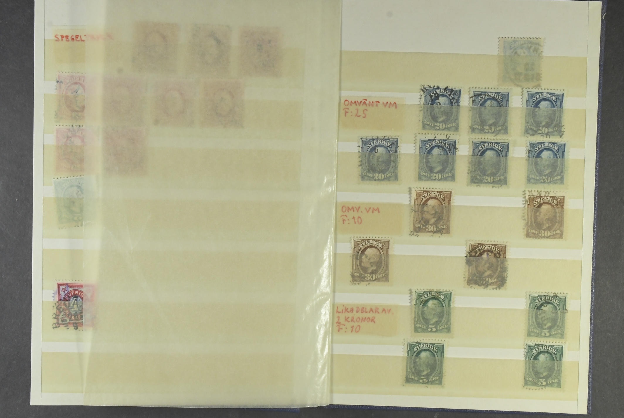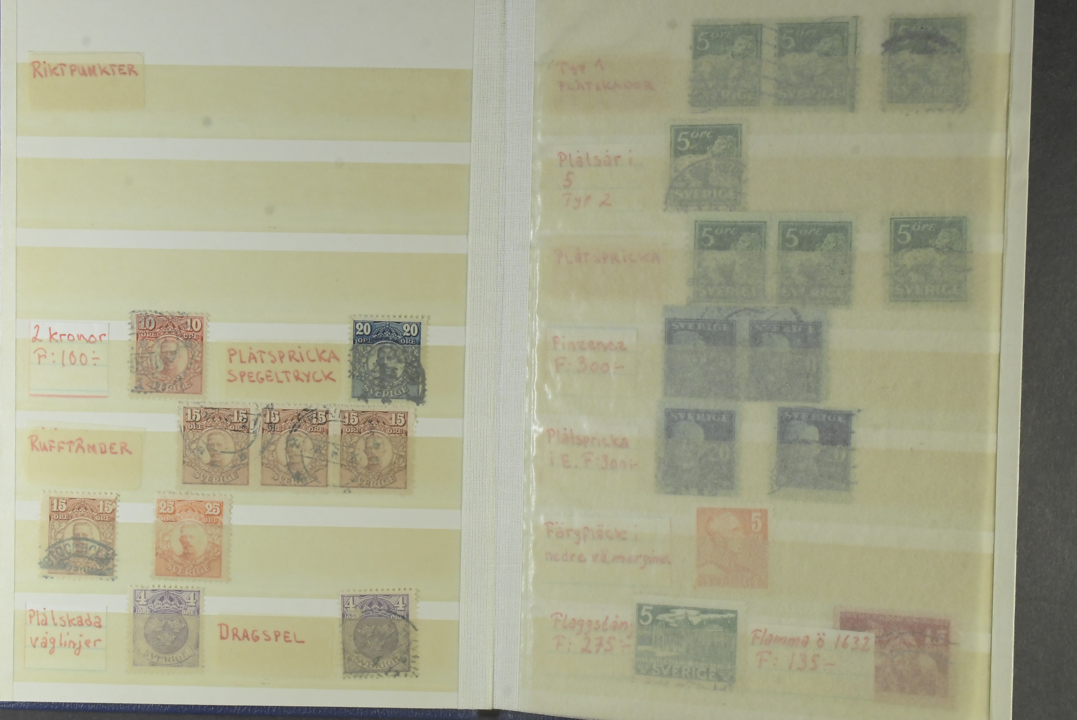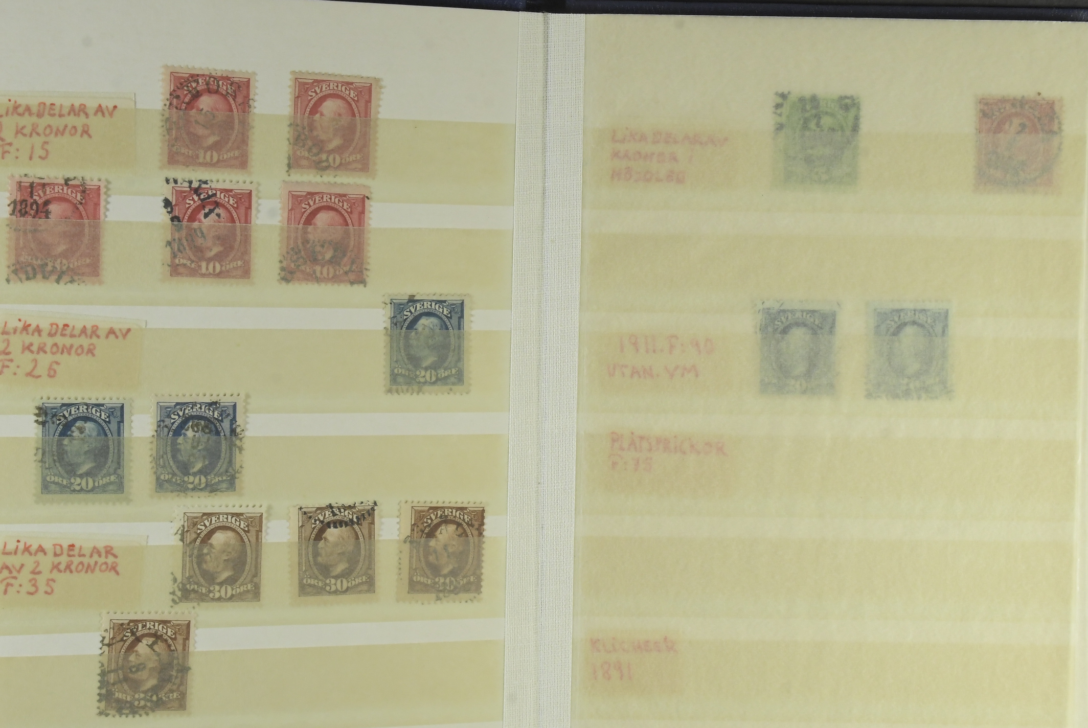 Sweden. Collection/accumulation used 1891–1939 in small stockbook. Varieties such as set off, inverted watermarks, parts of two watermarks, plate flaws, extremely off centering, etc. Somewhat mixed quality. (Approx. 100)