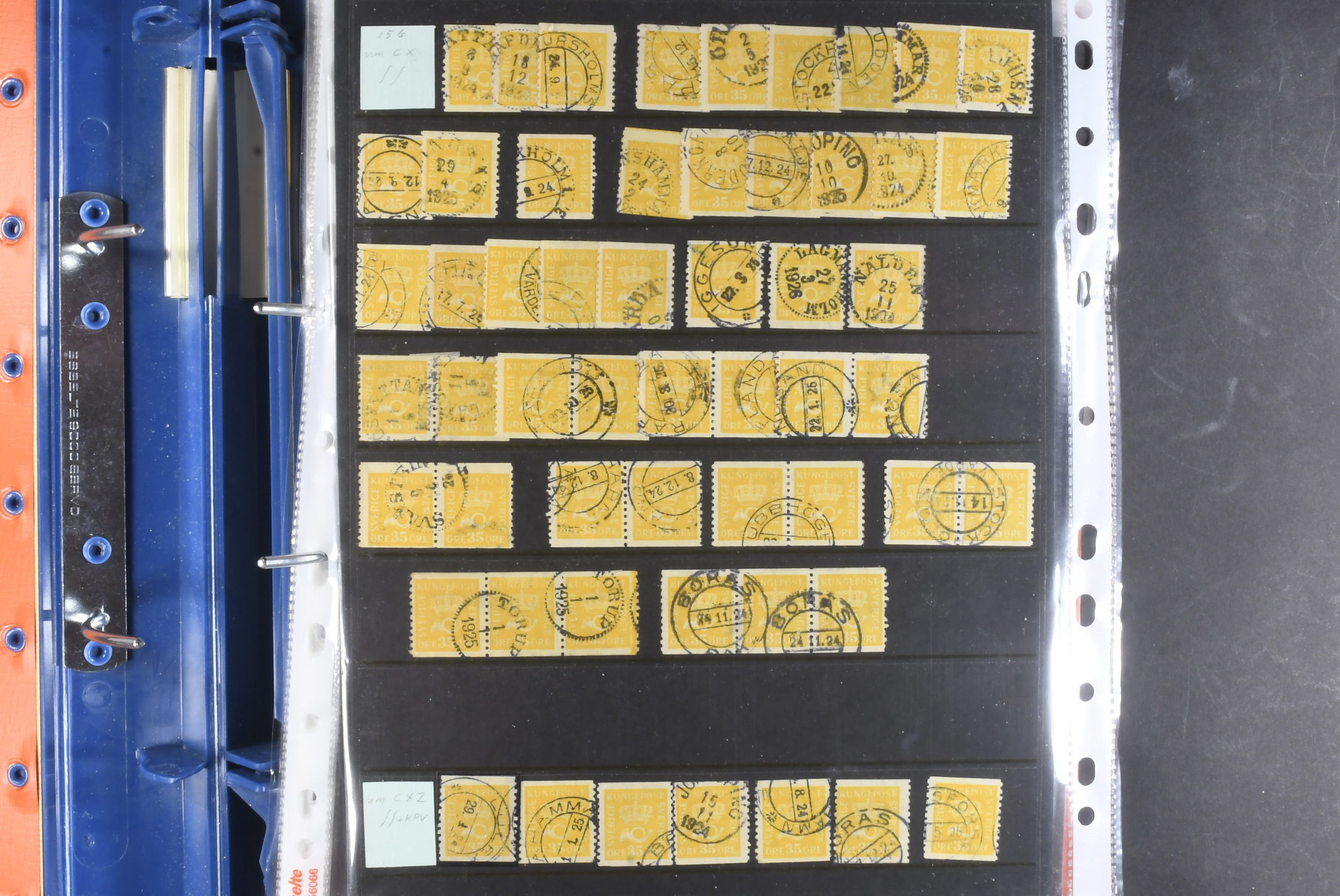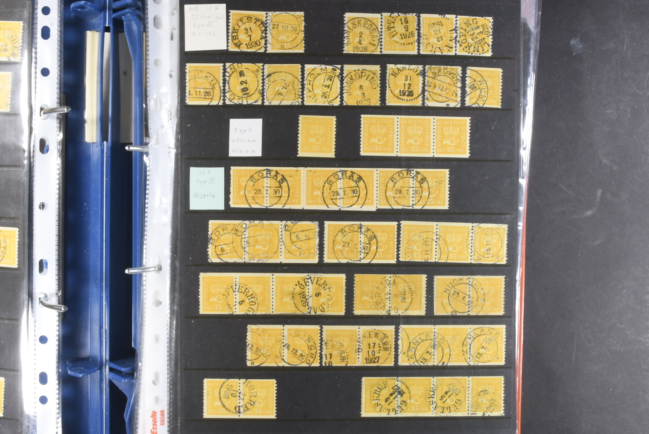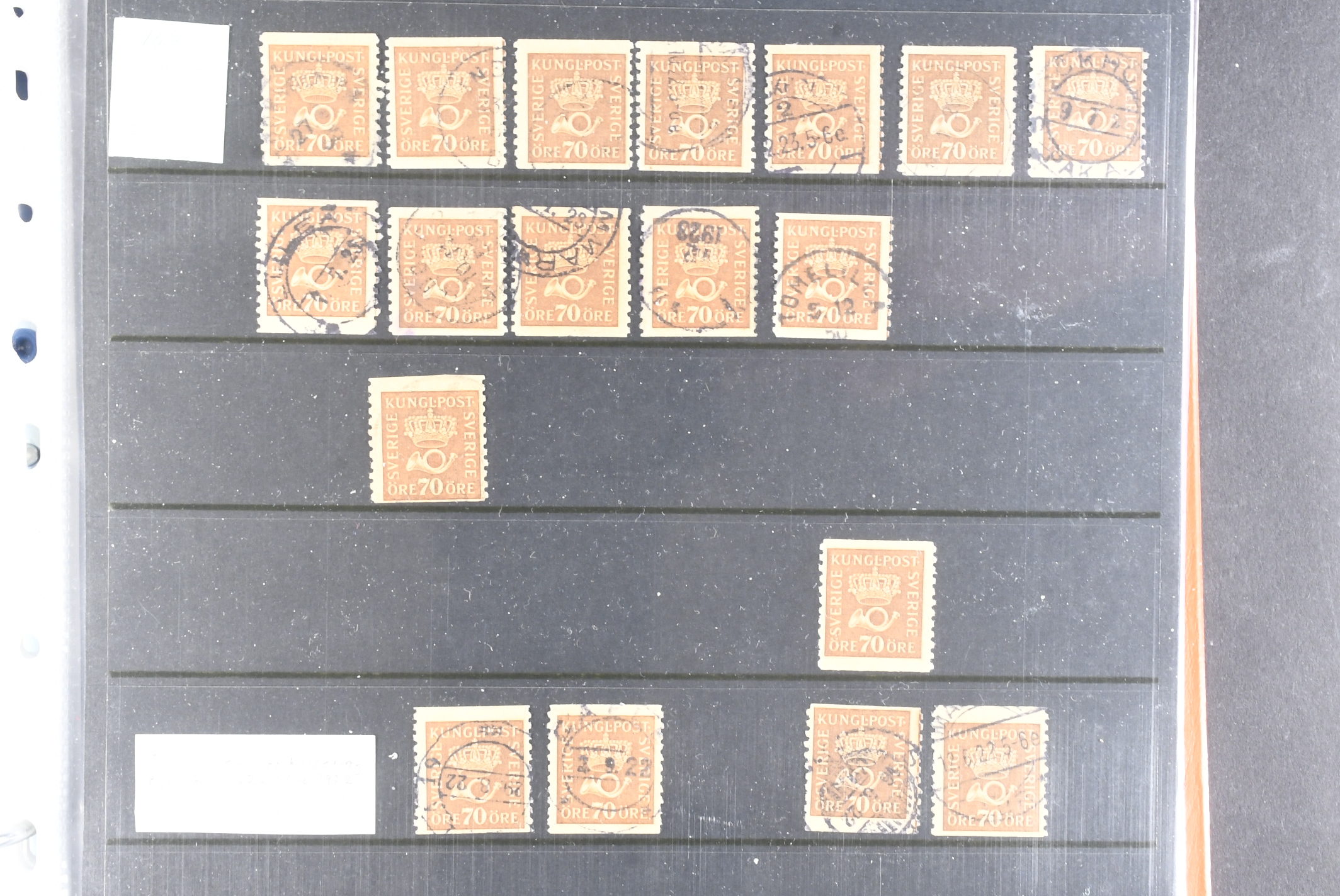 Sweden. Collection/accumulation ★★/⊙ 1920–1933 in album. Crown and Posthorn. Comprehensive material with different paper types, watermarks, printing errors, etc. Single stamps, pairs and strips up to five stamps, both MNH and used. A number of better cancellations observed. Please see a selection of scans at www.philea.se. Fine quality. (>1000)