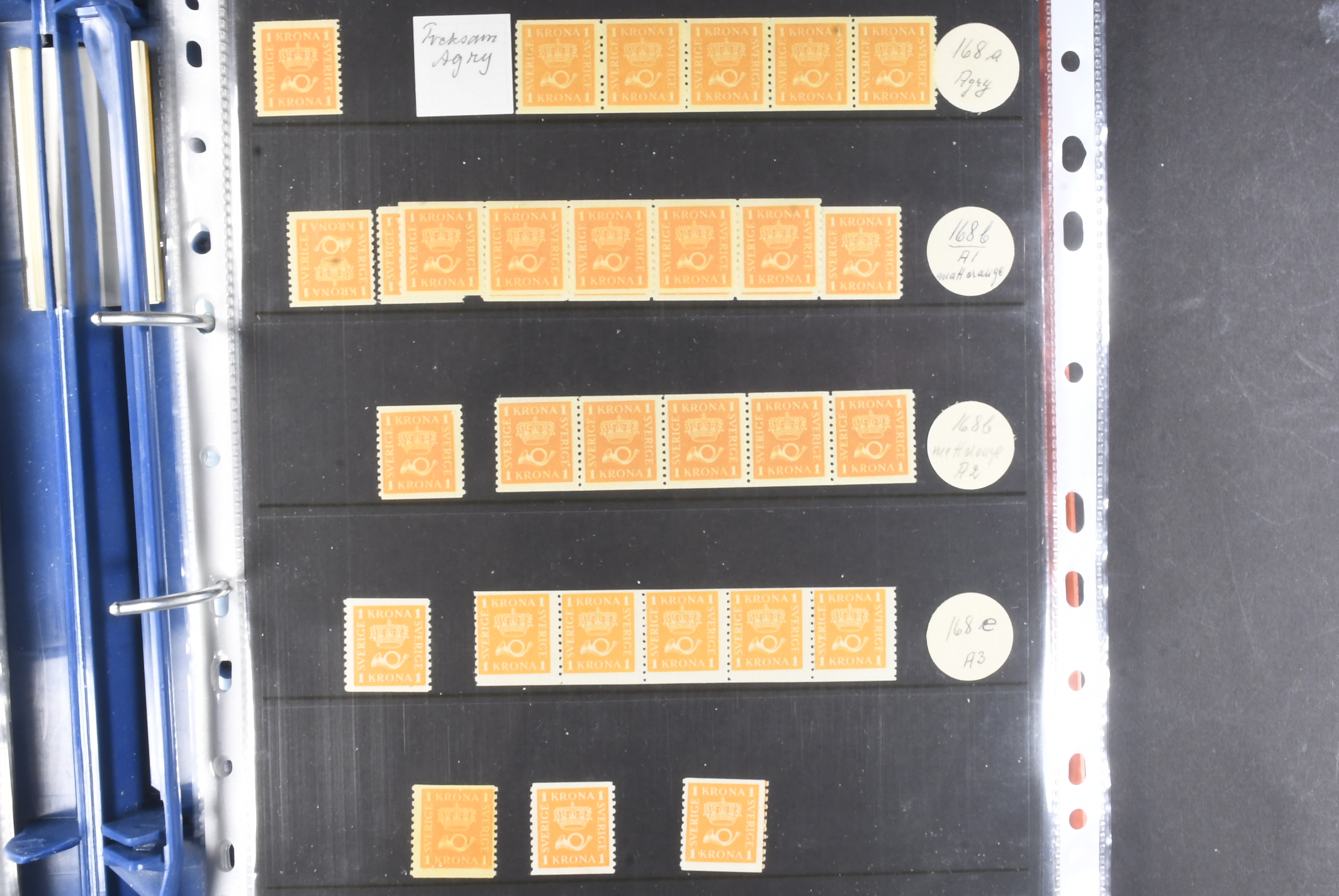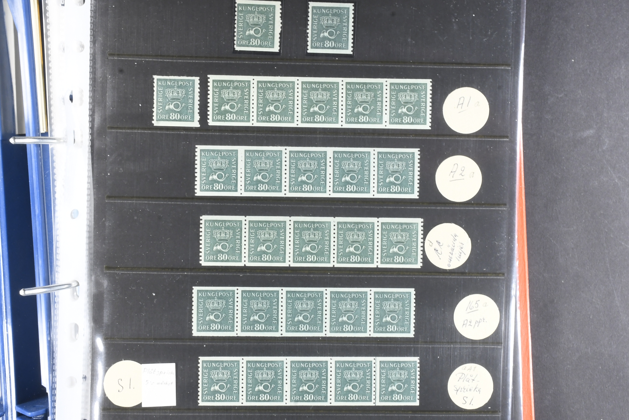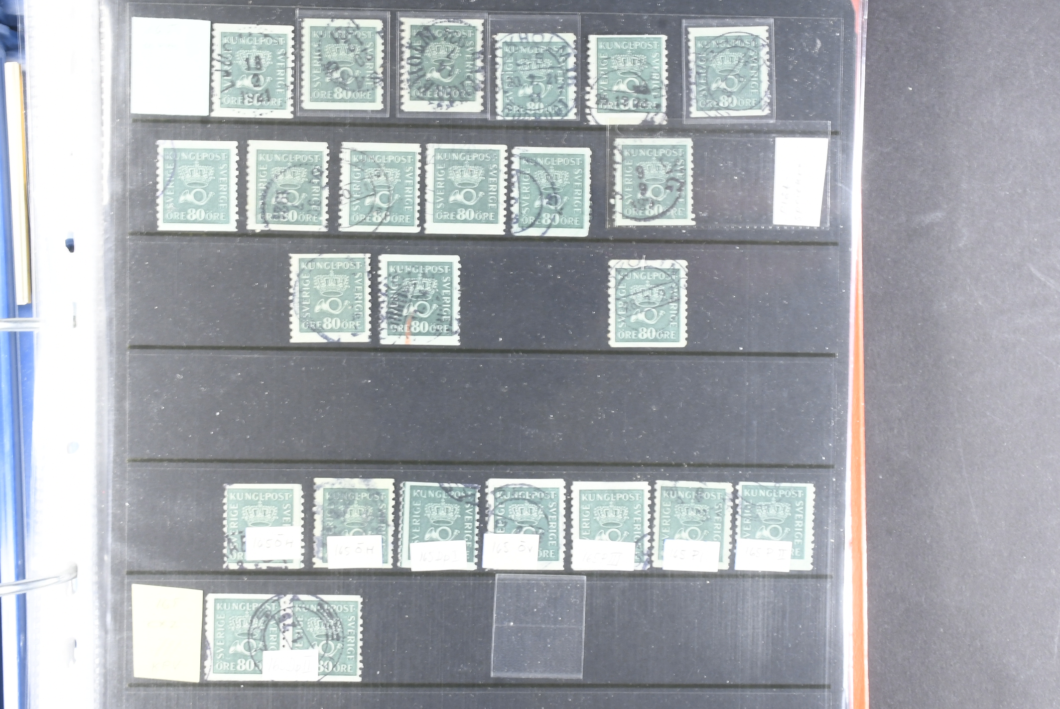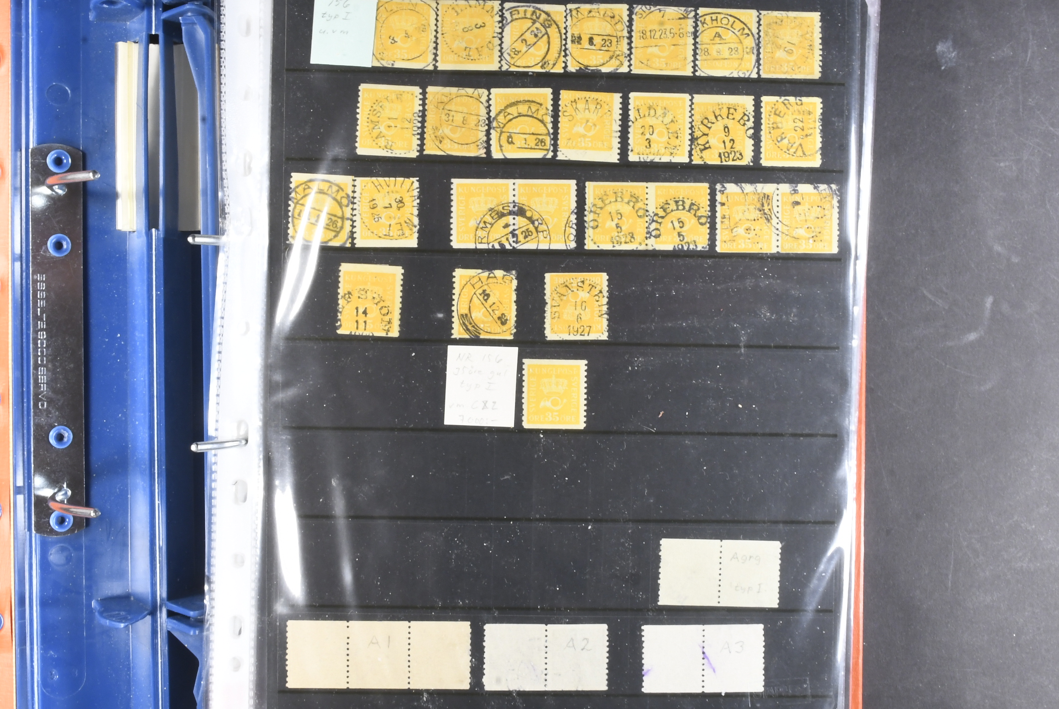 Sweden. Collection/accumulation ★★/⊙ 1920–1933 in album. Crown and Posthorn. Comprehensive material with different paper types, watermarks, printing errors, etc. Single stamps, pairs and strips up to five stamps, both MNH and used. A number of better cancellations observed. Please see a selection of scans at www.philea.se. Fine quality. (>1000)