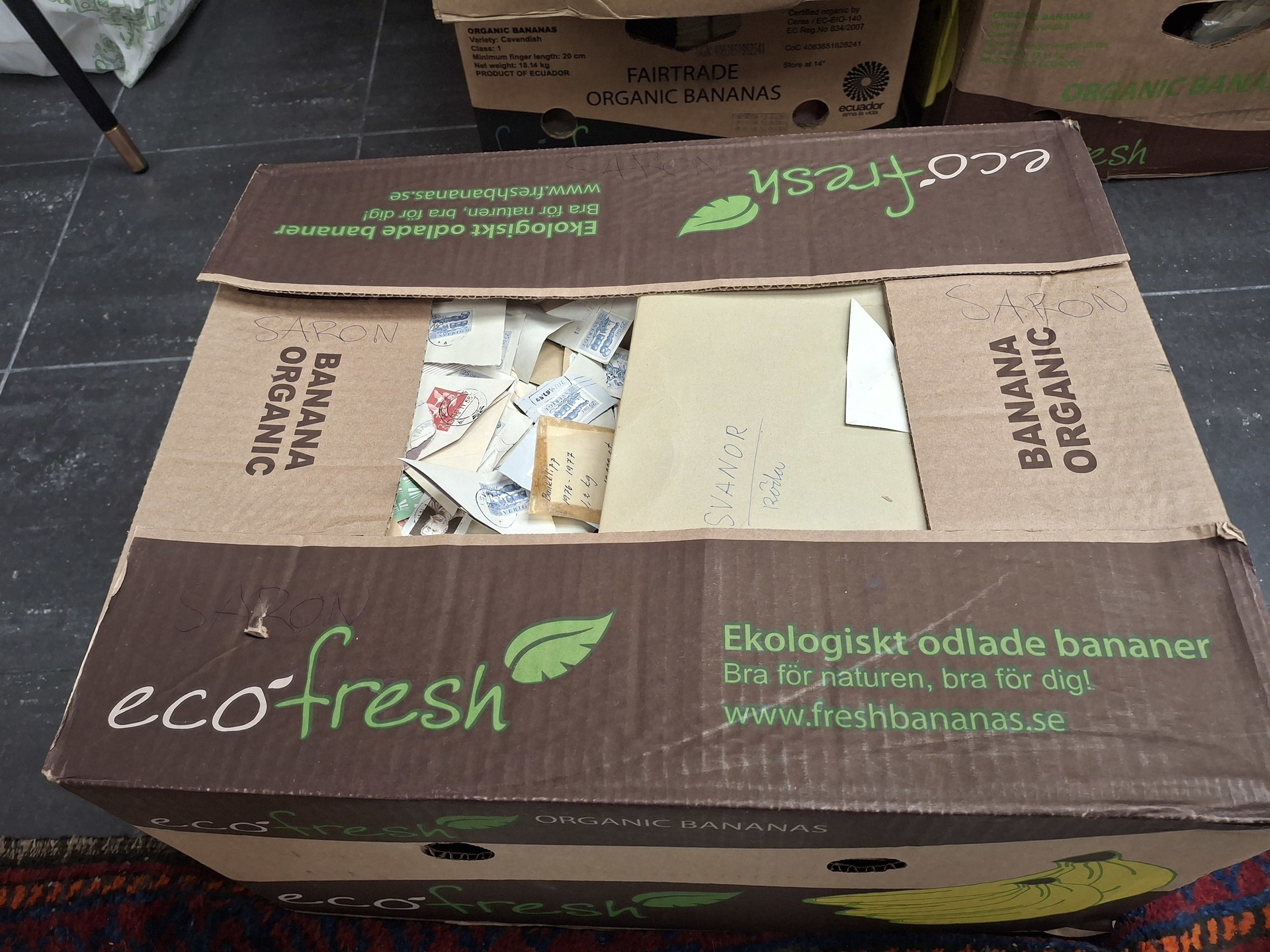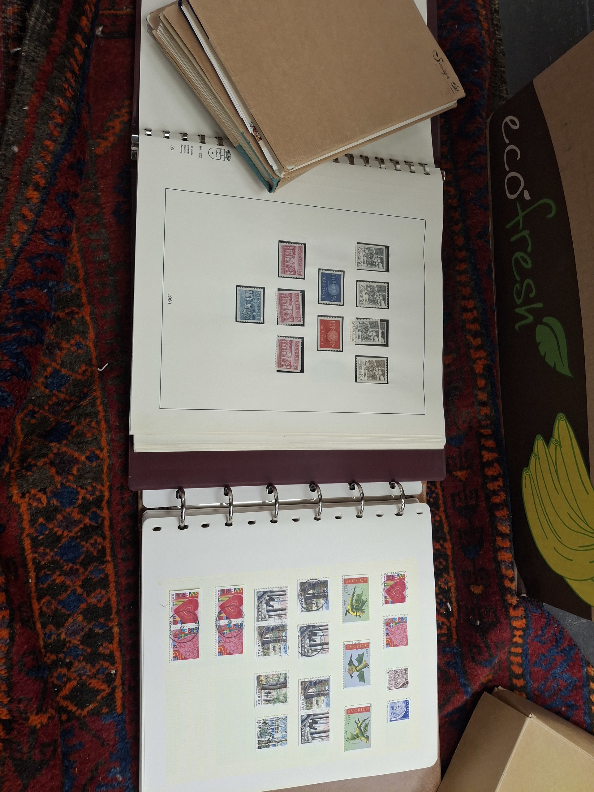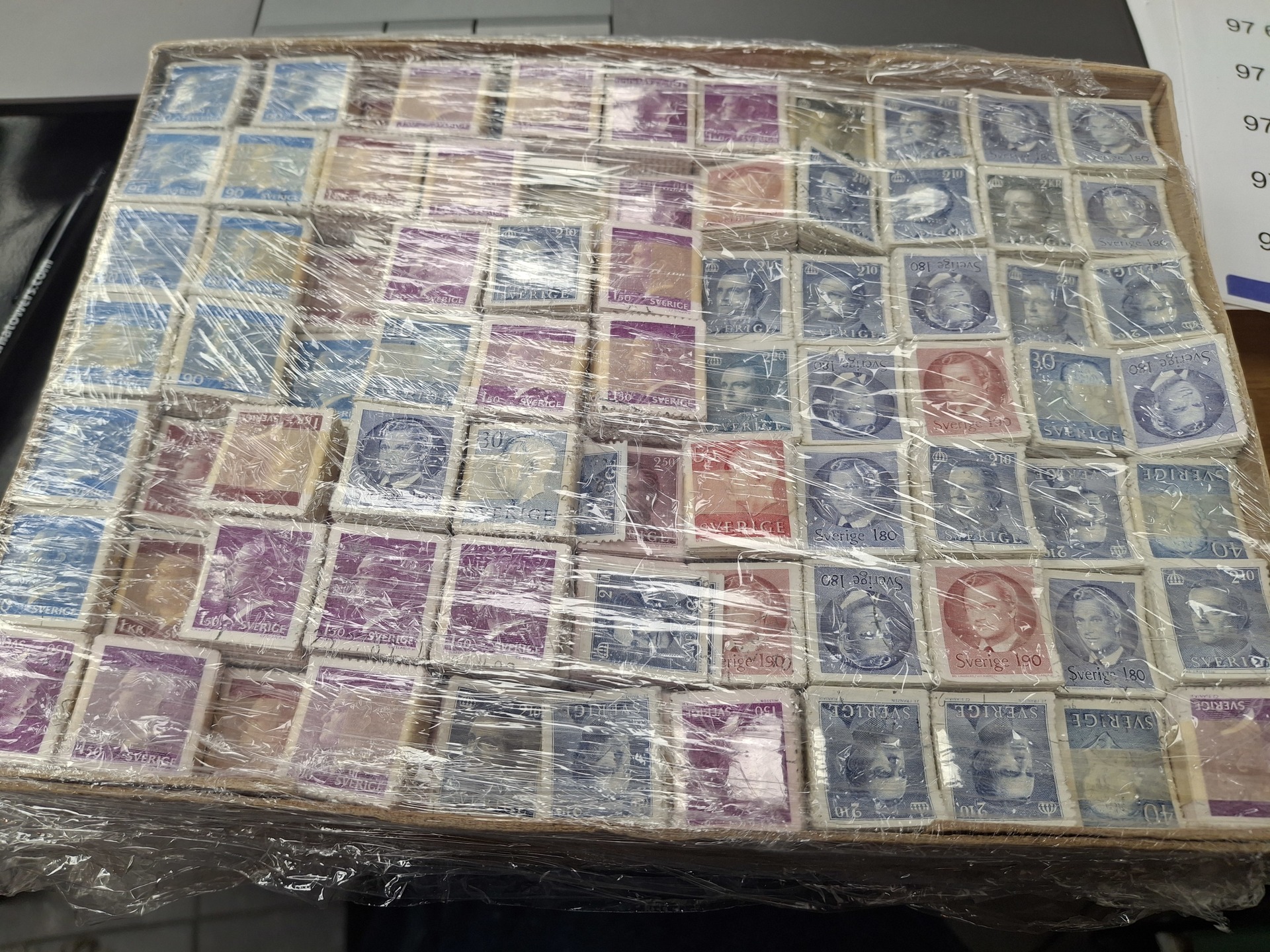 Sweden. Accumulation ★★/★/⊙ 1858–2000s in banana box. First box contains several remaining collections **/*/o. A pack of remainder approval booklets. One box of bundles 1970s–1980s. Second box is full of cuts 1950–1970s. Approx. 20 kg. (1000s)