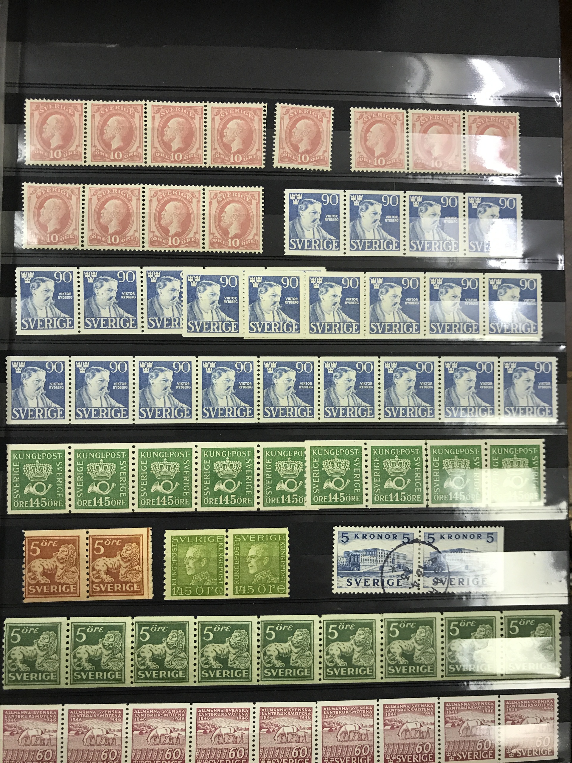 Sweden. ★★/⊙. Box with e.g. stamps in bundles, many ** strips incl. eleven F45 and nine F174, etc. Also some coins, etc.