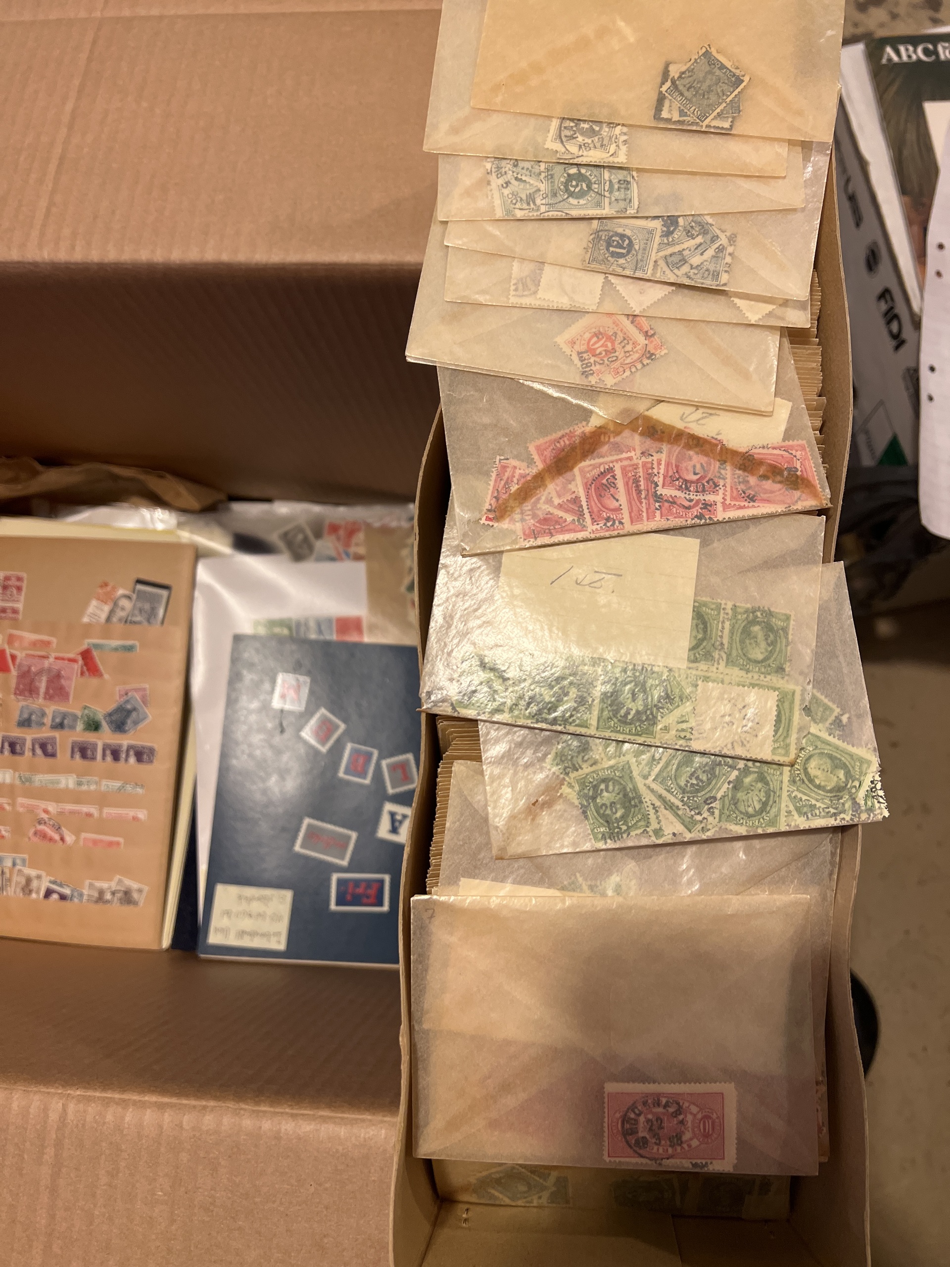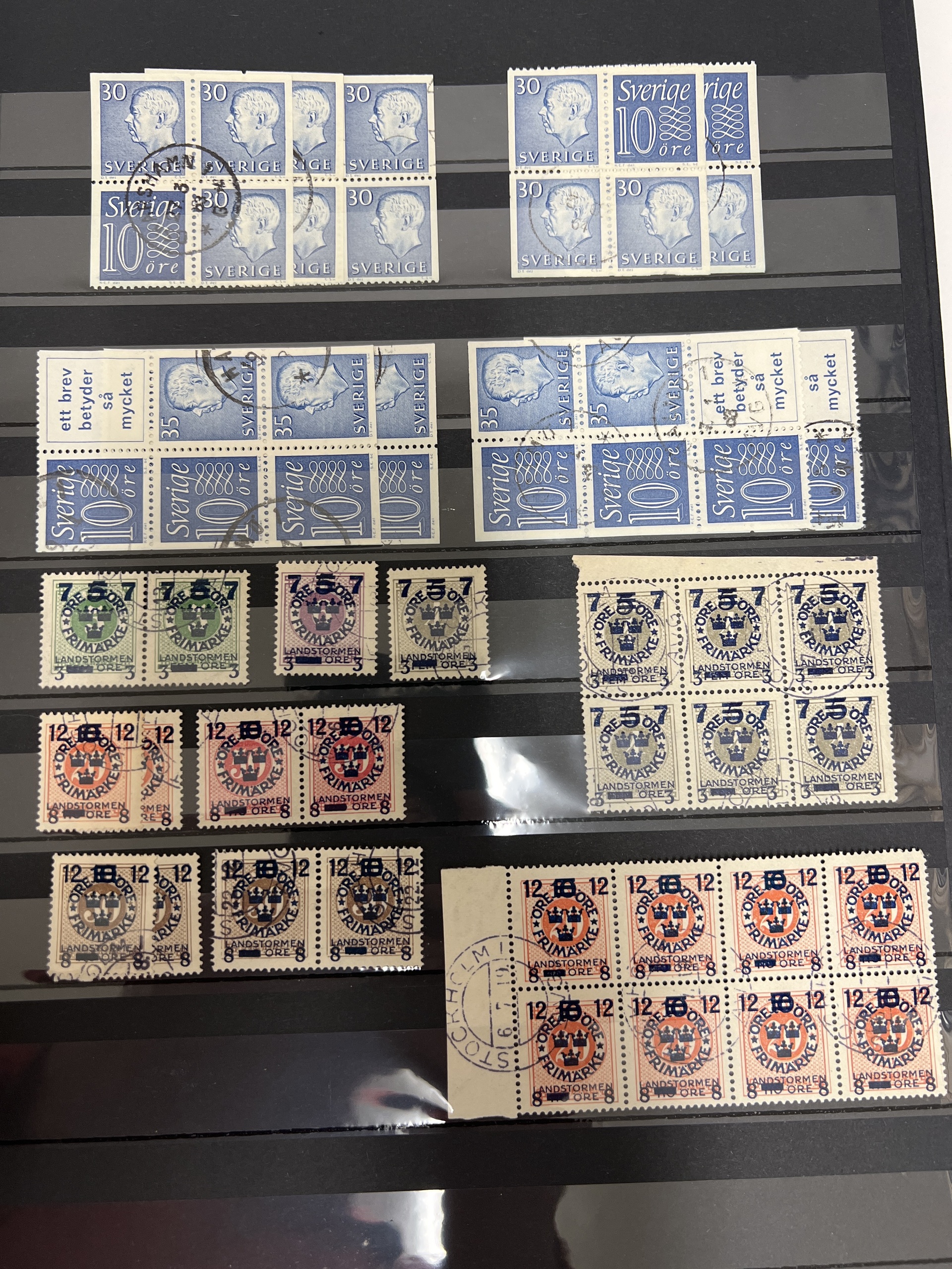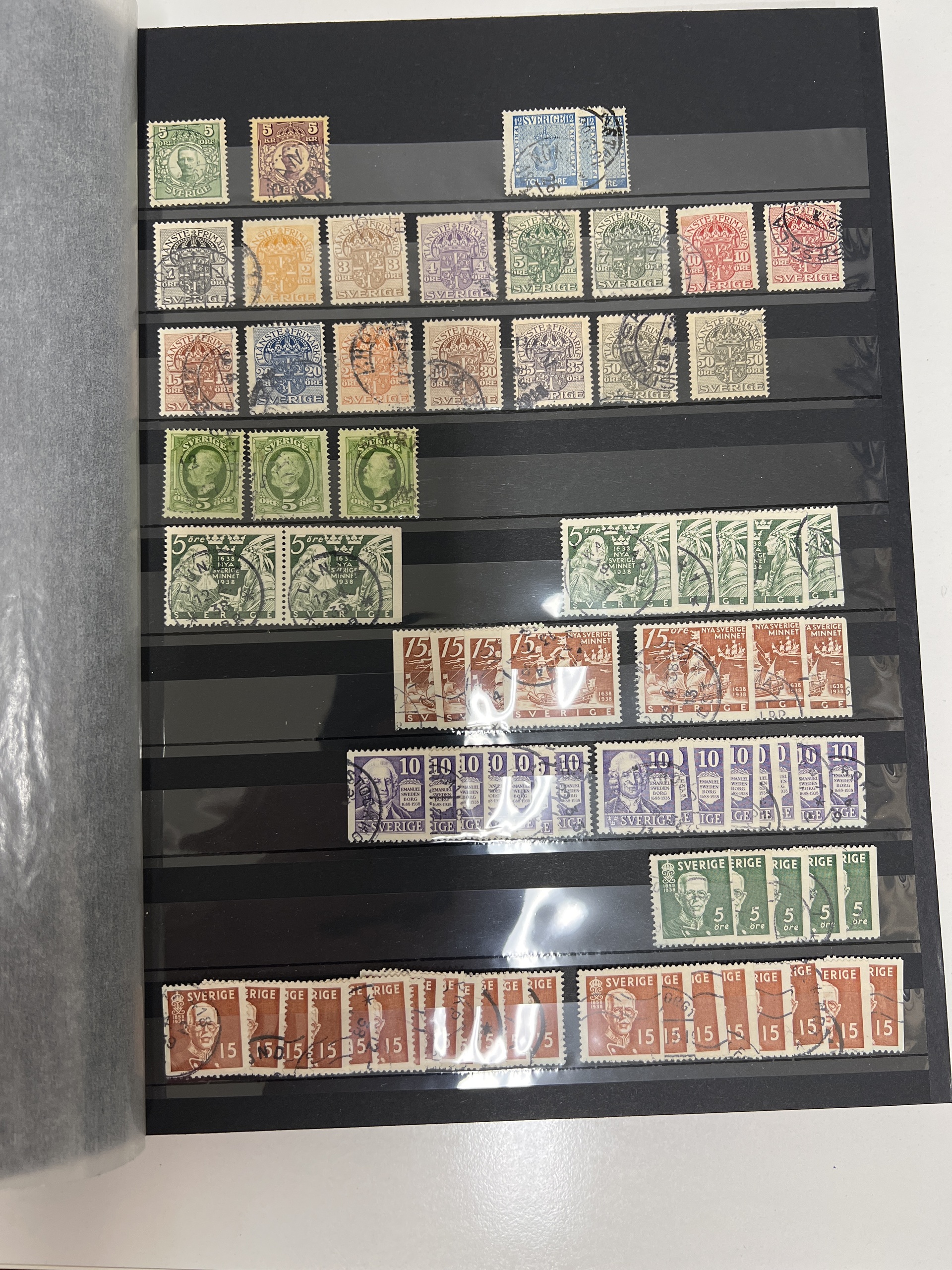Sweden. Sweden **/*/¤ accumulation 1900–2010s in removal box (1000s). Mostly Sweden, with boxes, cover albums, both used, mint/hinged, BC/CB paars, series from around 1920s up to 1950s both used and mint. File index in glassine envelopes starting 12 öre coat of arms up 1960s. Please inspect, chance for cancellations. Some face value Sweden. Also some Nordic material and one album Germany, Austria, Hungary.