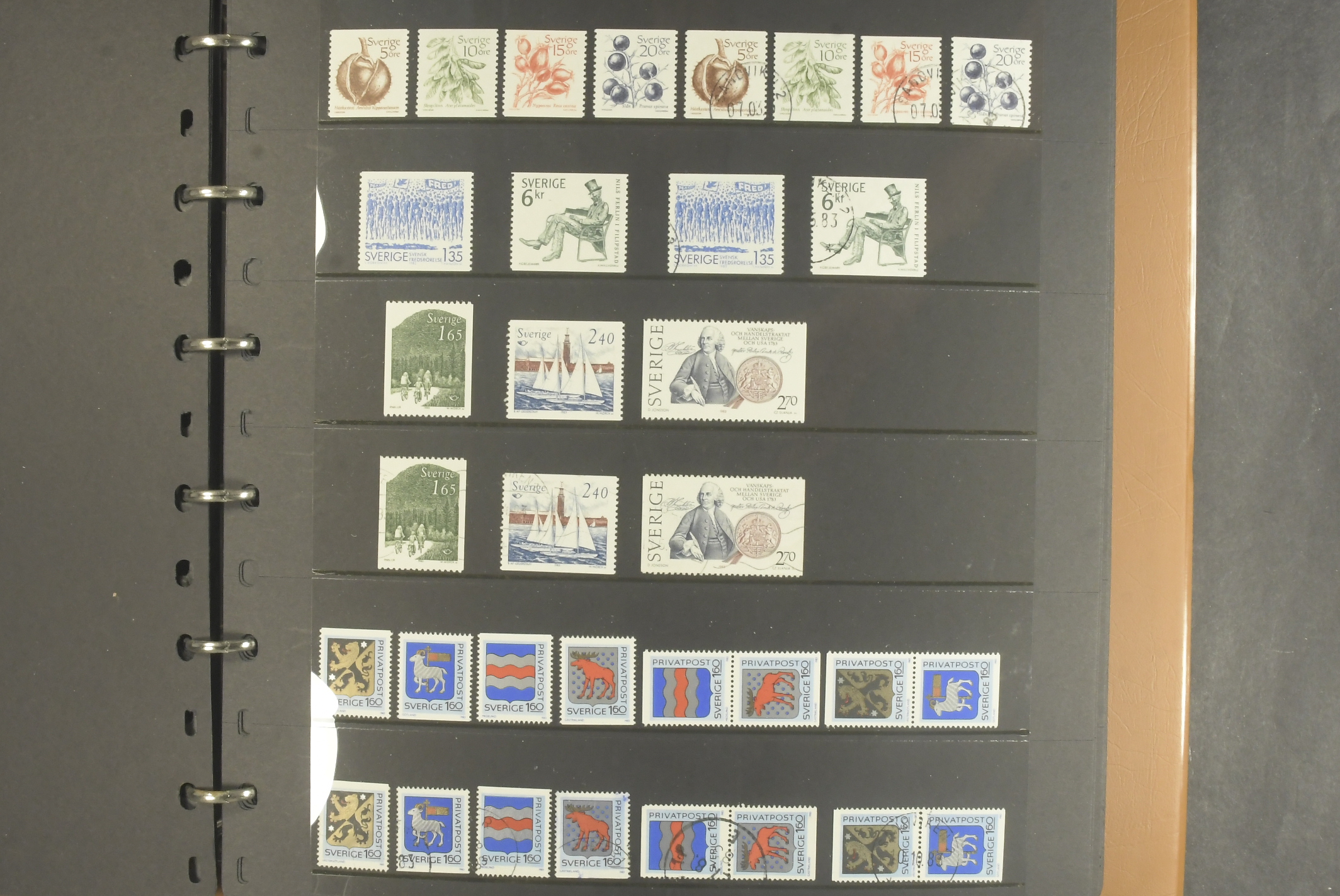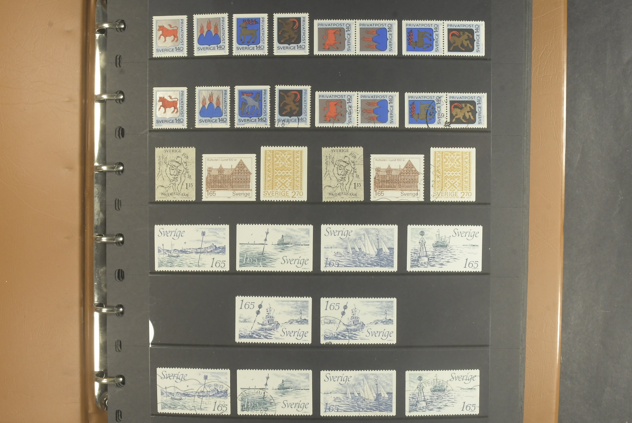 Sweden. Collection/accumulation ★★/★/⊙ 1967–1987 in two albums. Almost complete material (1967–1974 and 1982–1987) in two set-ups – one MNH (can be used as franking) and one used. Includes dscount stamps. Fine quality. (>1500)