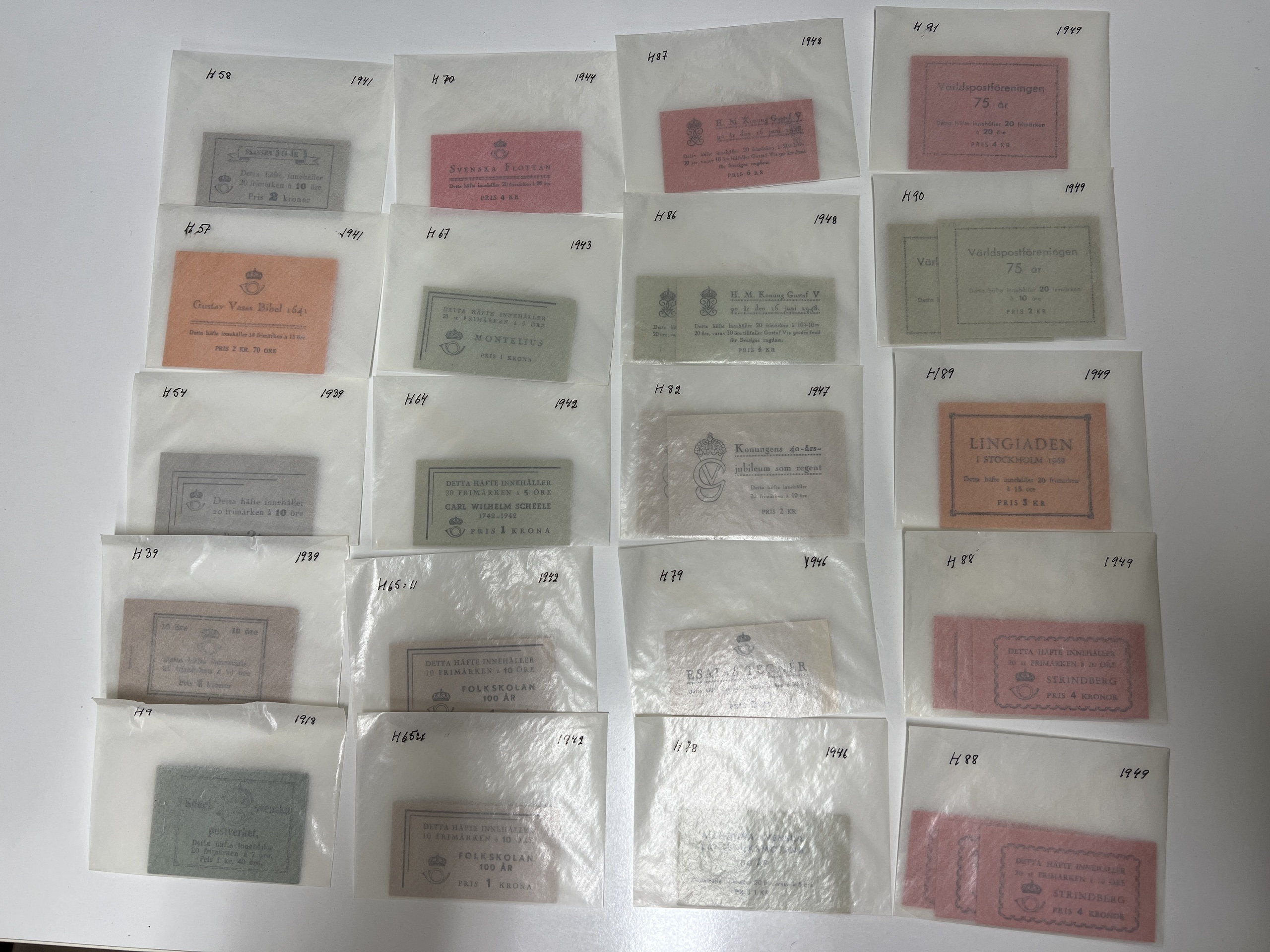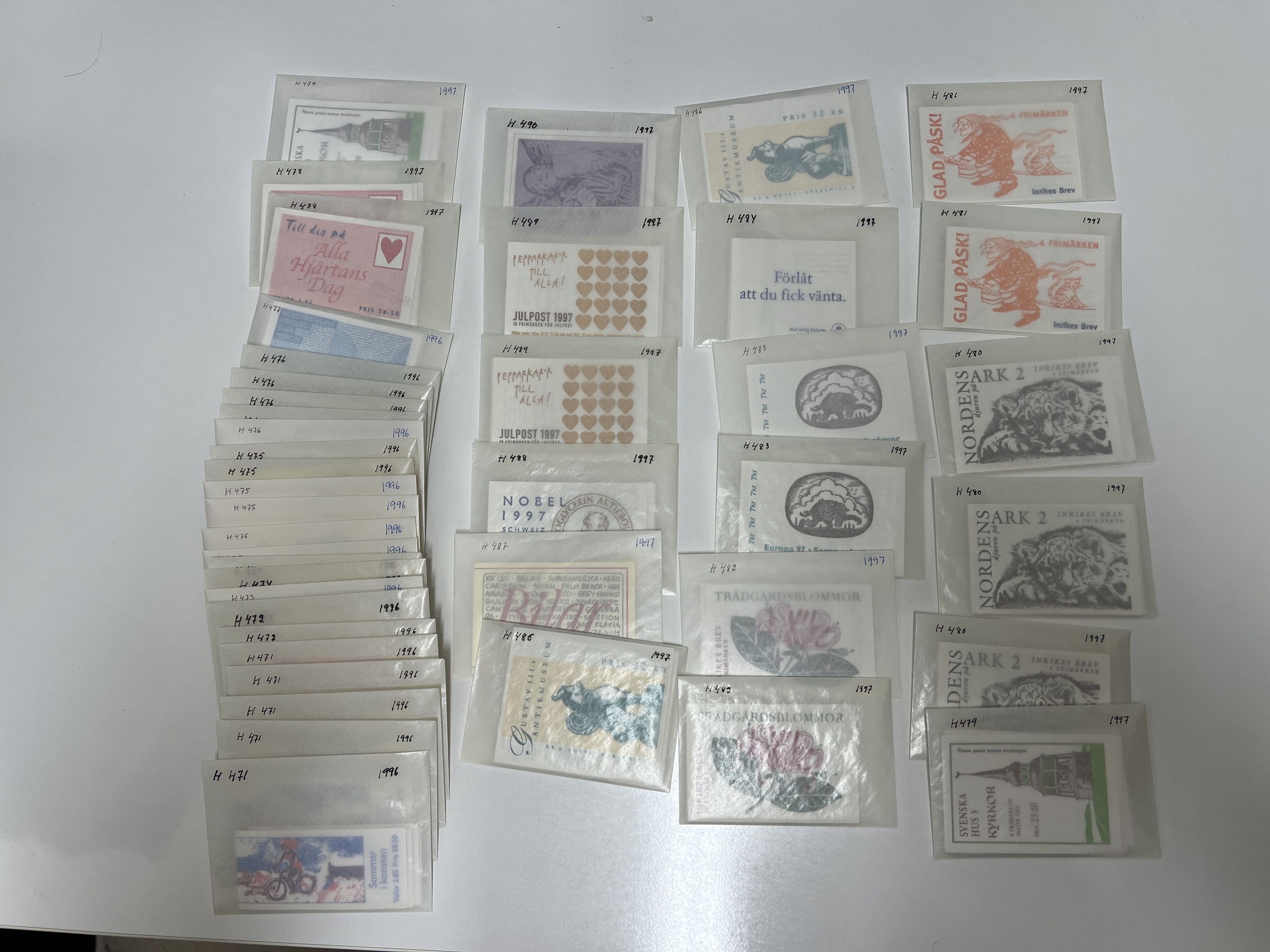 Sweden. Sweden Booklets collection 1918-1997 in glacine envelopes in 3 arcive boxes. Not so many in the beginning, but a few better like H57, 58, 70 is included. Many booklets are duplicated from 1970s-97. Facevalue counted from 1992-97 and is around 22000 kr, including 220 Sverige Brev and 80 Christmaststamps(17 kr). Face Value before 1992 not counted, but should be many thousands. Possibility for markings. Excellent quality (1000s)